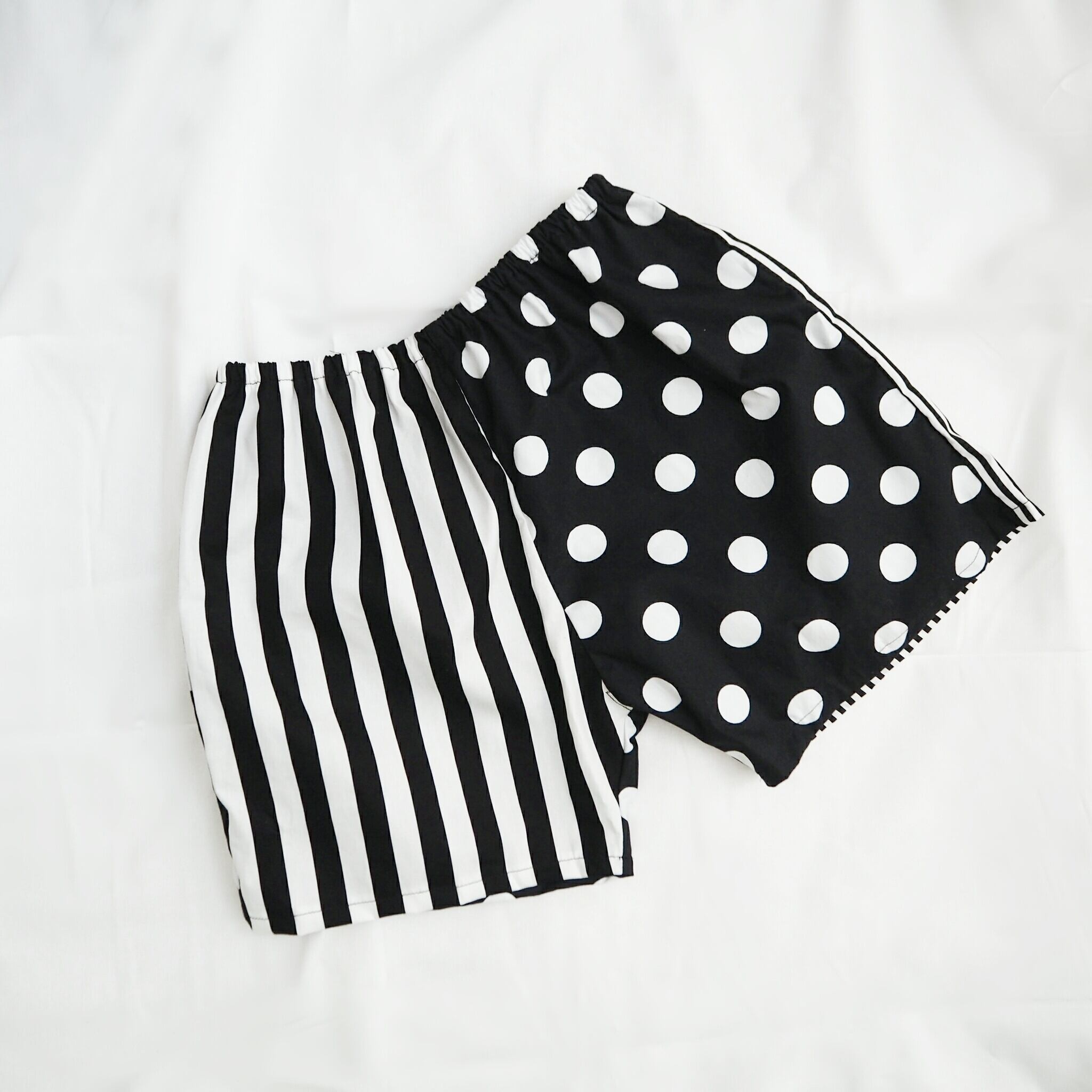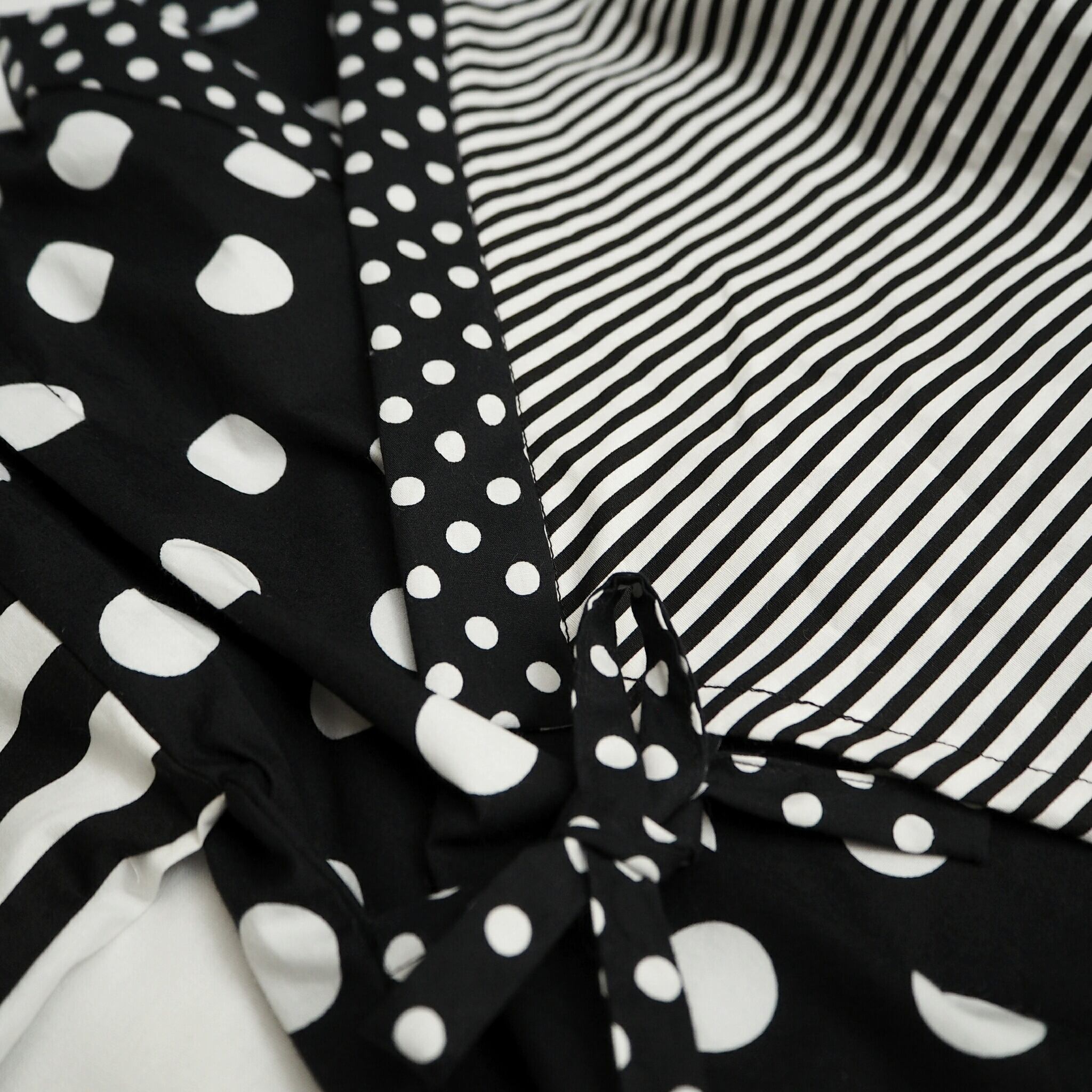 モノトーンの水玉とストライプボーダー組み合わせで作った、シンプルながらも個性的な印象を与えてくれる子供用の浴衣(甚平)です。