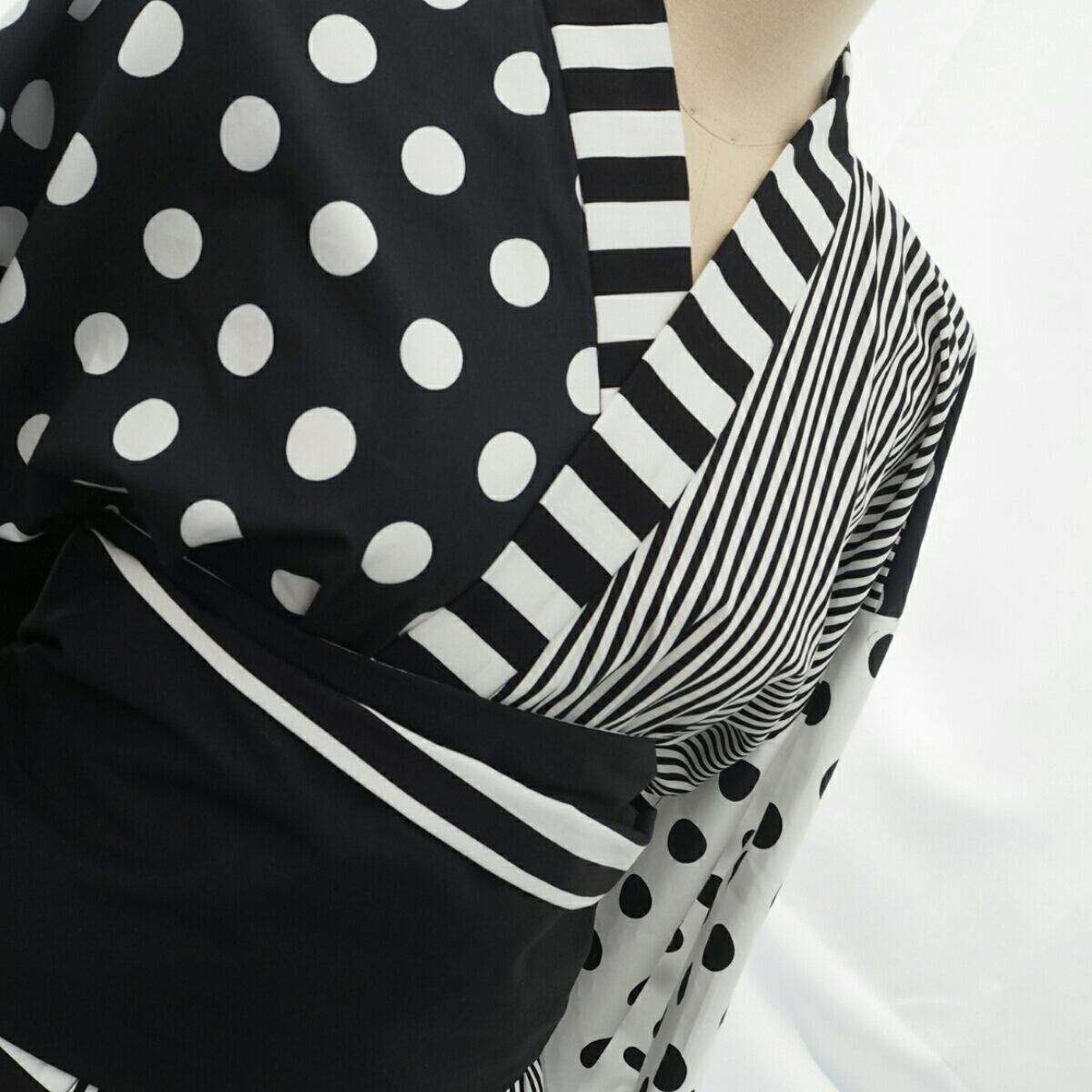 モノトーンのドット、ボーダー、ストライプ生地を組み合わせて作った浴衣です。
