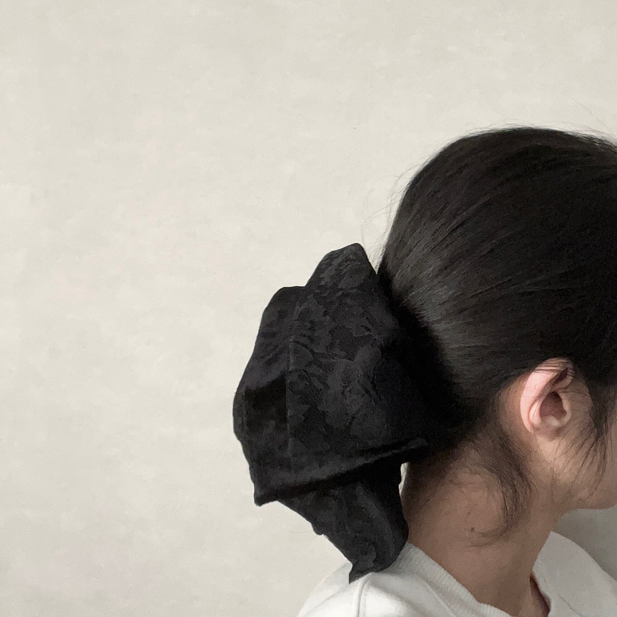 定番の丸いシュシュとは異なり、可愛さ控えめの少し落ち着いた雰囲気を演出できる正方形のシュシュです。