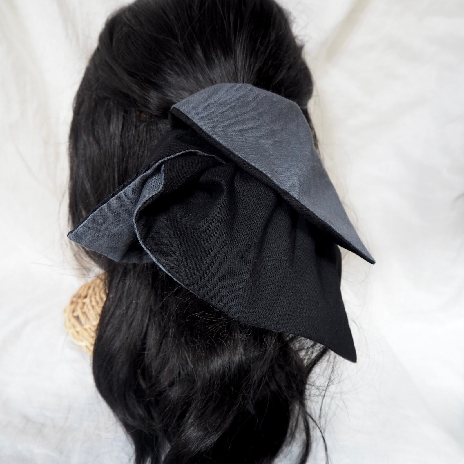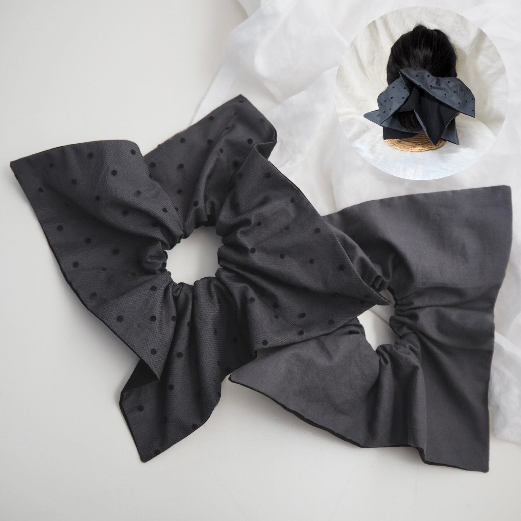 定番の丸いシュシュとは異なり、可愛さ控えめの少し落ち着いた雰囲気を演出できる正方形のシュシュです。
