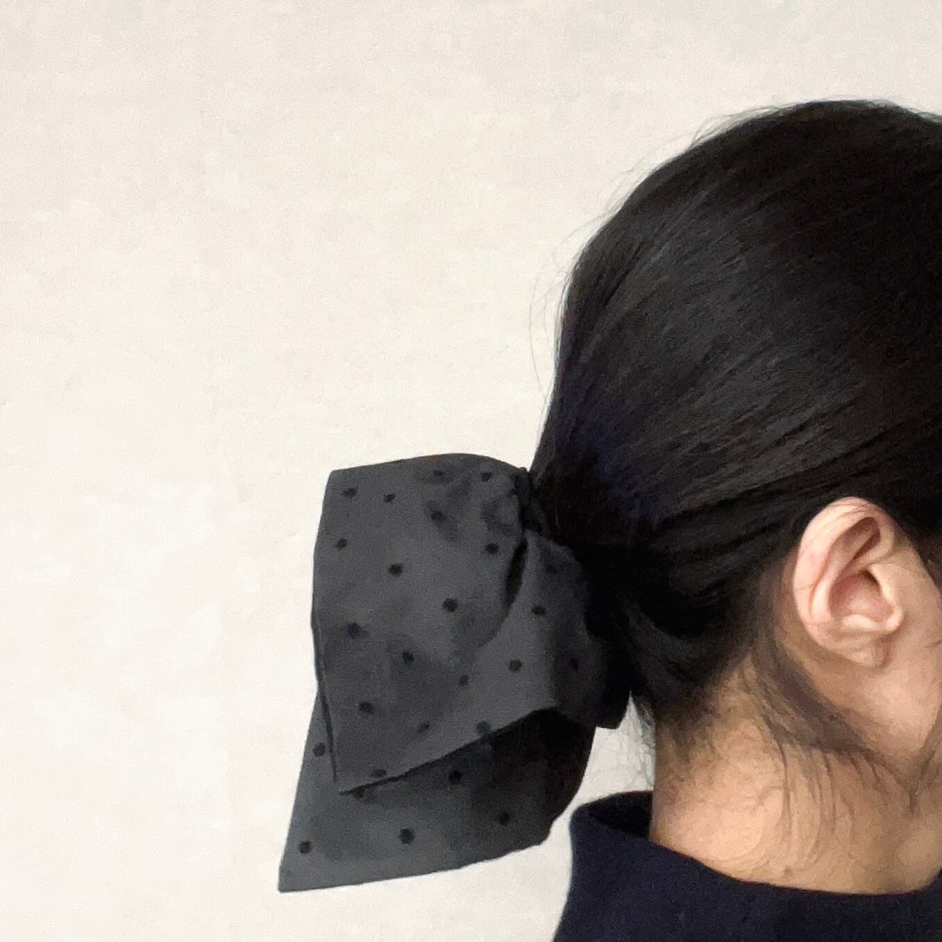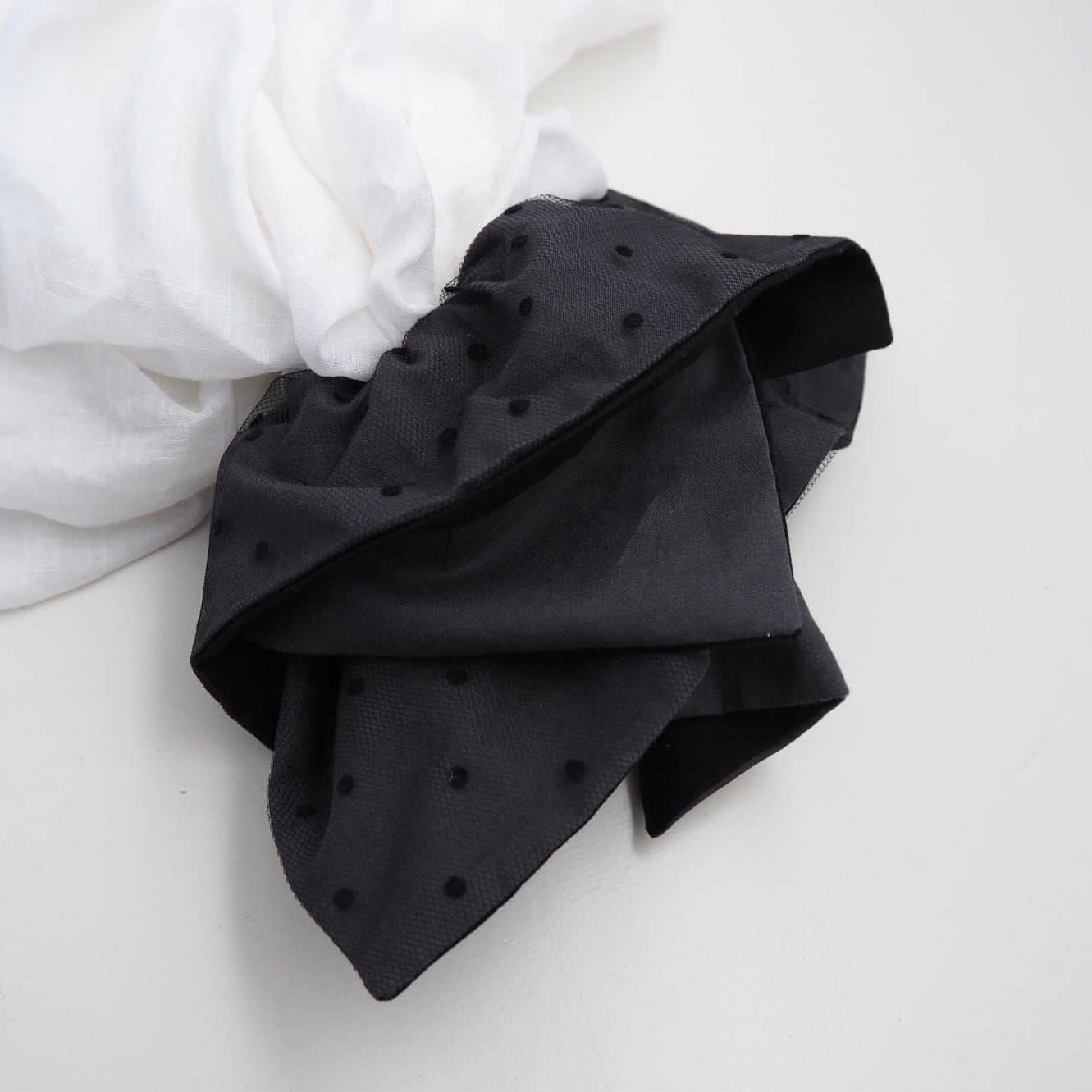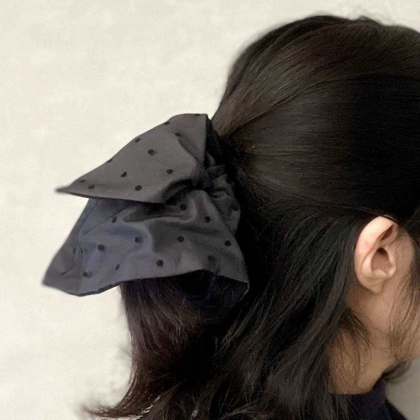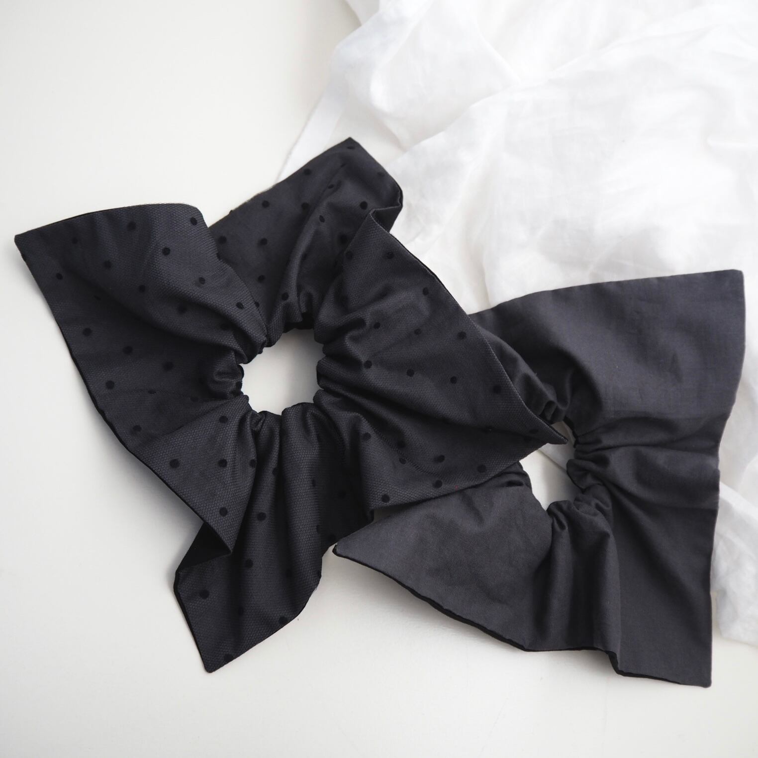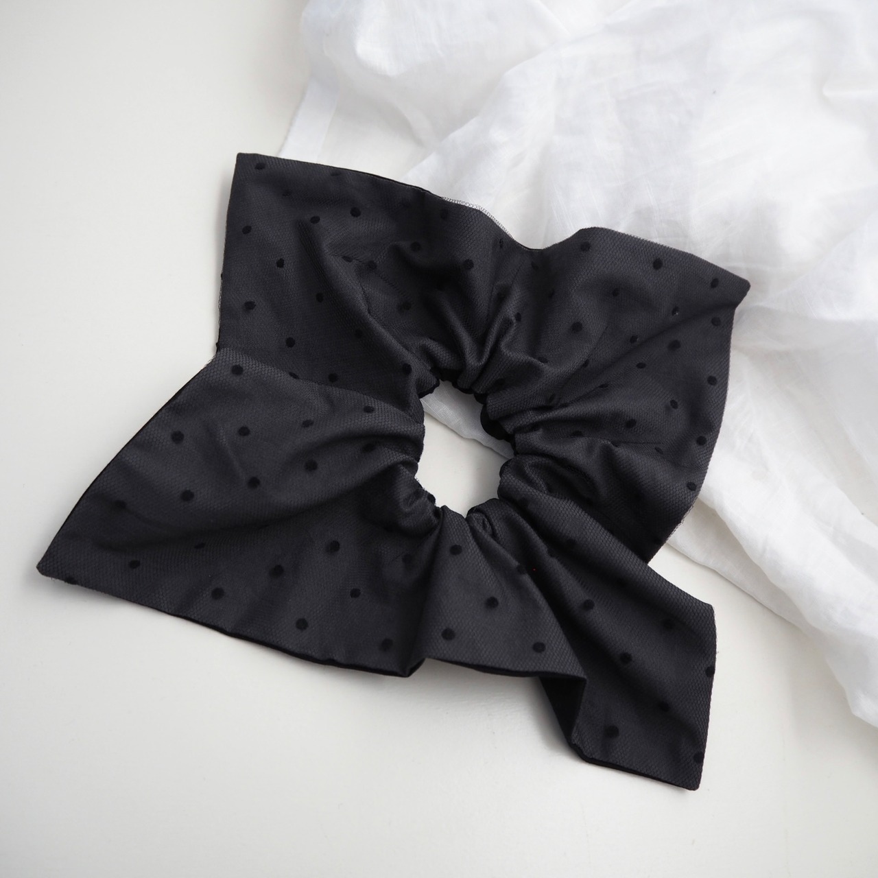 定番の丸いシュシュとは異なり、可愛さ控えめの少し落ち着いた雰囲気を演出できる正方形のシュシュです。