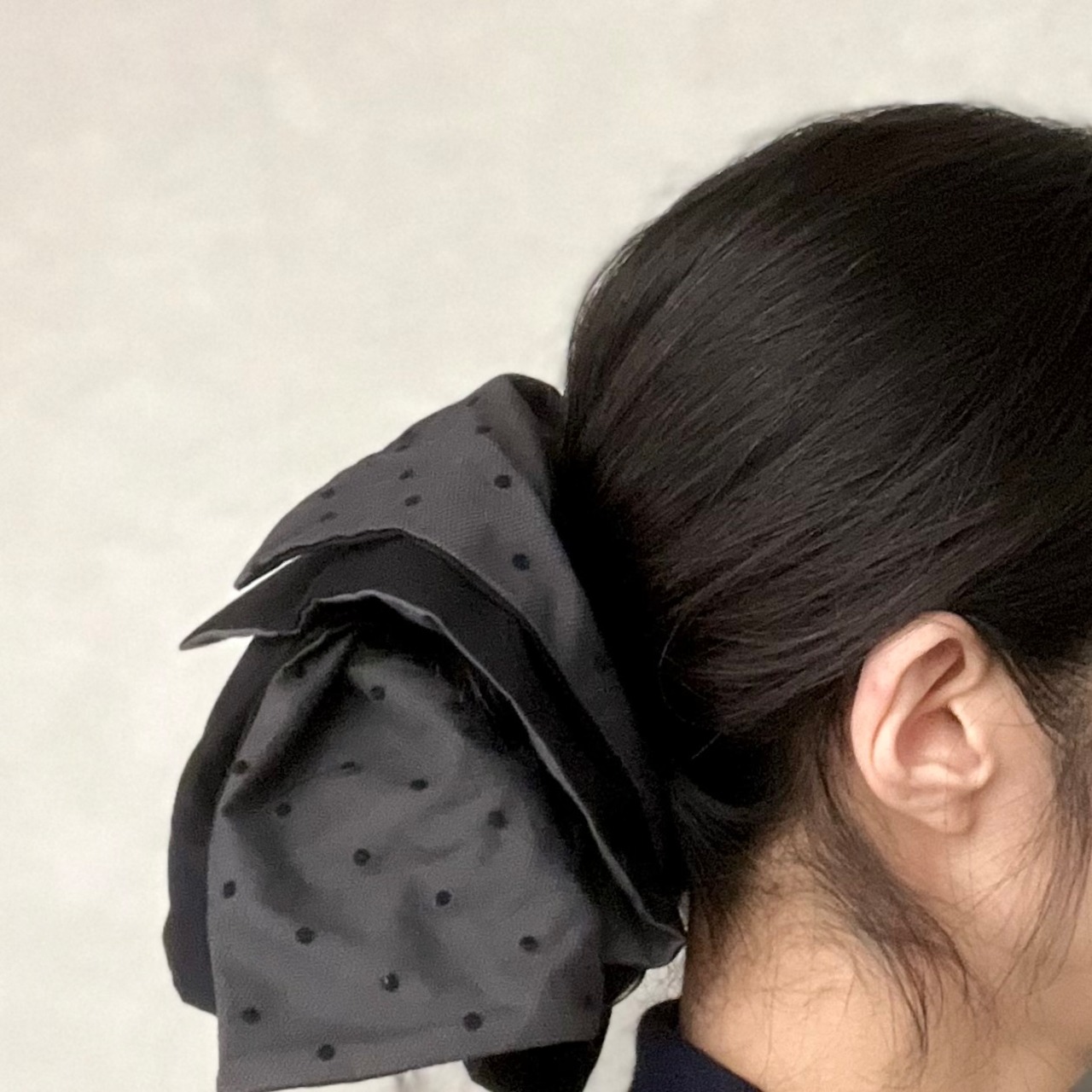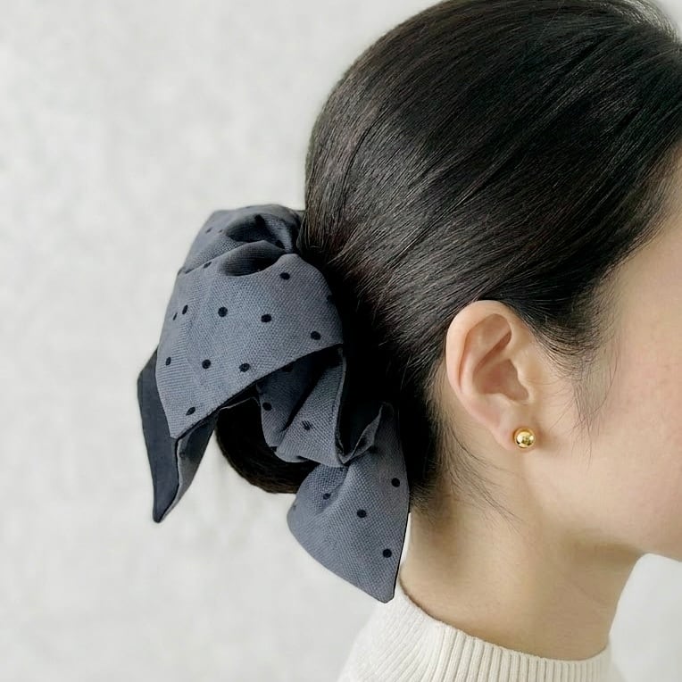 定番の丸いシュシュとは異なり、可愛さ控えめの少し落ち着いた雰囲気を演出できる正方形のシュシュです。