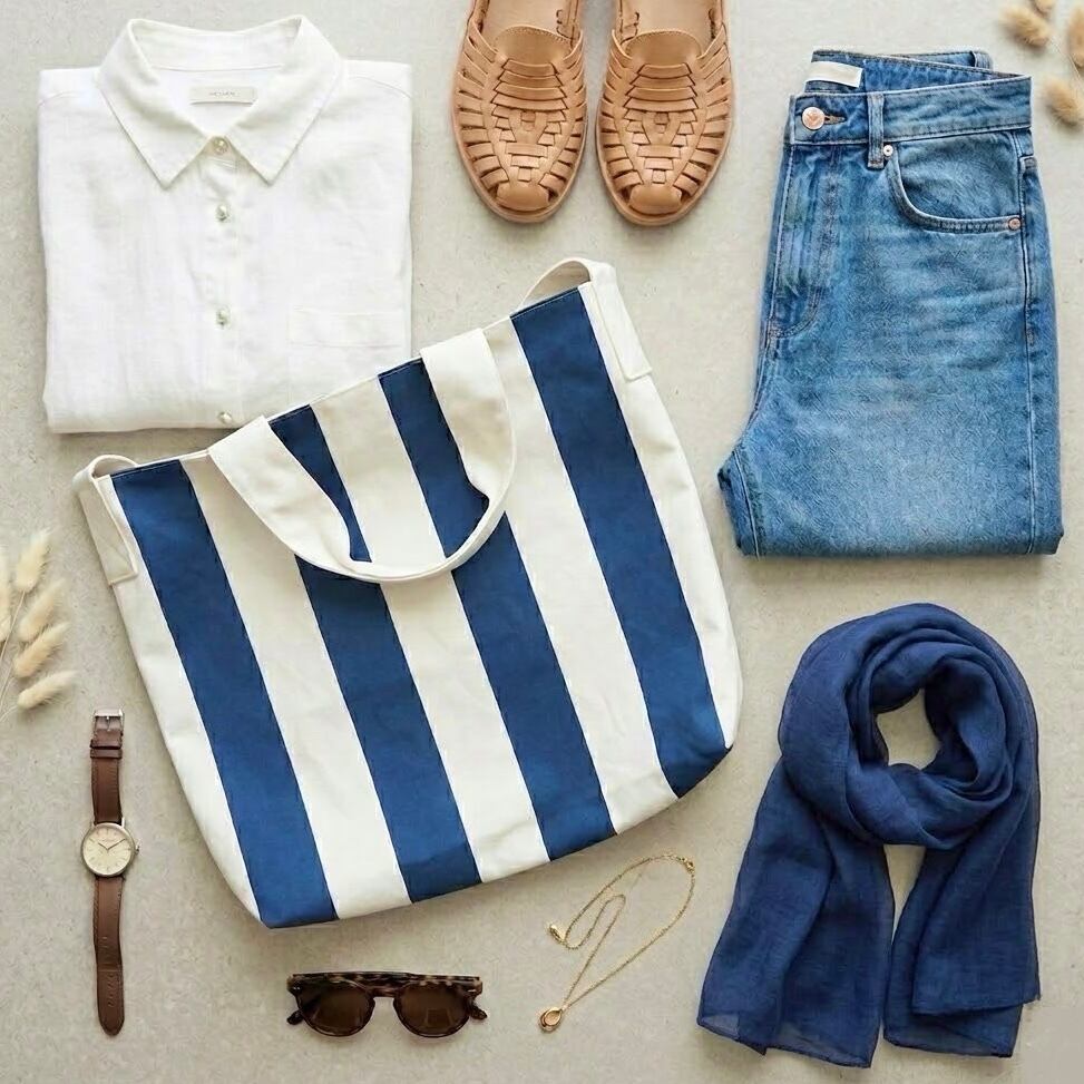 ブルーの太いボーダーが目を引く大きめなトートバッグです。