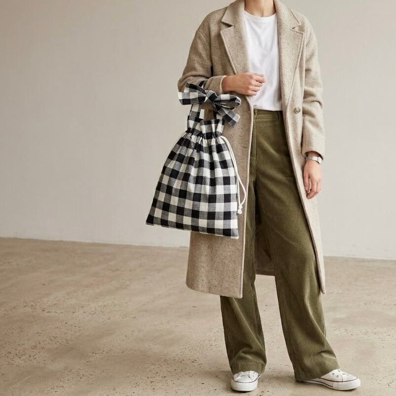 モノトーンのブロックチェック柄が可愛い、少し目の粗いざっくり柔らかめの生地を使用したリボンバッグです。