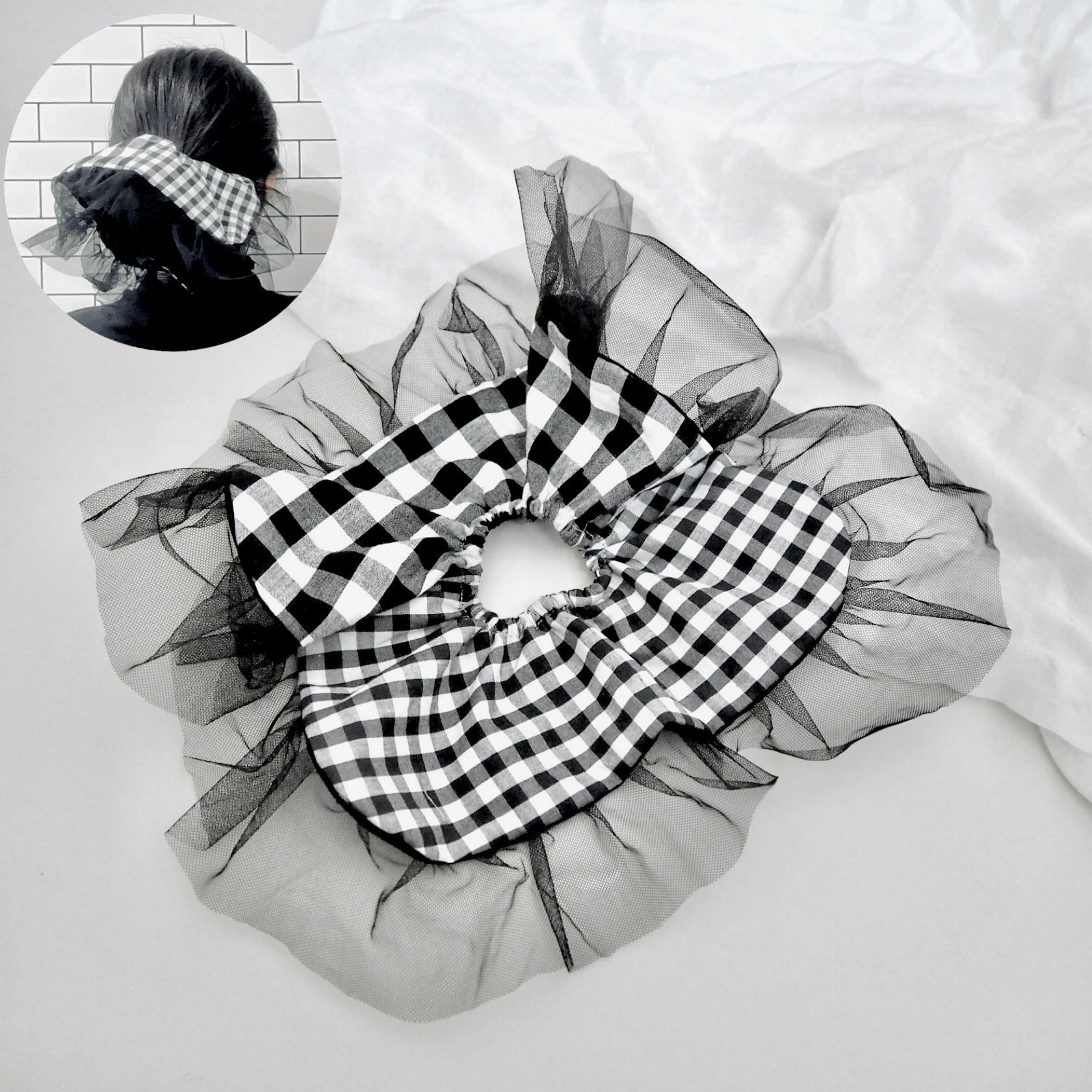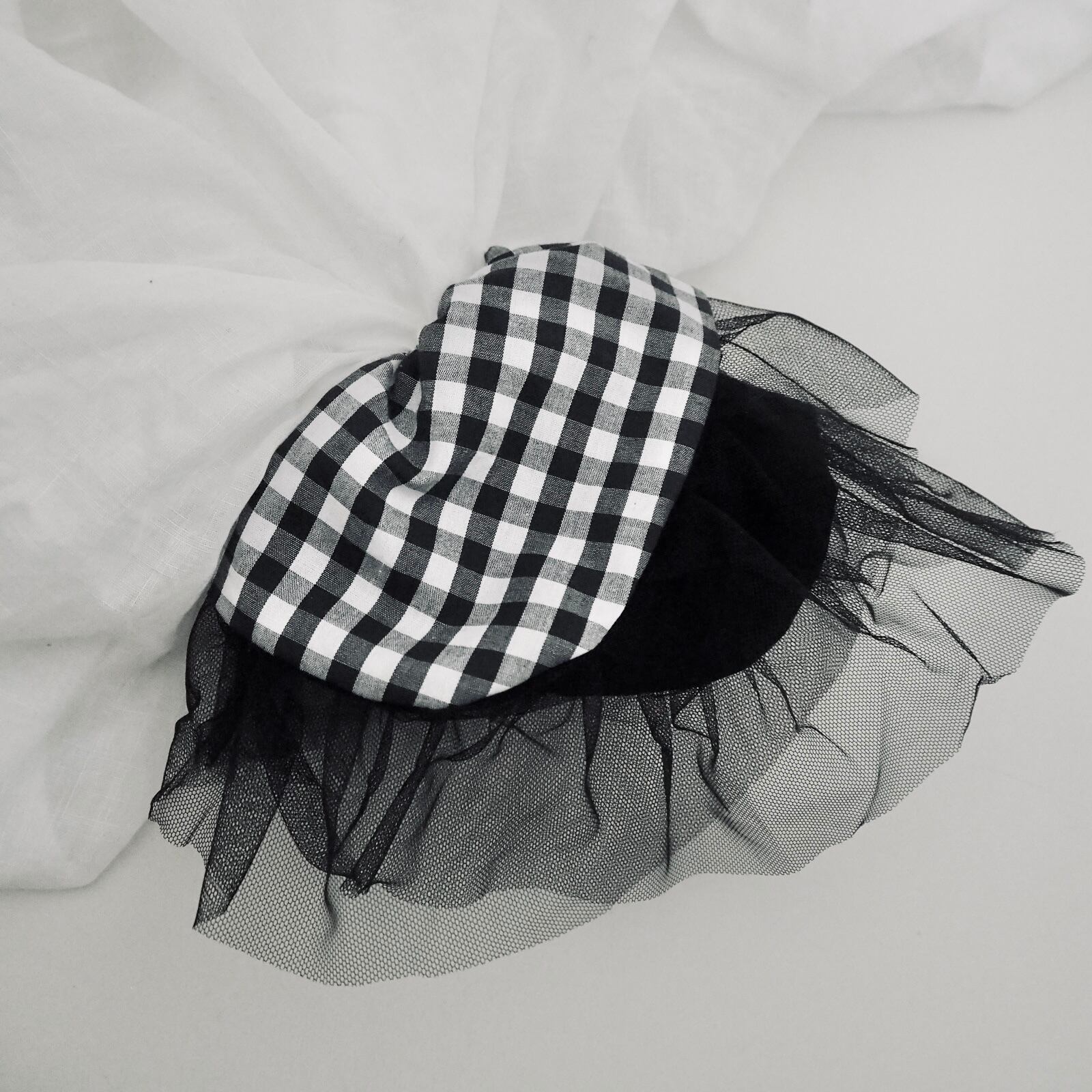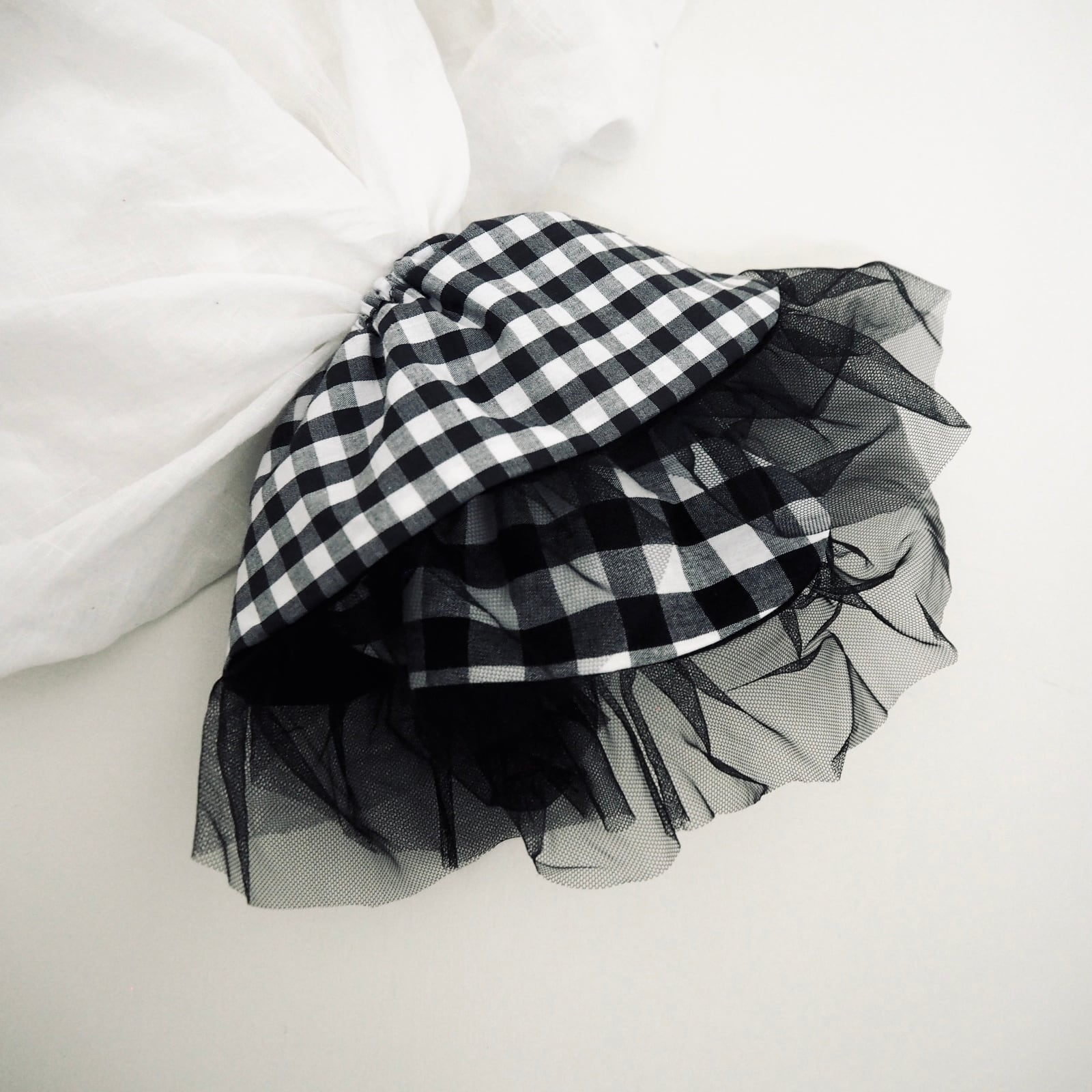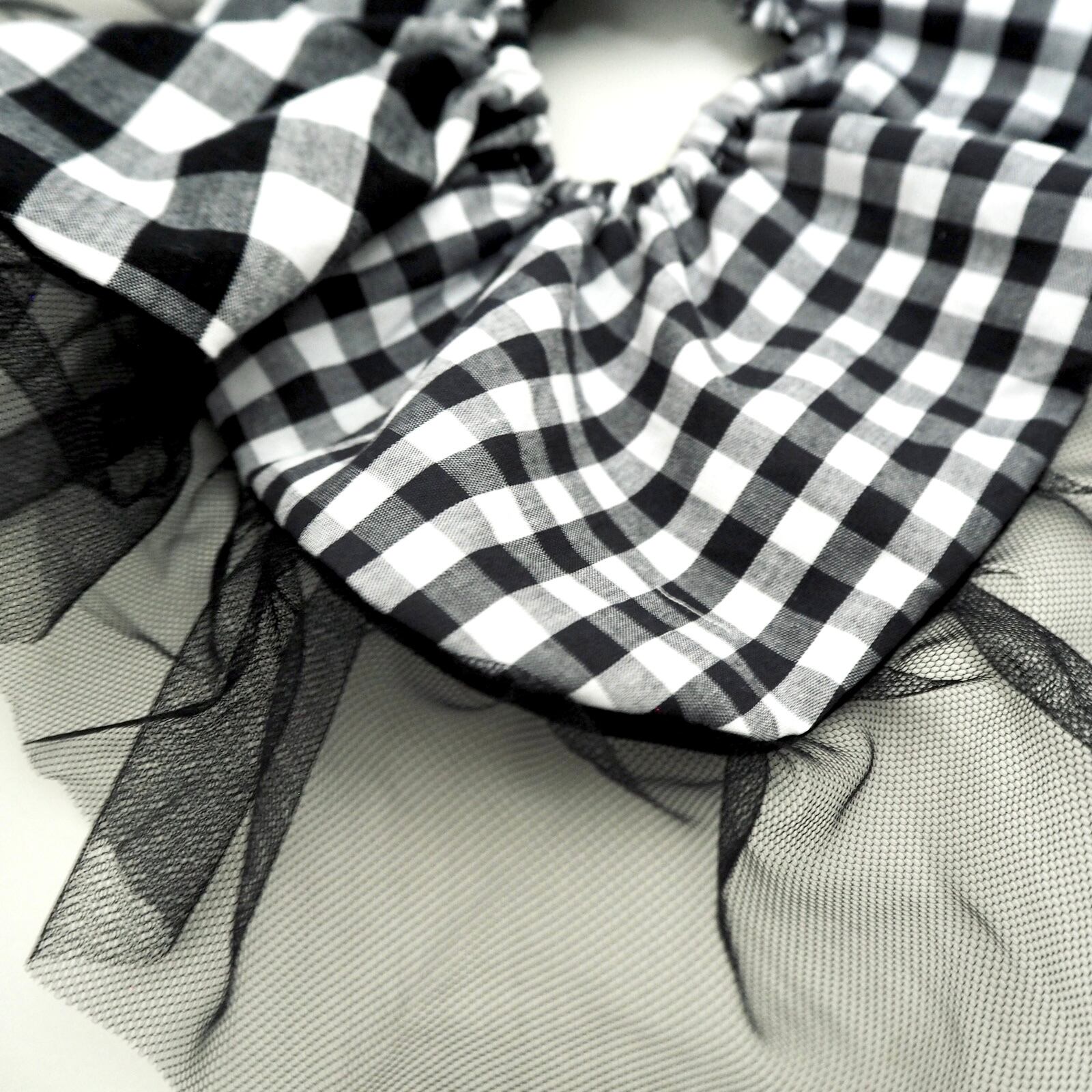 大小のギンガムチェックを組み合わせ、角を少し丸くしソフトチュールを挟み、可愛らしくも洗練されたシュシュが仕上がりました。