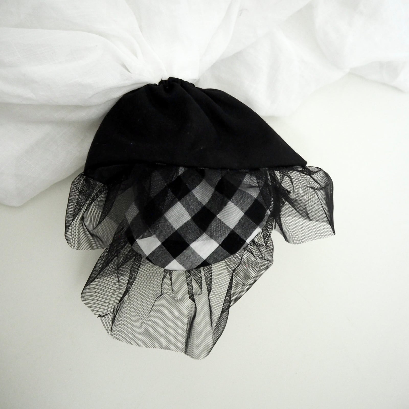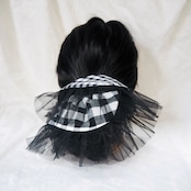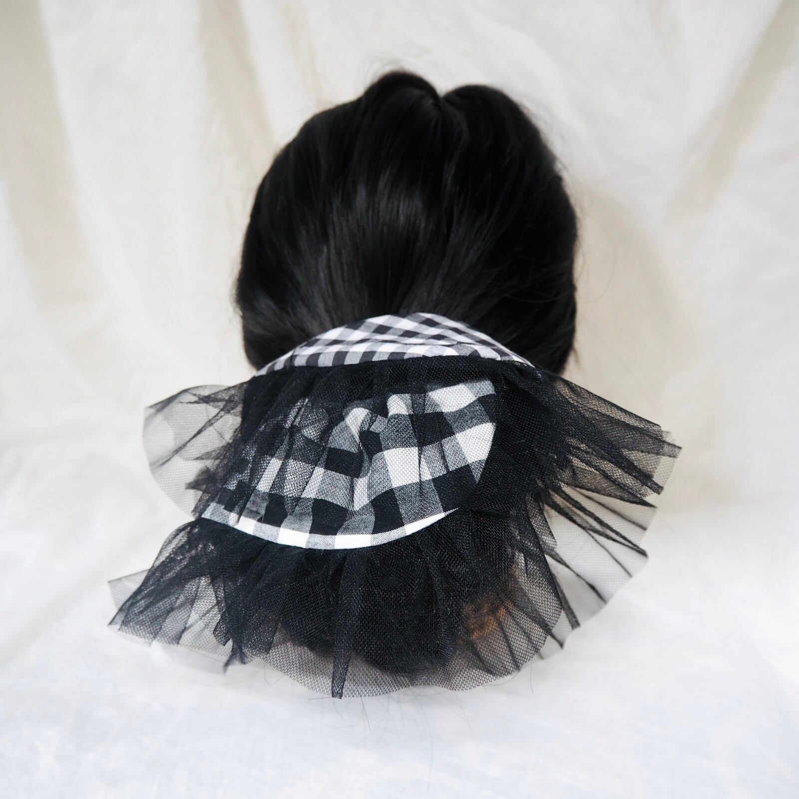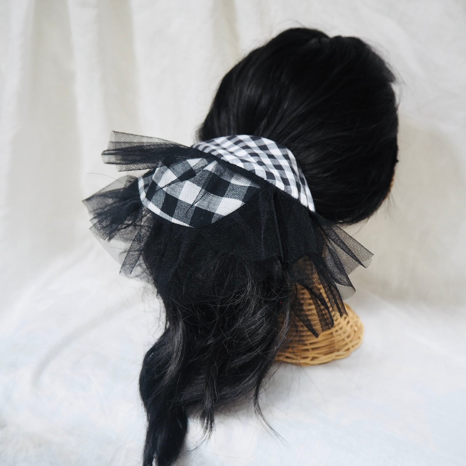 大小のギンガムチェックを組み合わせ、角を少し丸くしソフトチュールを挟み、可愛らしくも洗練されたシュシュが仕上がりました。
