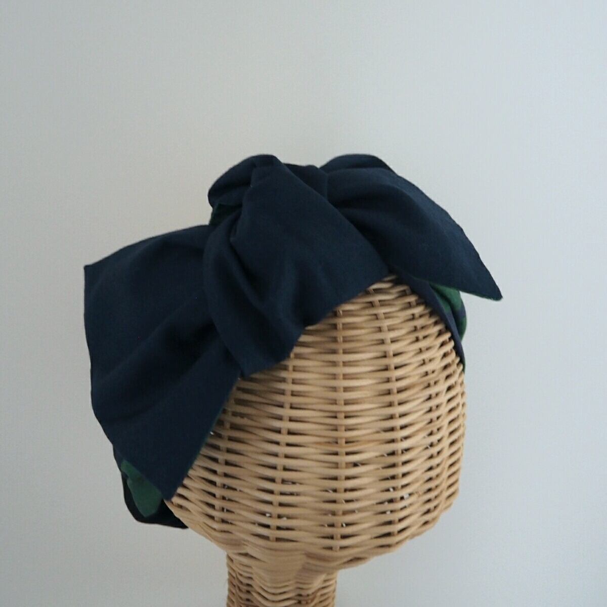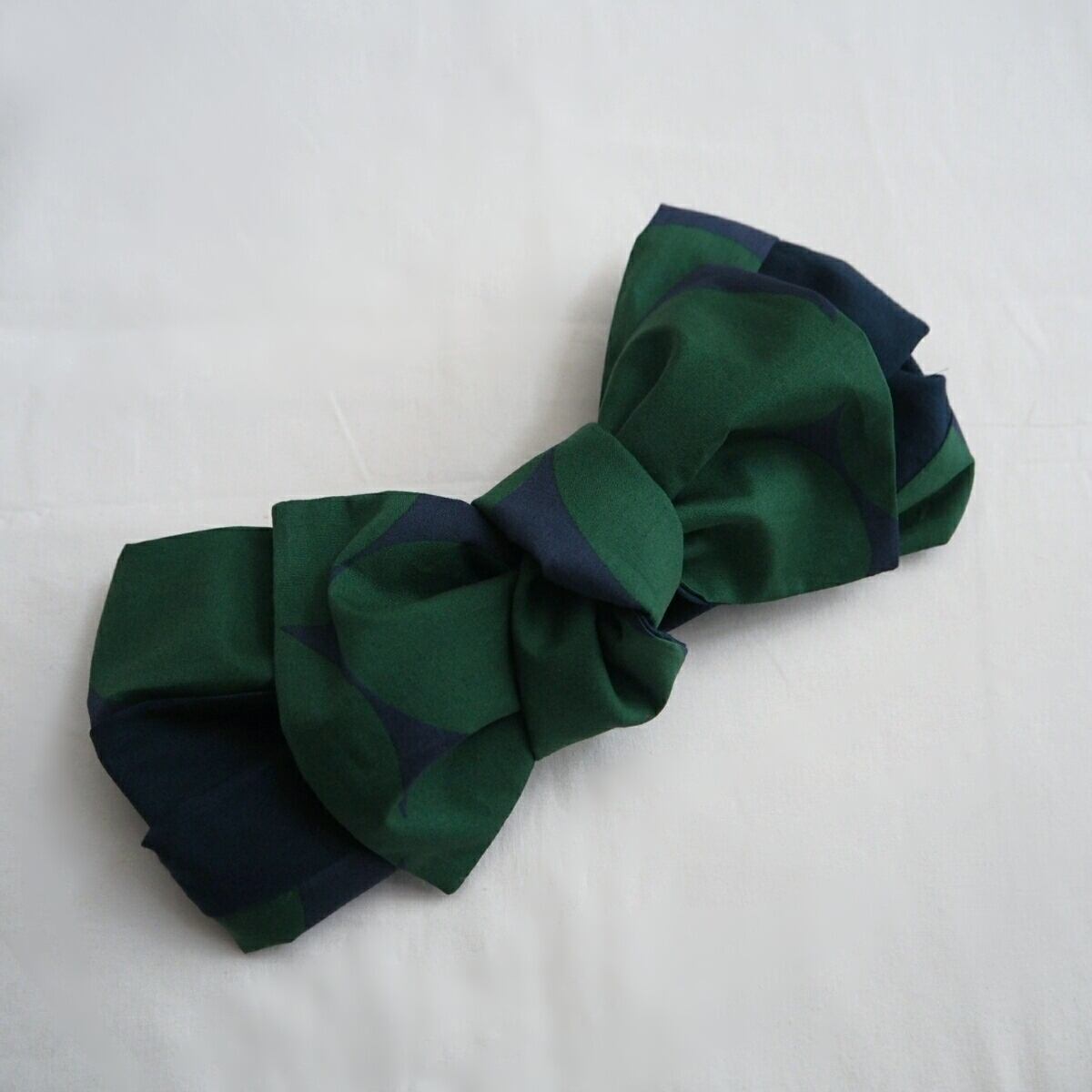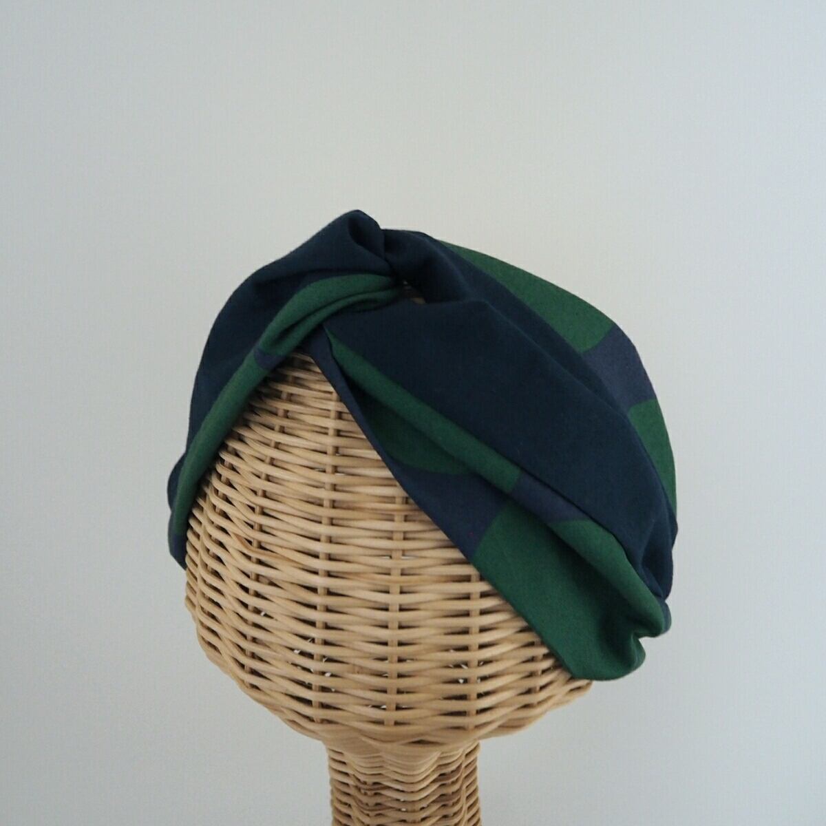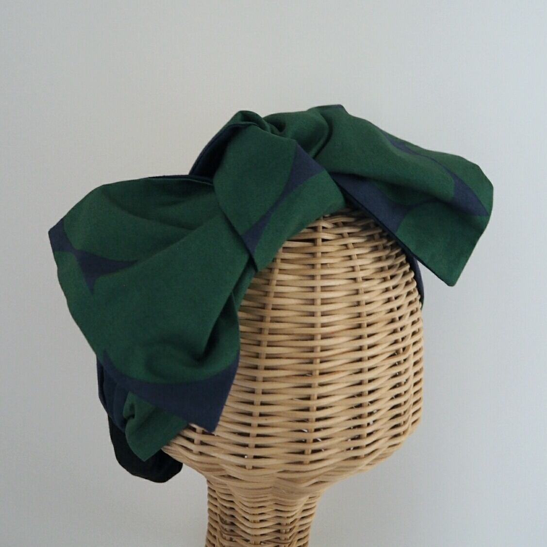 ネイビーに深い緑色のランダムなドットのプリントが目を引く、結び目の様な二本使いのヘアバンドに取り外し出来るリボンをつけました。