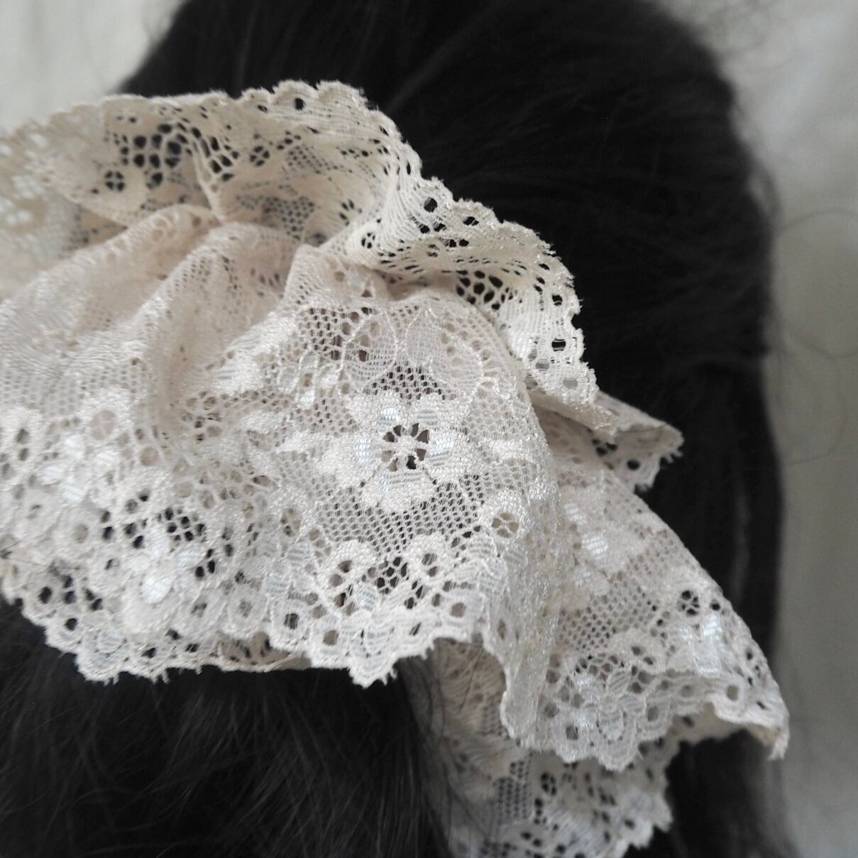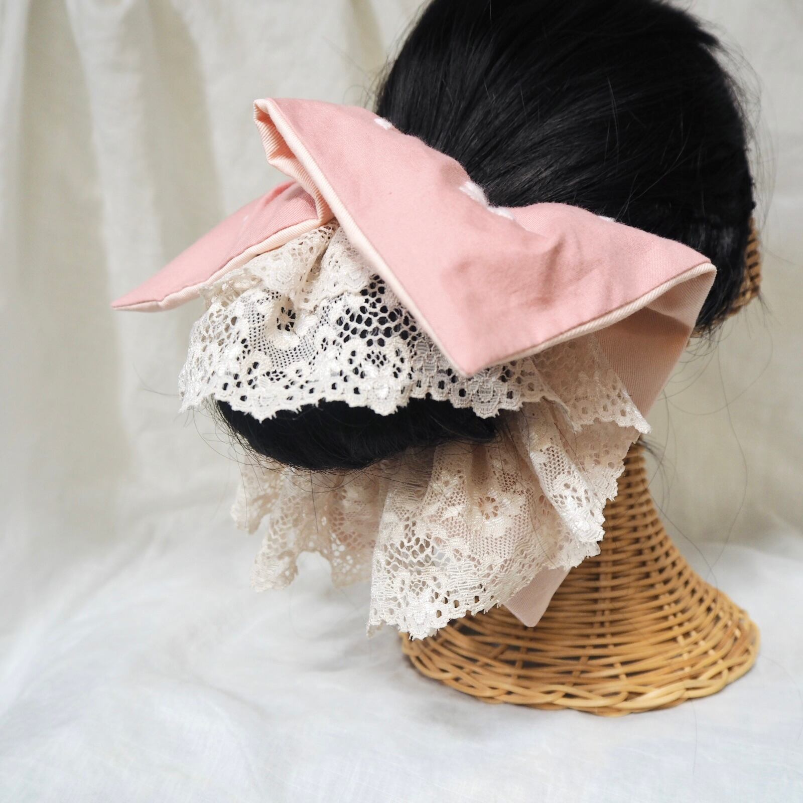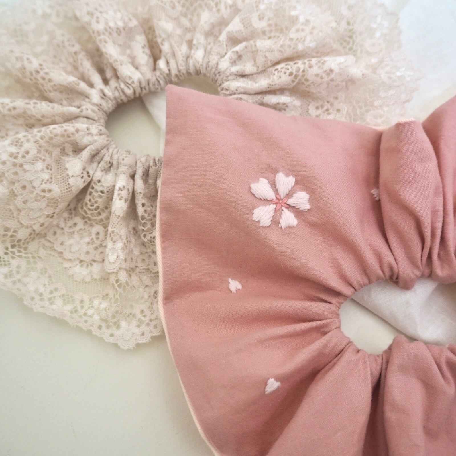 こちらは春に着けて頂きたい落ち着いたピンクに薄ピンクの桜刺繍が可愛いシュシュと、総レースのライトベージュのシュシュ2枚セットです。