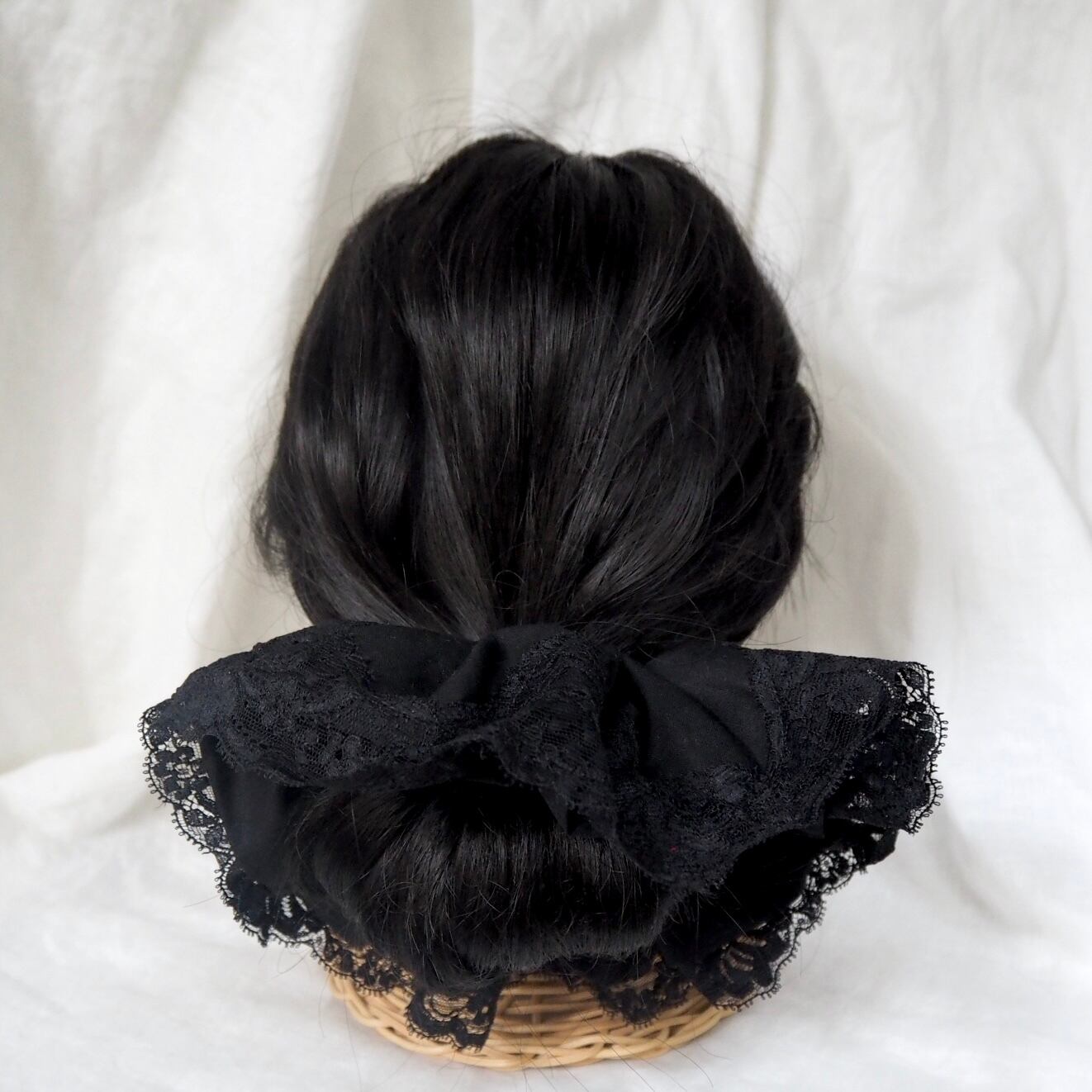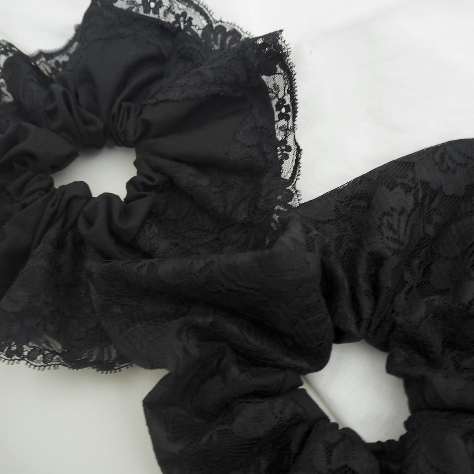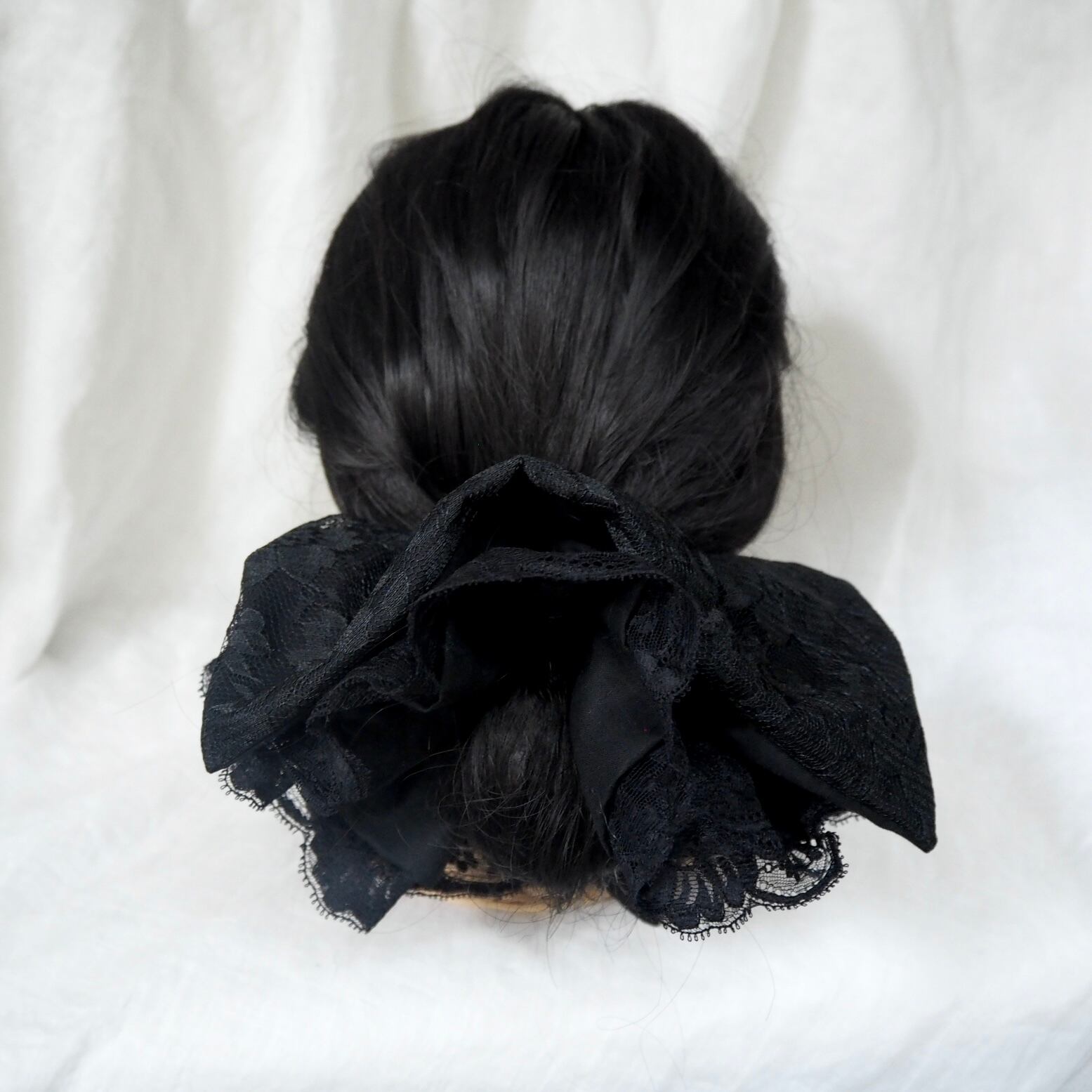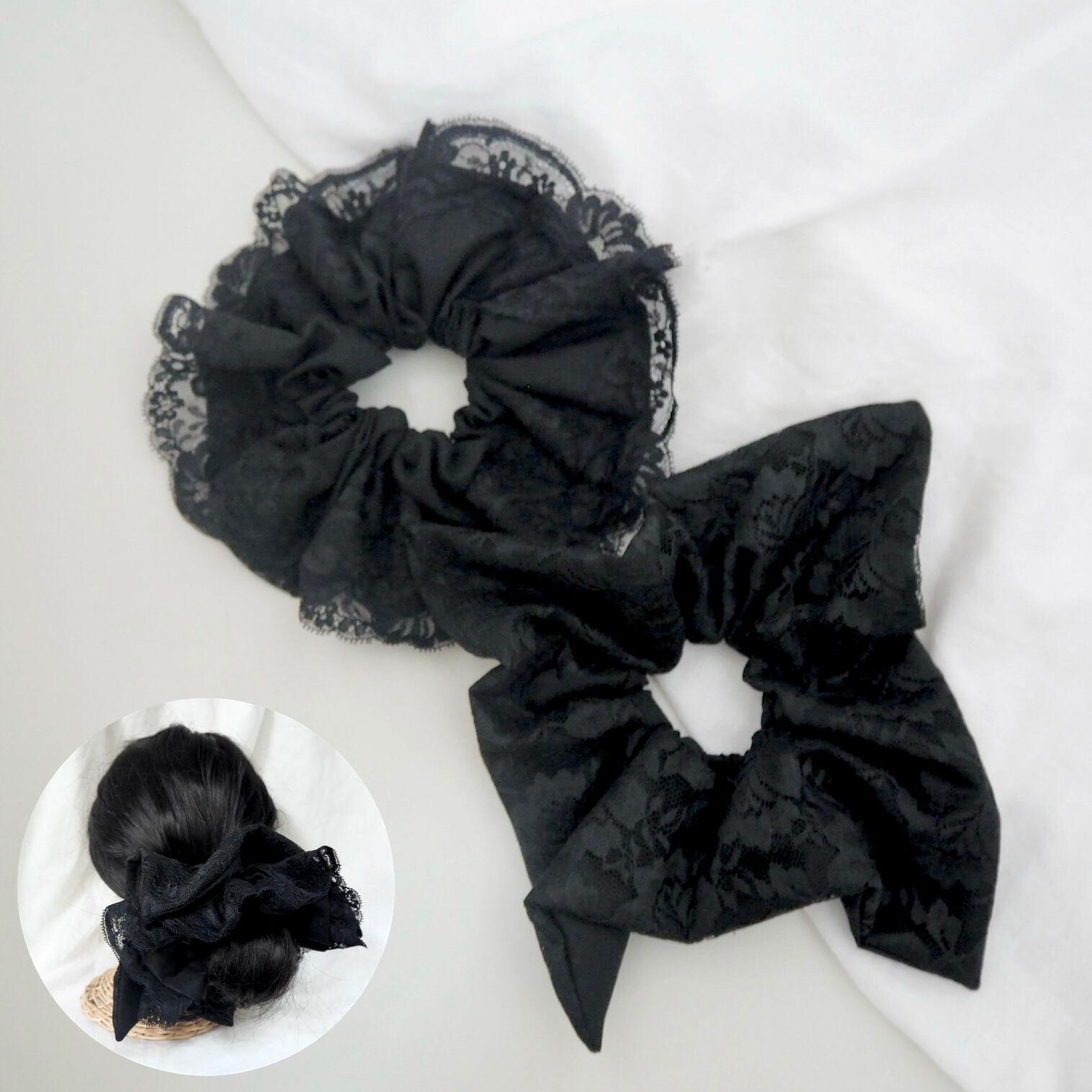 こちらは、黒のレースのシュシュに更に動きが出る様にふんわり丸型のレースのシュシュをセットにしました。