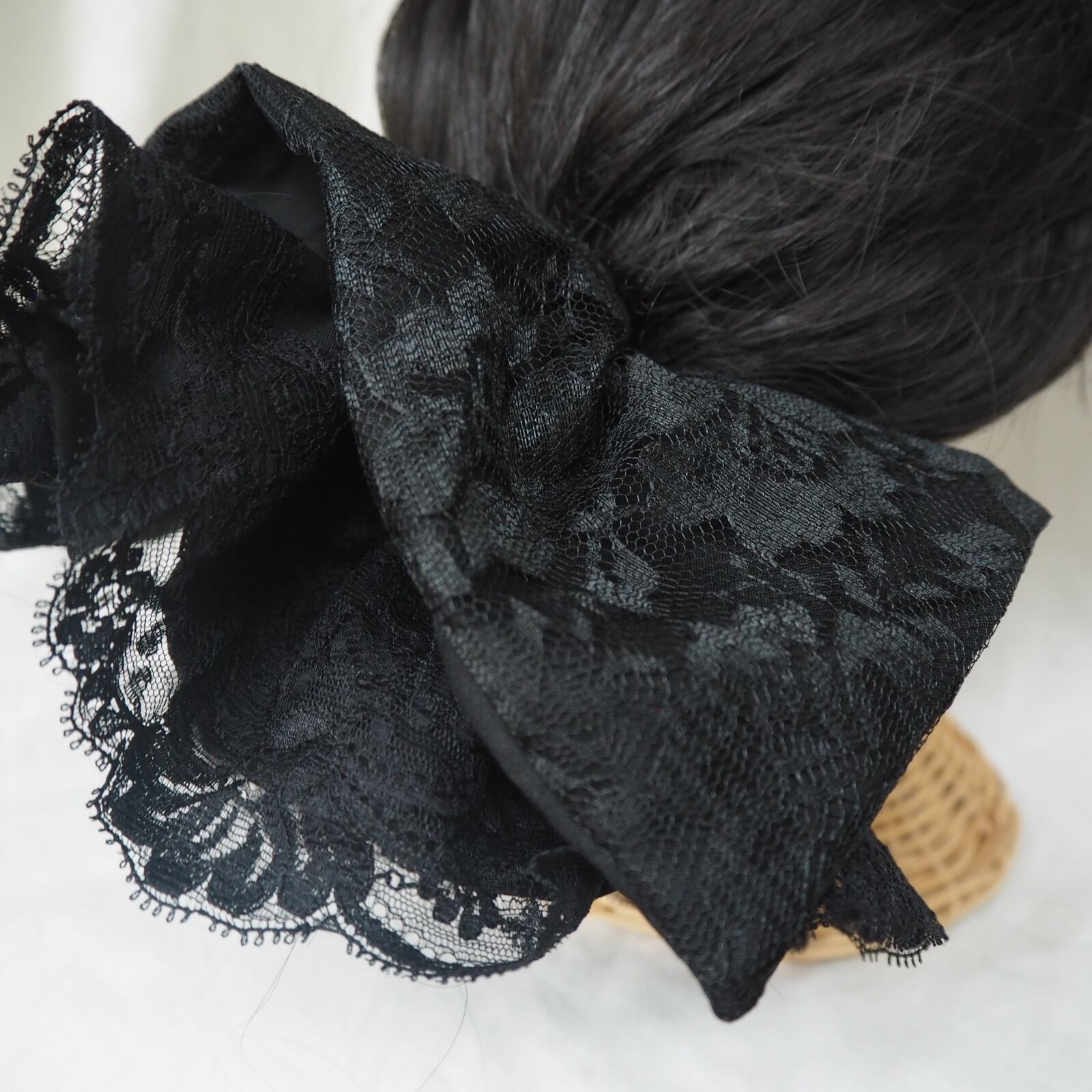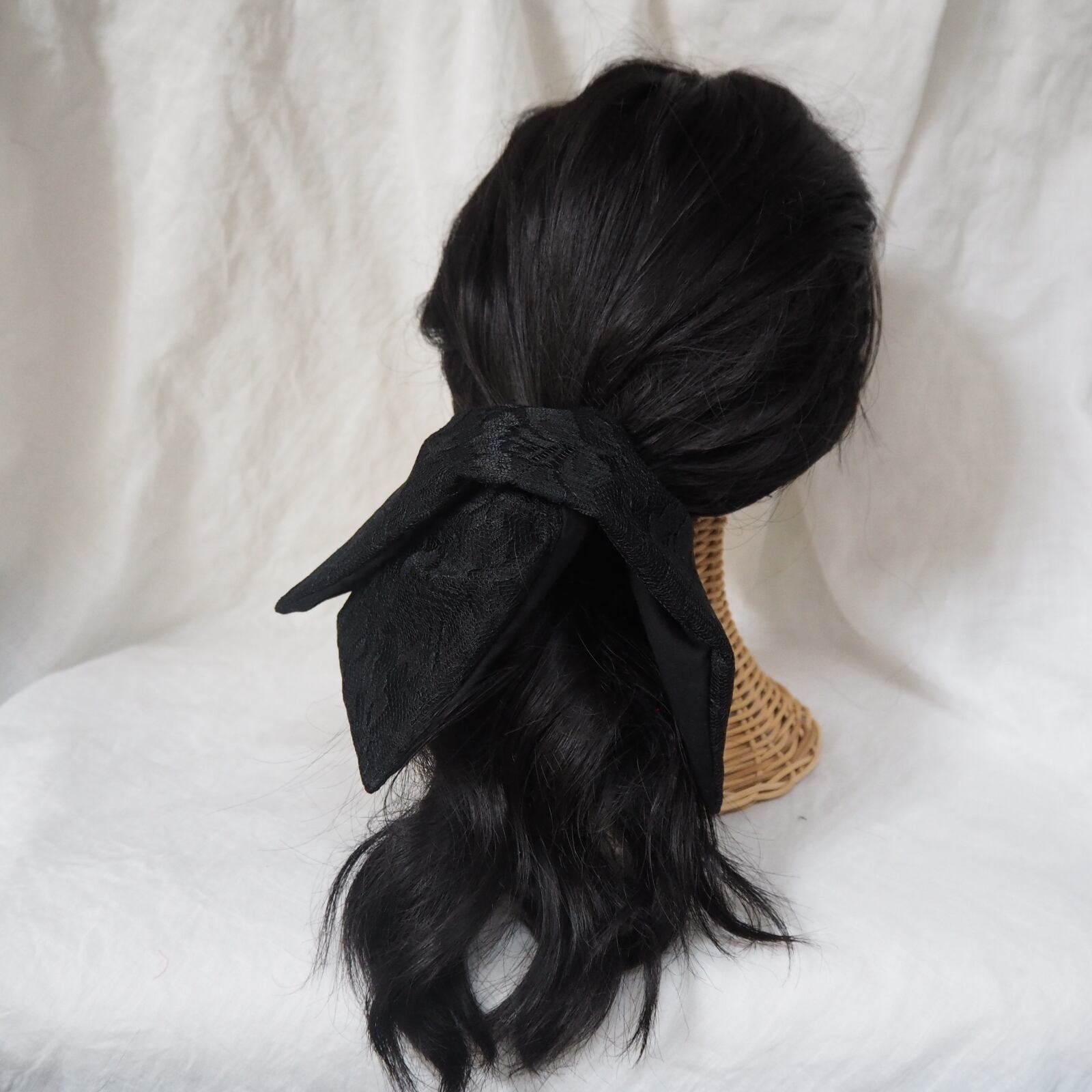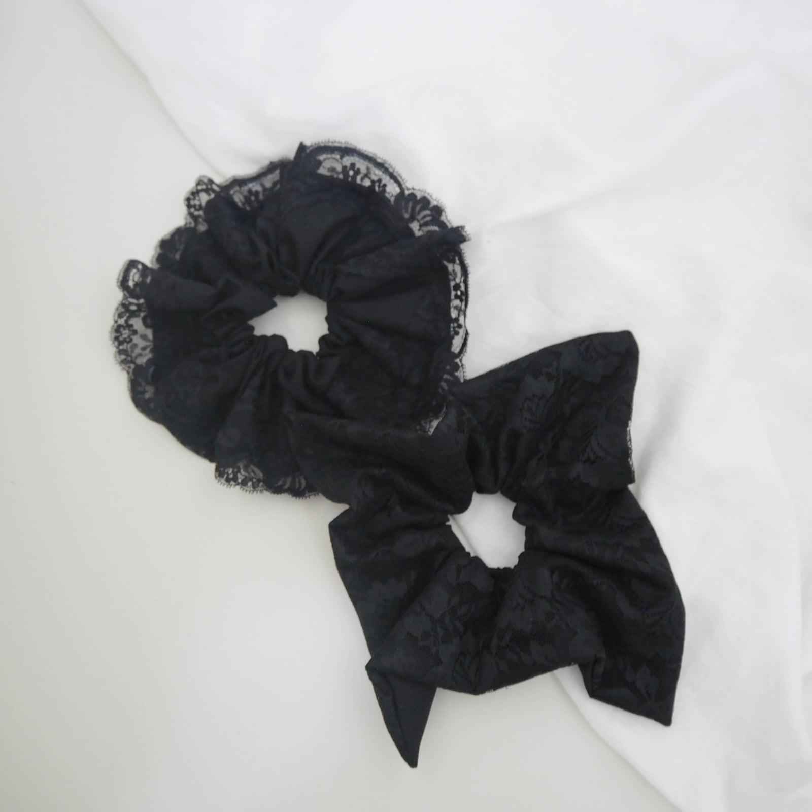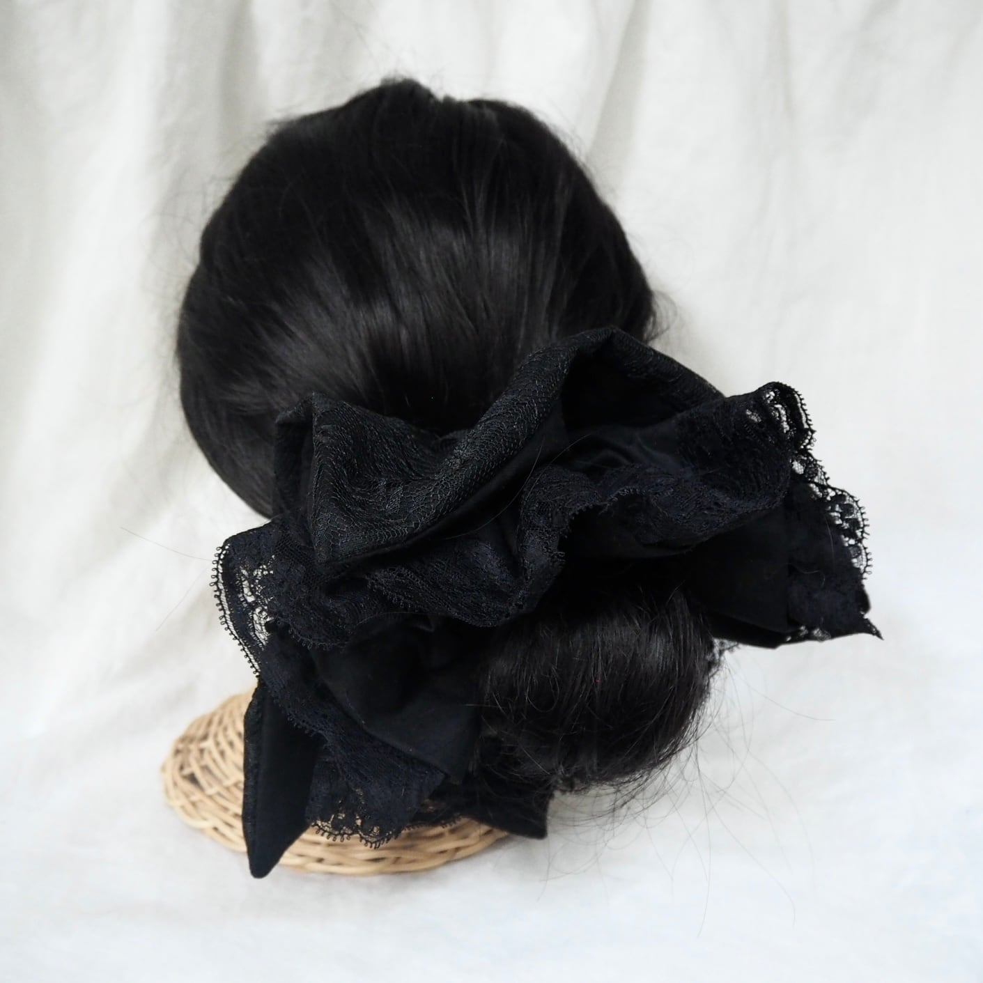 こちらは、黒のレースのシュシュに更に動きが出る様にふんわり丸型のレースのシュシュをセットにしました。