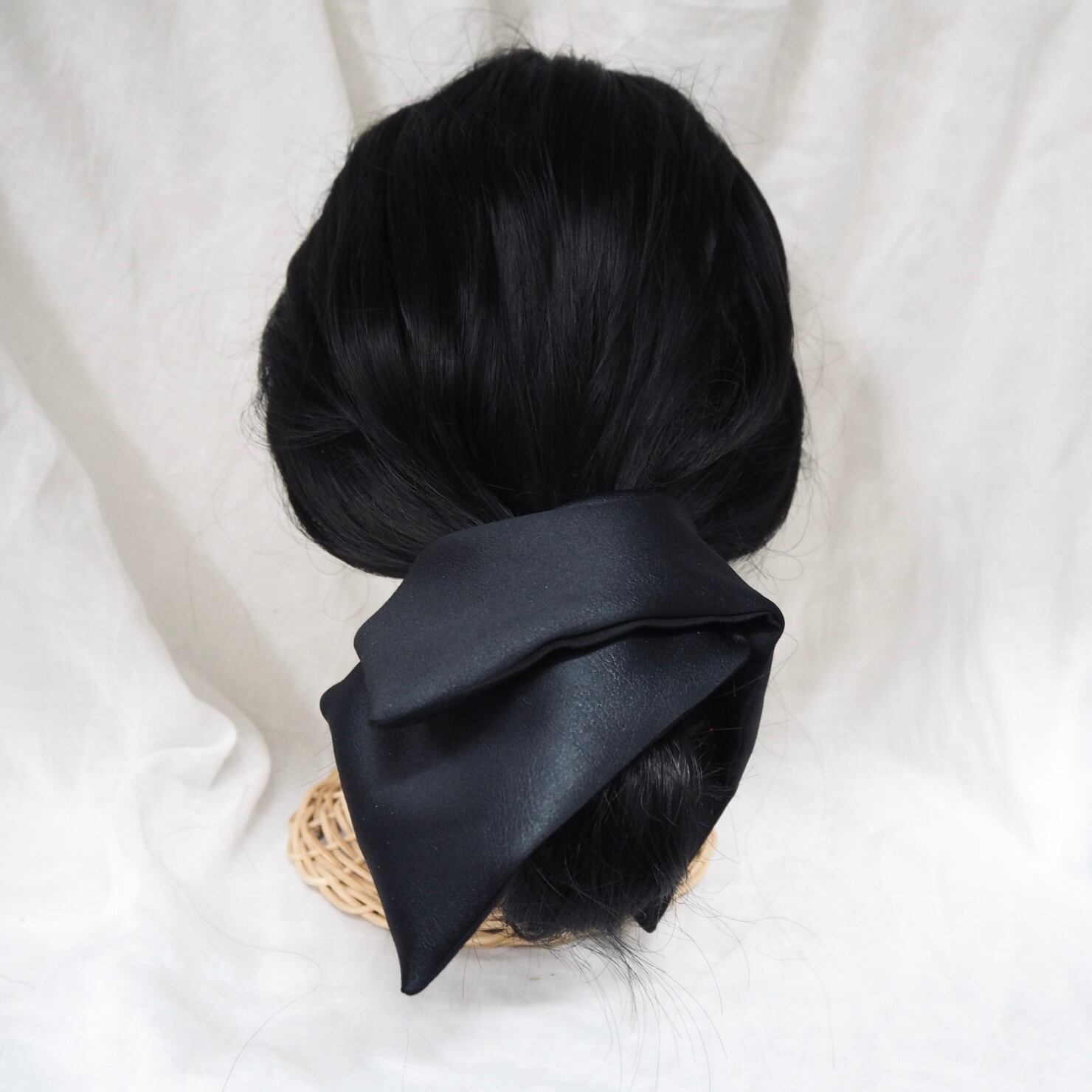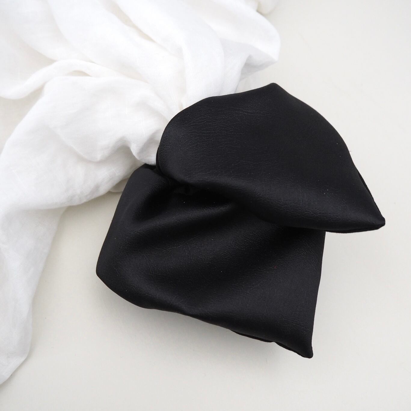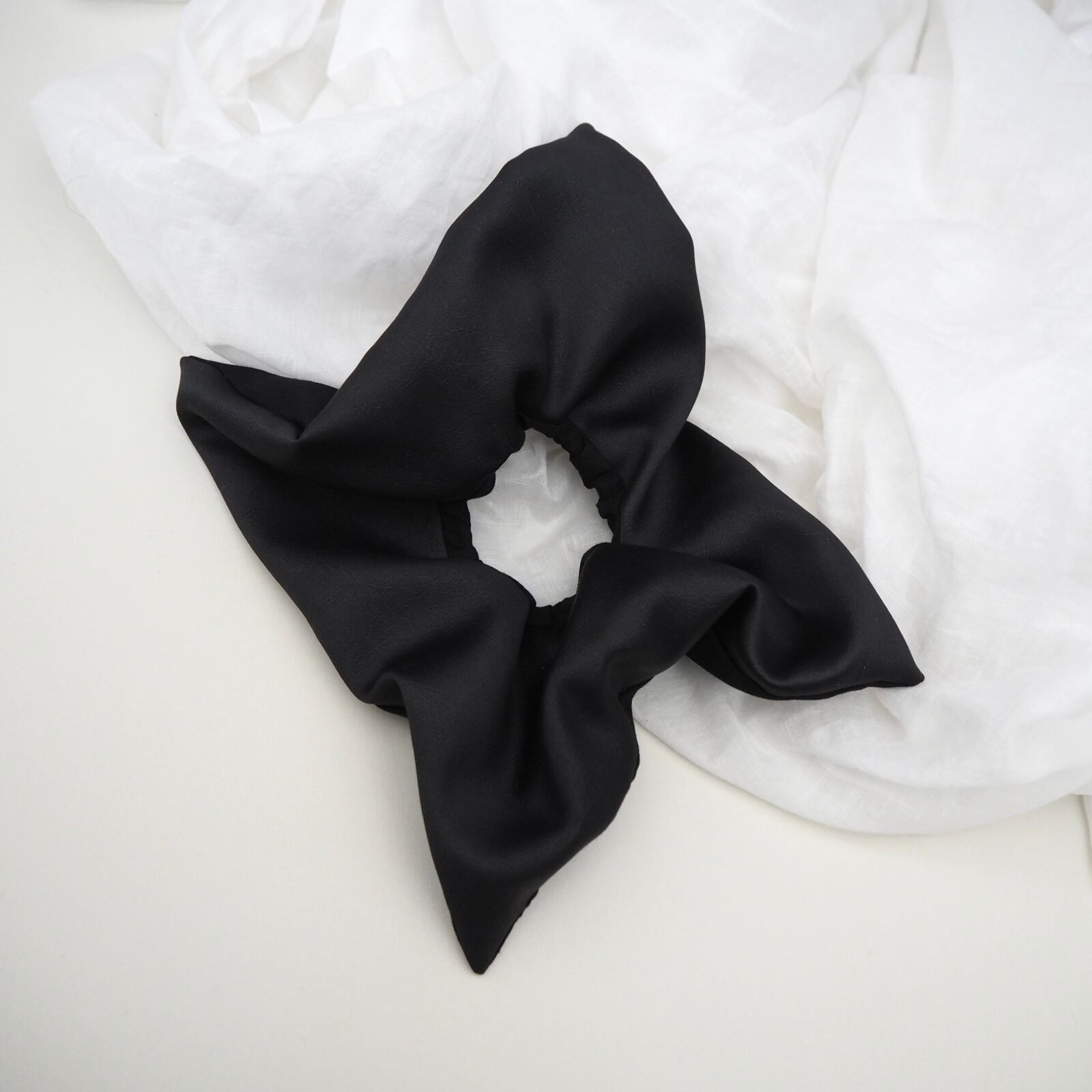 定番の丸いシュシュとは異なり、可愛さ控えめの少し落ち着いた雰囲気を演出できる正方形のシュシュです。