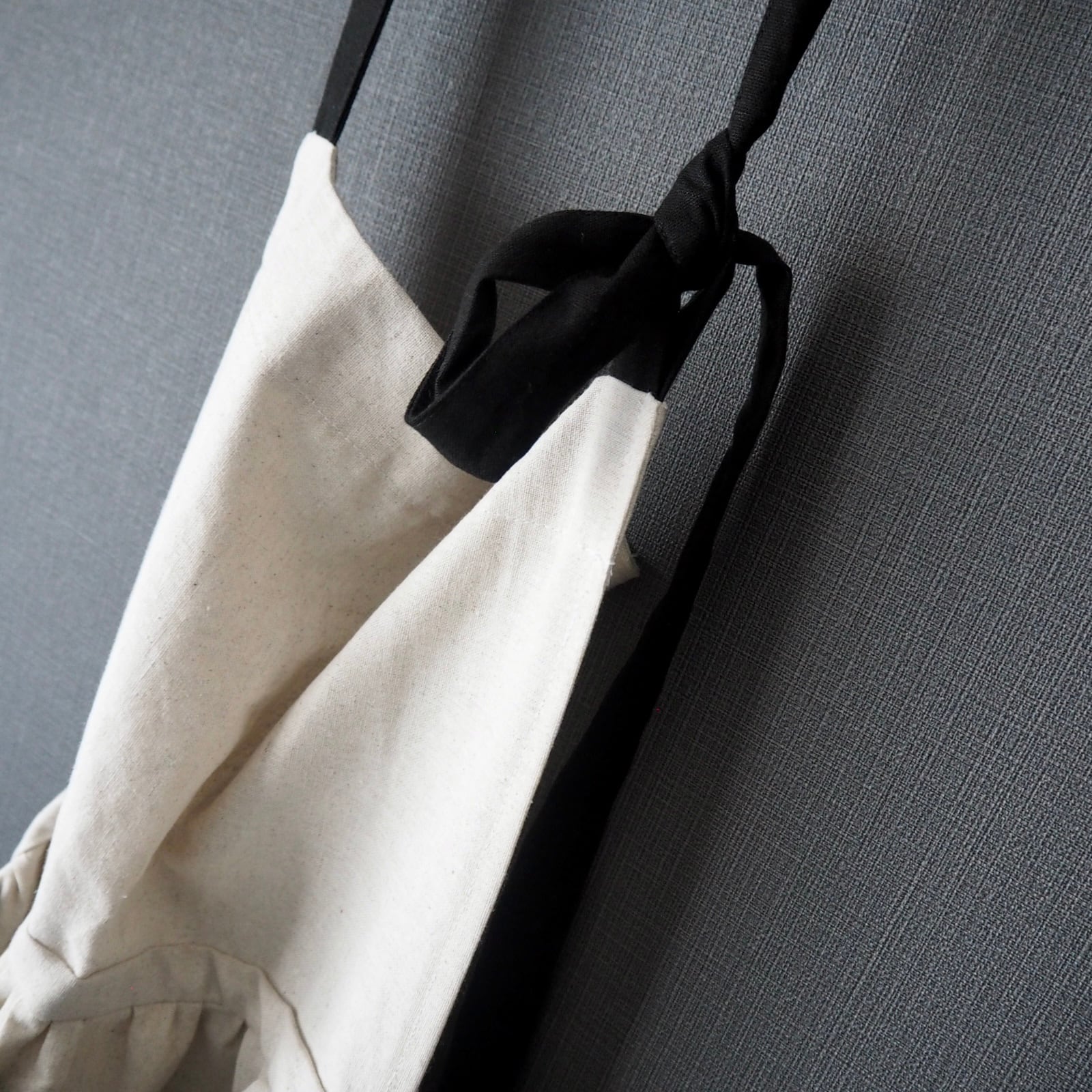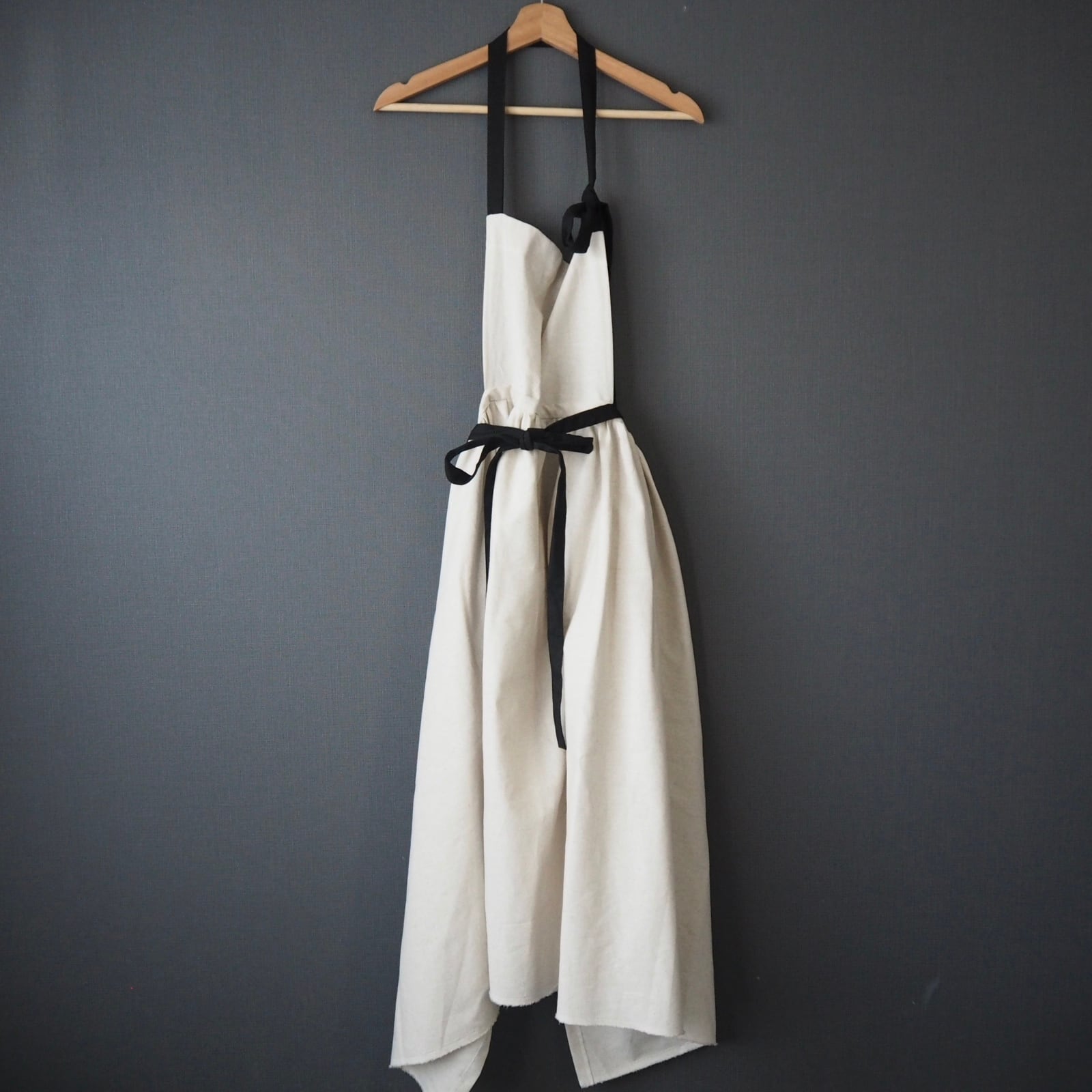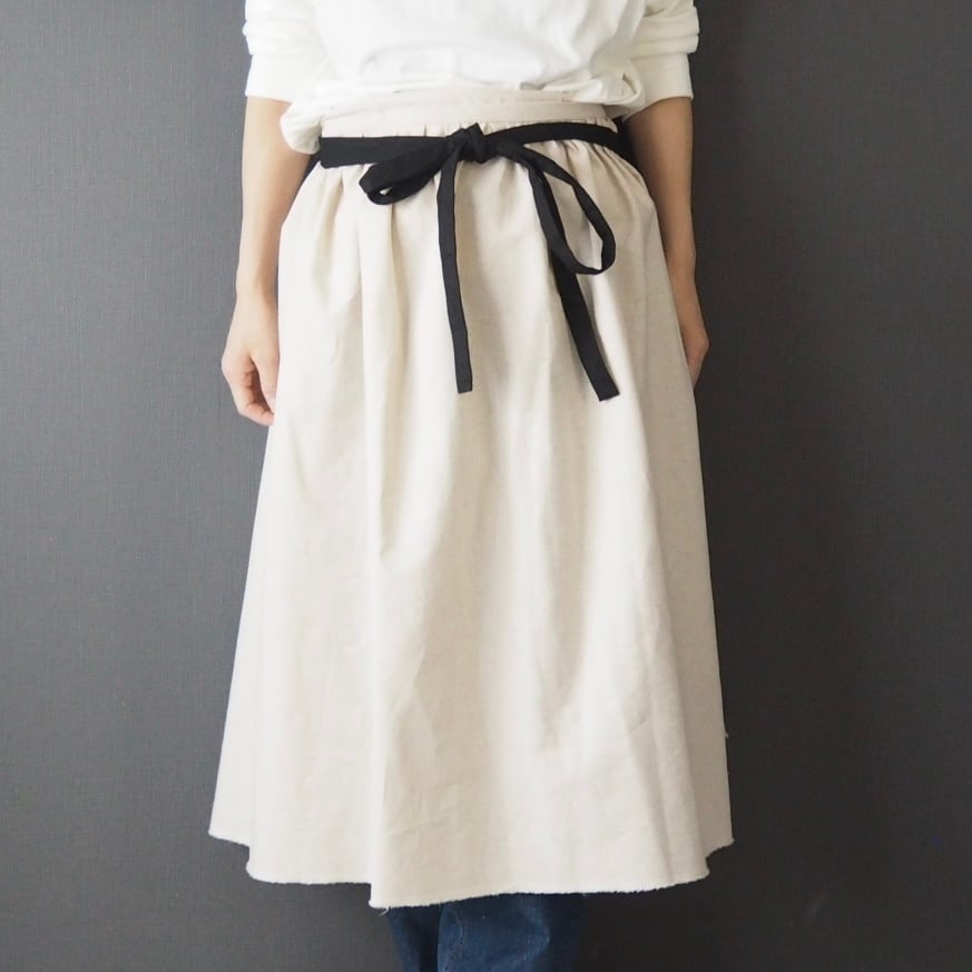 ナチュラルなカス残しと黒の綿麻キャンバス生地で作ったたっぷりギャザースカートのエプロンです。
