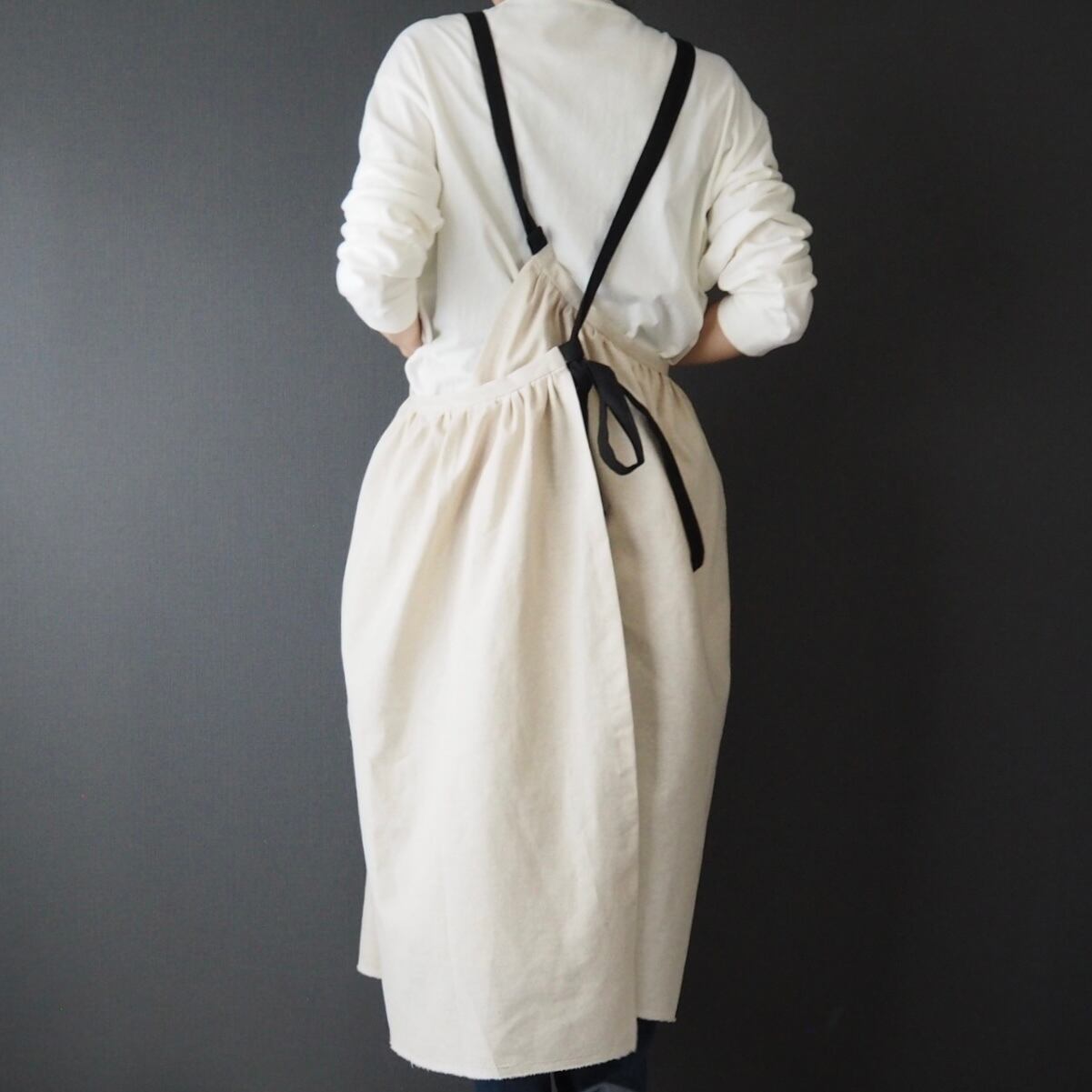 背中のループに通すとワンピースのように、また、結び方によってクロスエプロンのようになります。
