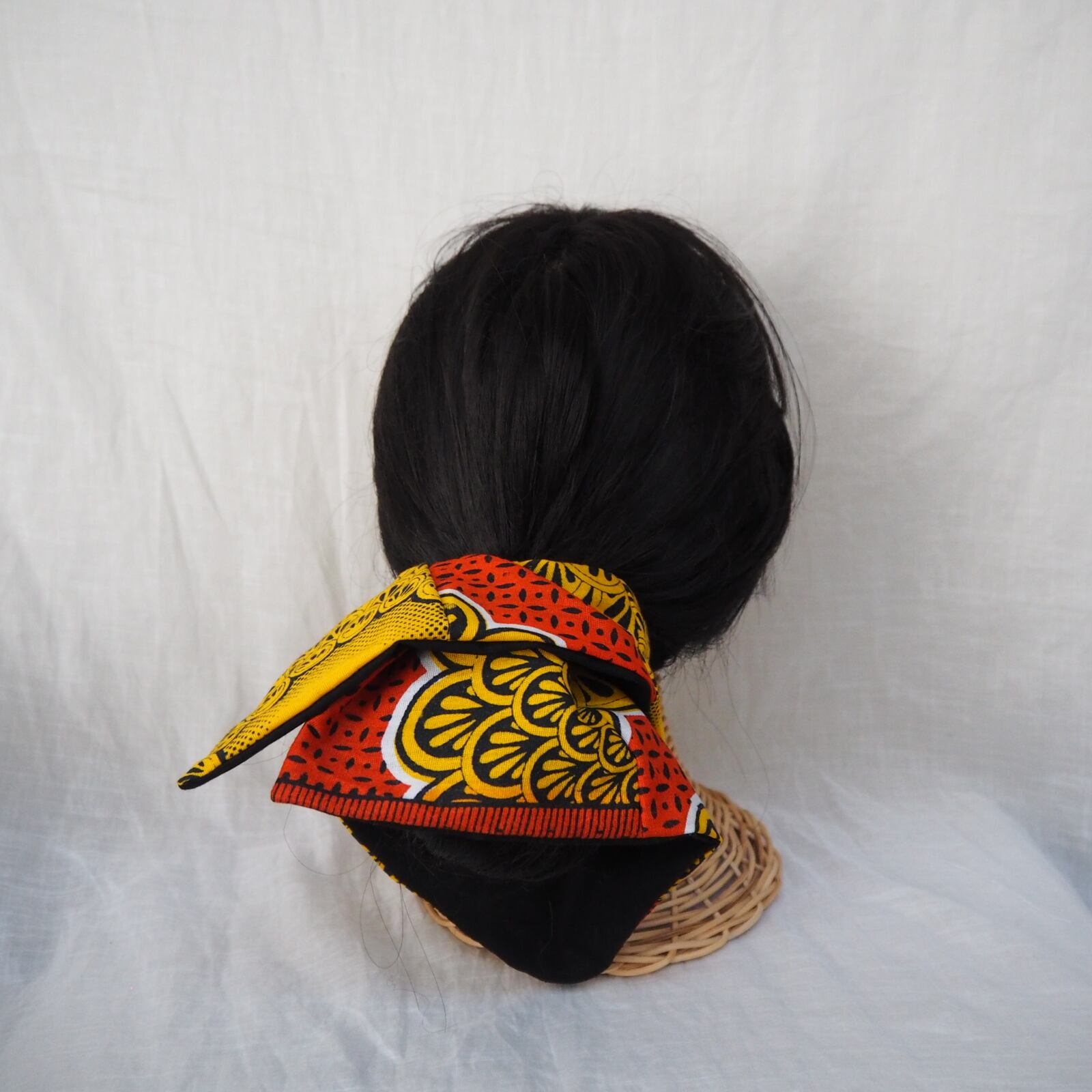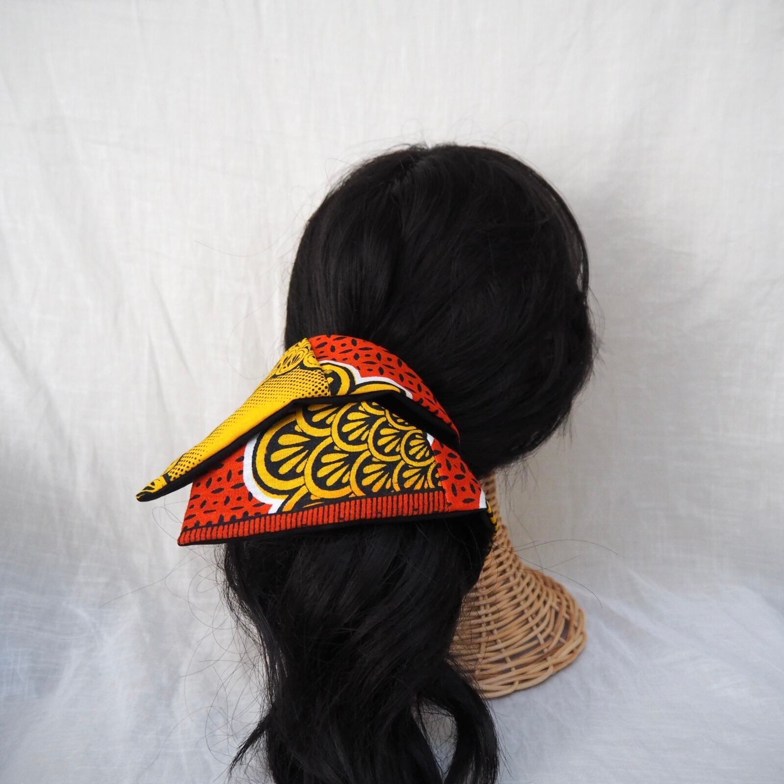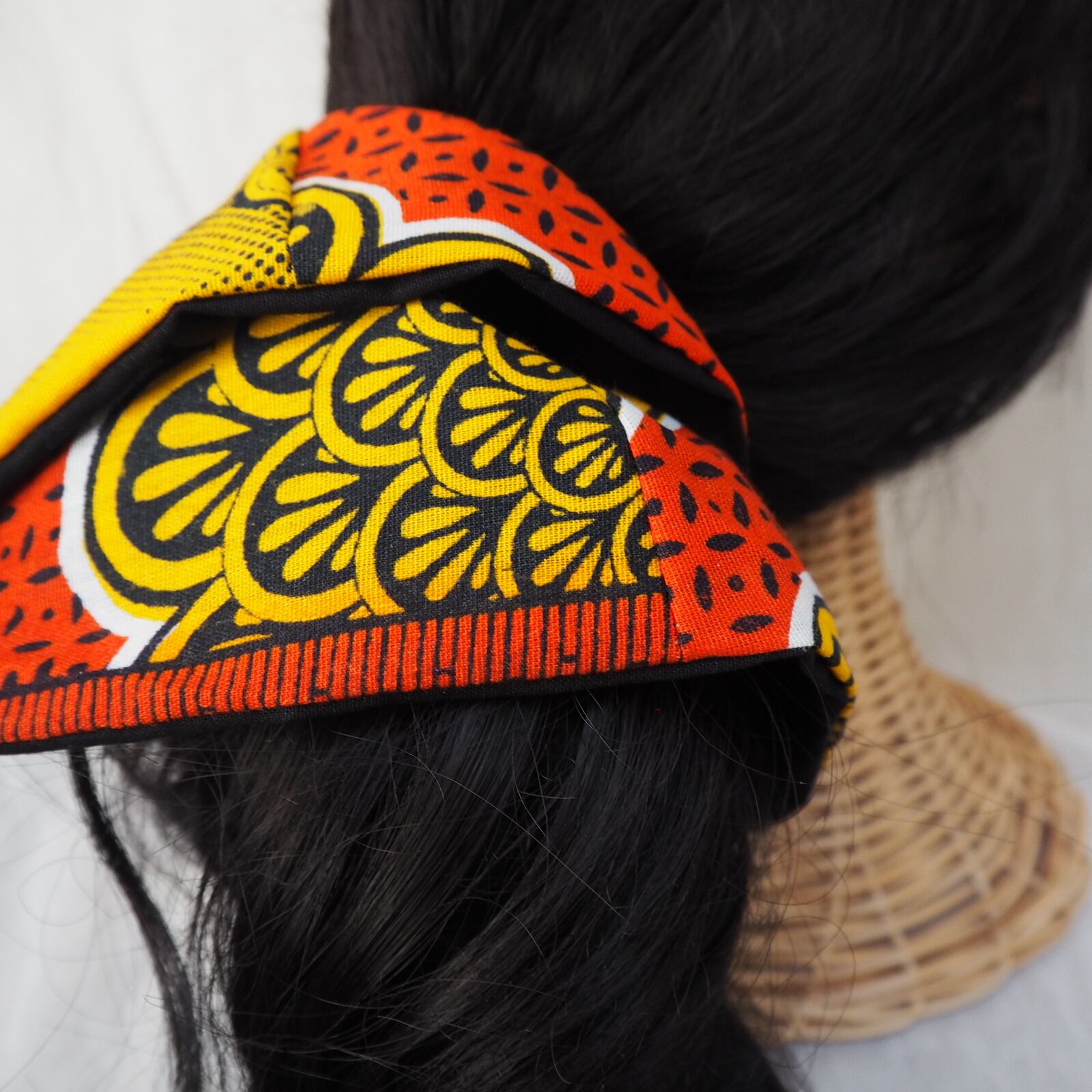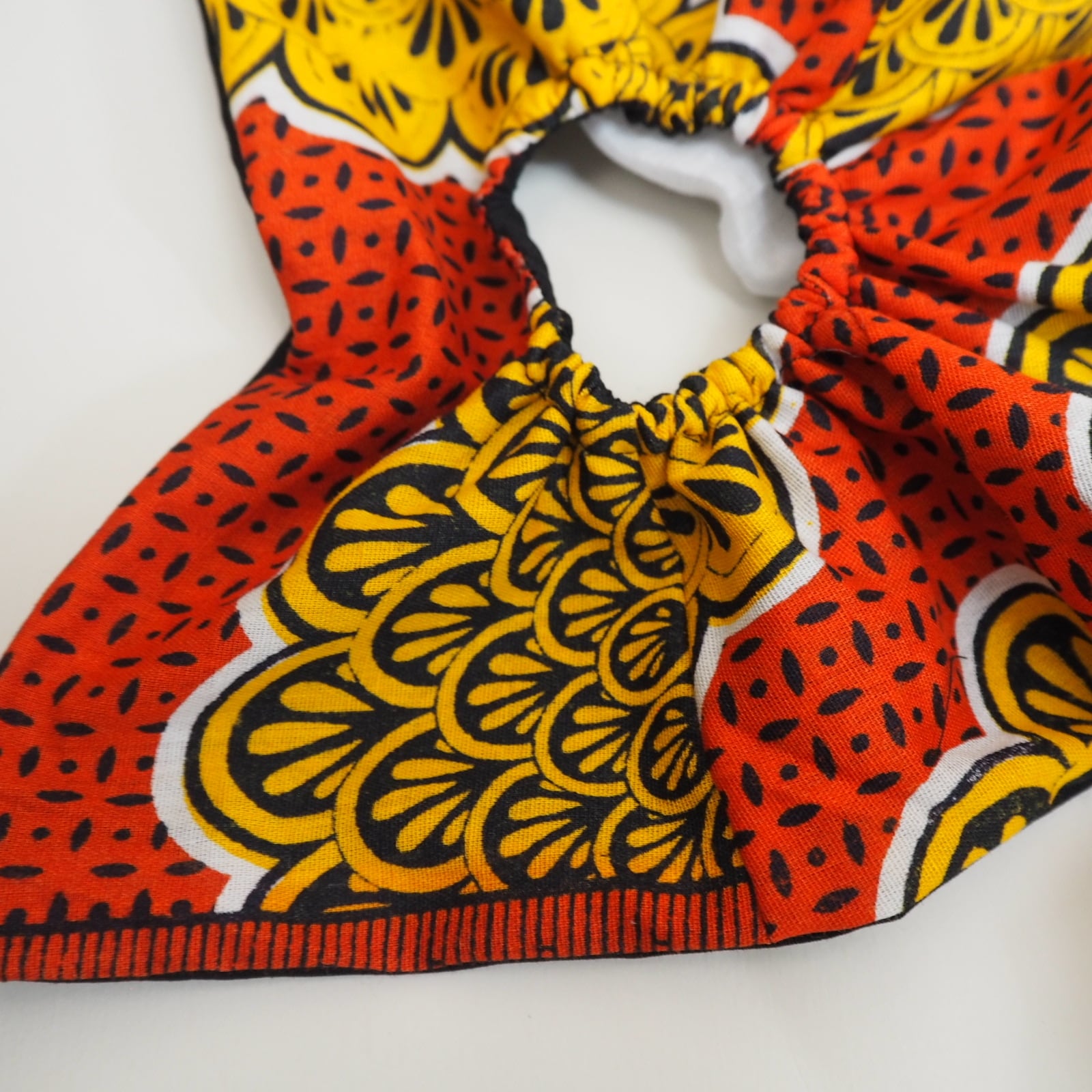 パッと目を引く鮮やかな生地が特徴的なアフリカ生地を使用して作ったスクエアシュシュです。