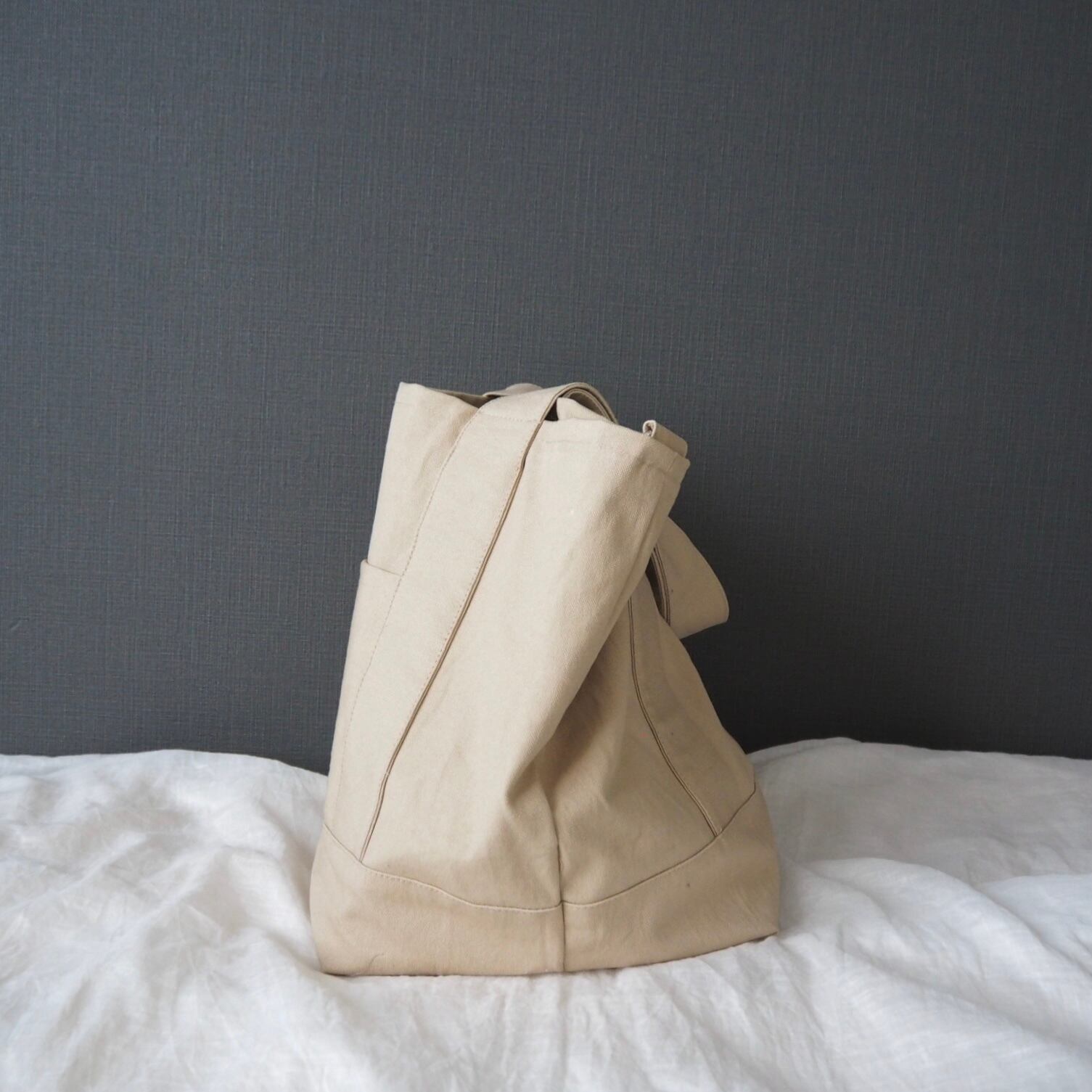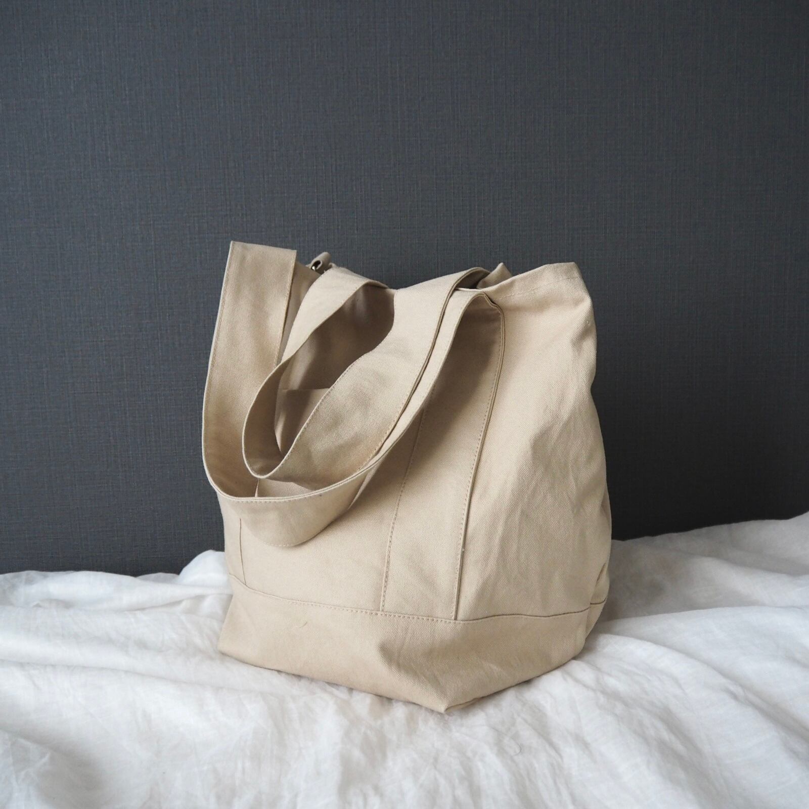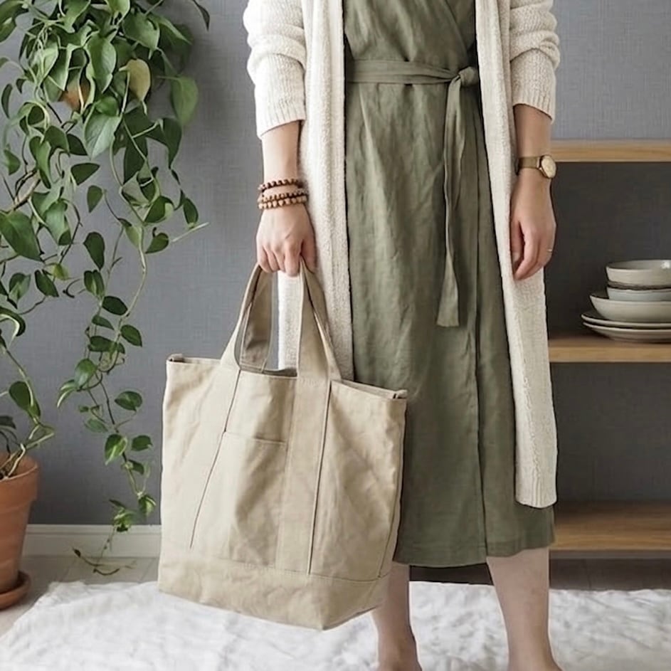 マチをたっぷり取った底が正方形に近いくらいの、ころんとしたシルエットが可愛らしい通年使えるシンプルなトートバッグです。何度か試作して大小それぞれしっくりくるサイズ感に仕上がりました。