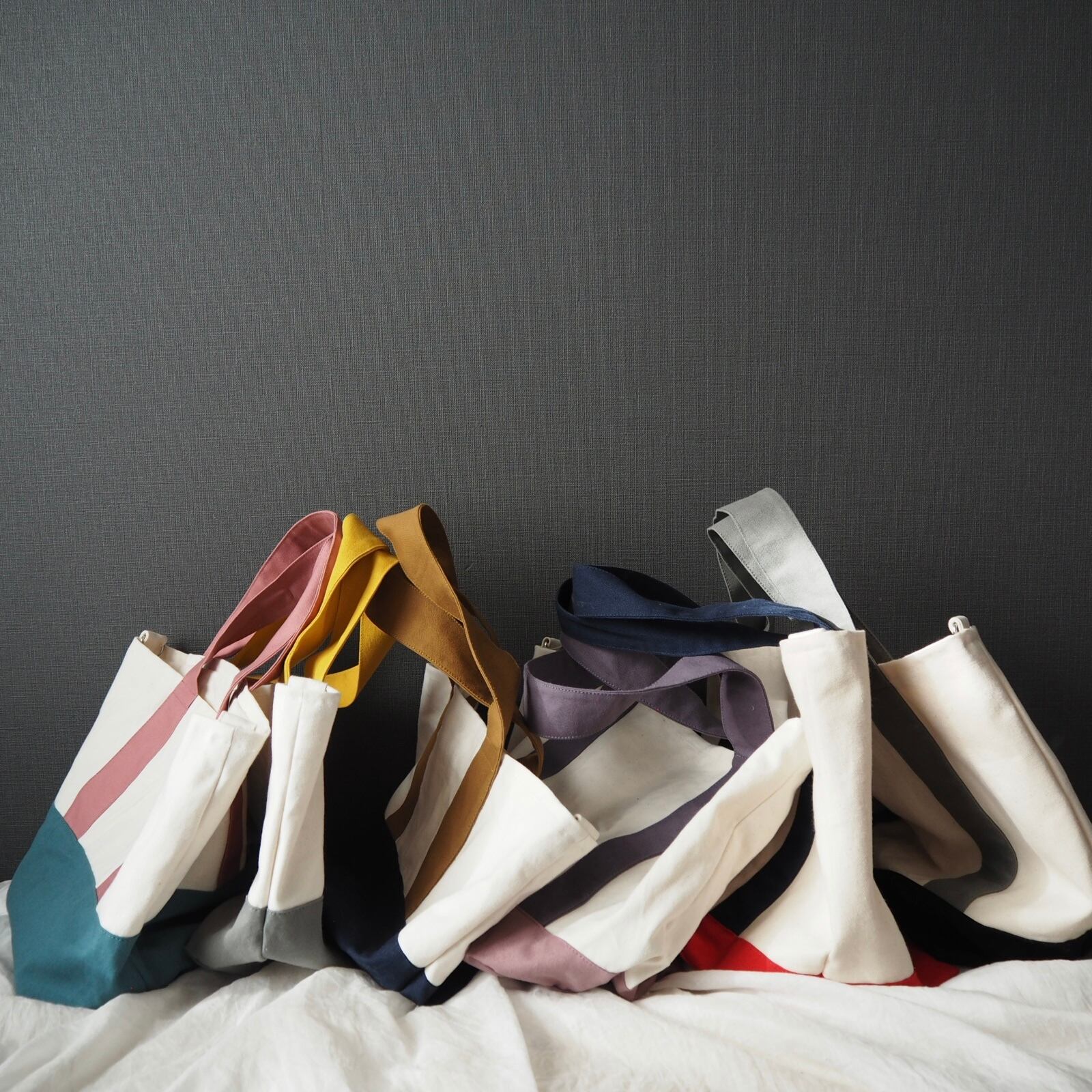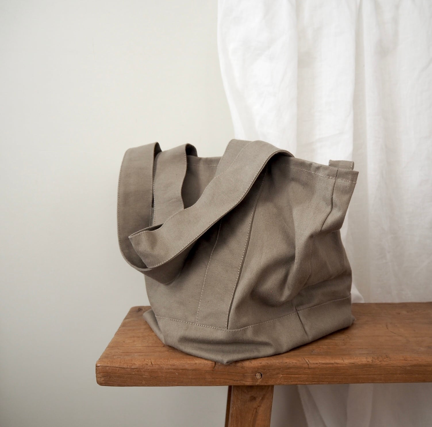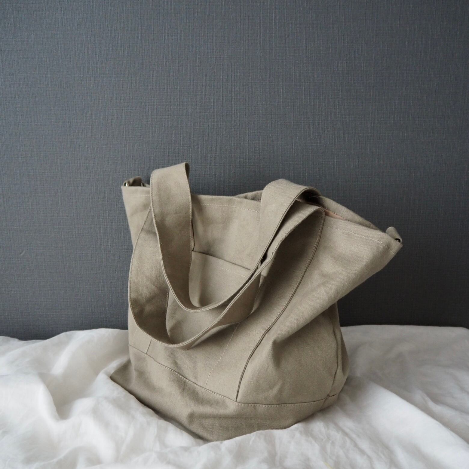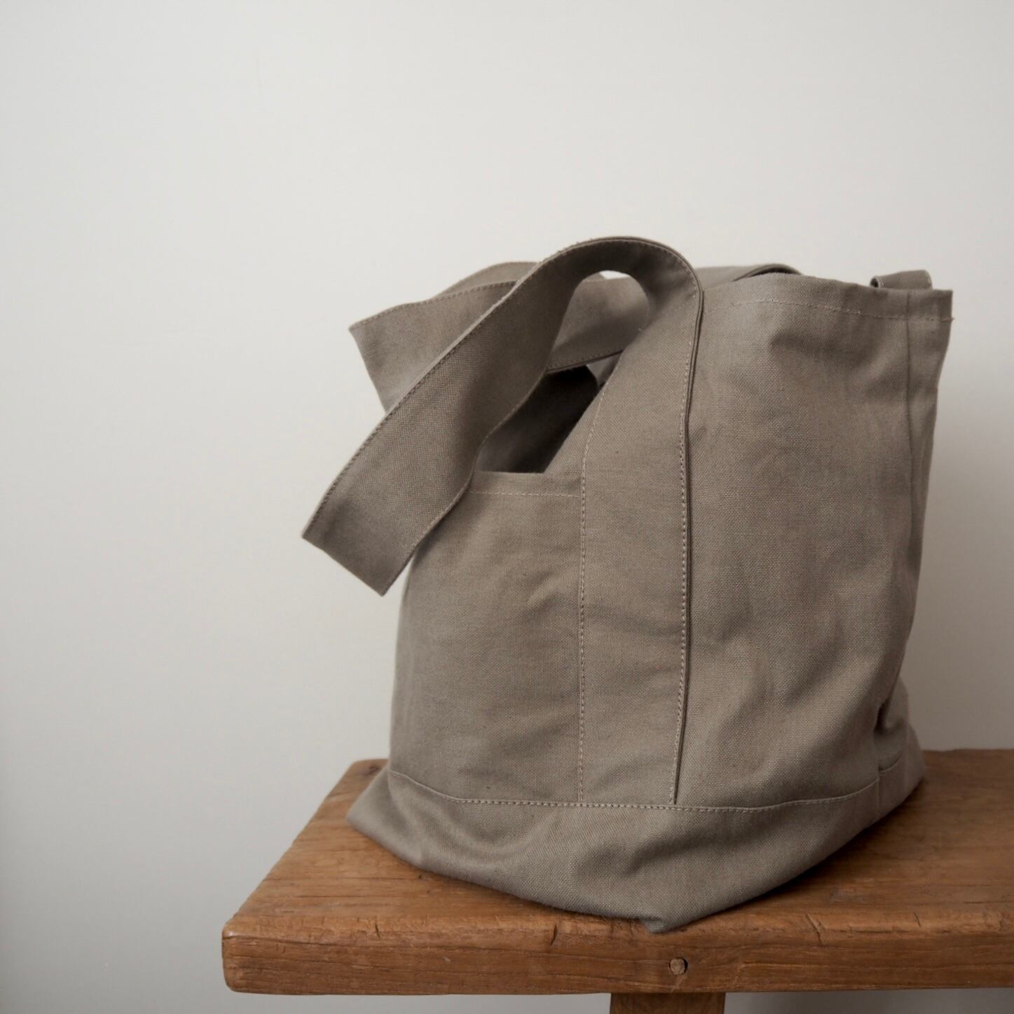 マチをたっぷり取った底が正方形に近いくらいの、ころんとしたシルエットが可愛らしい通年使えるシンプルなトートバッグです。何度か試作して大小それぞれしっくりくるサイズ感に仕上がりました。