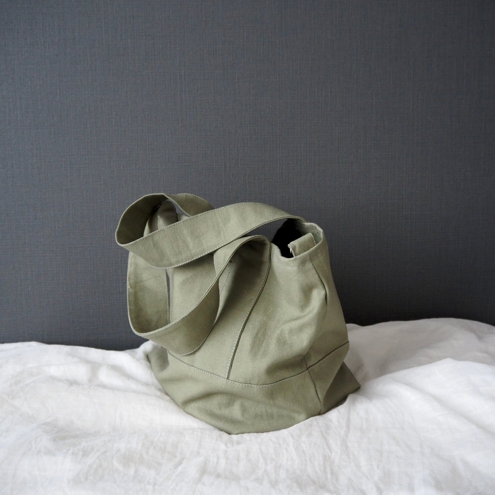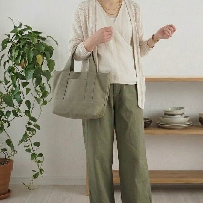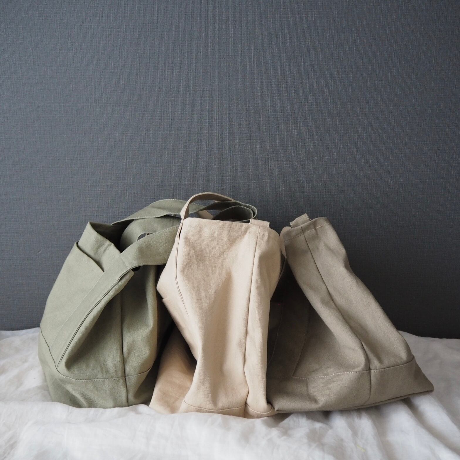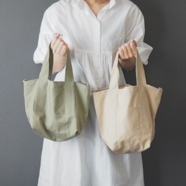 マチをたっぷり取った底が正方形に近いくらいの、ころんとしたシルエットが可愛らしい通年使えるシンプルなトートバッグです。何度か試作して大小それぞれしっくりくるサイズ感に仕上がりました。