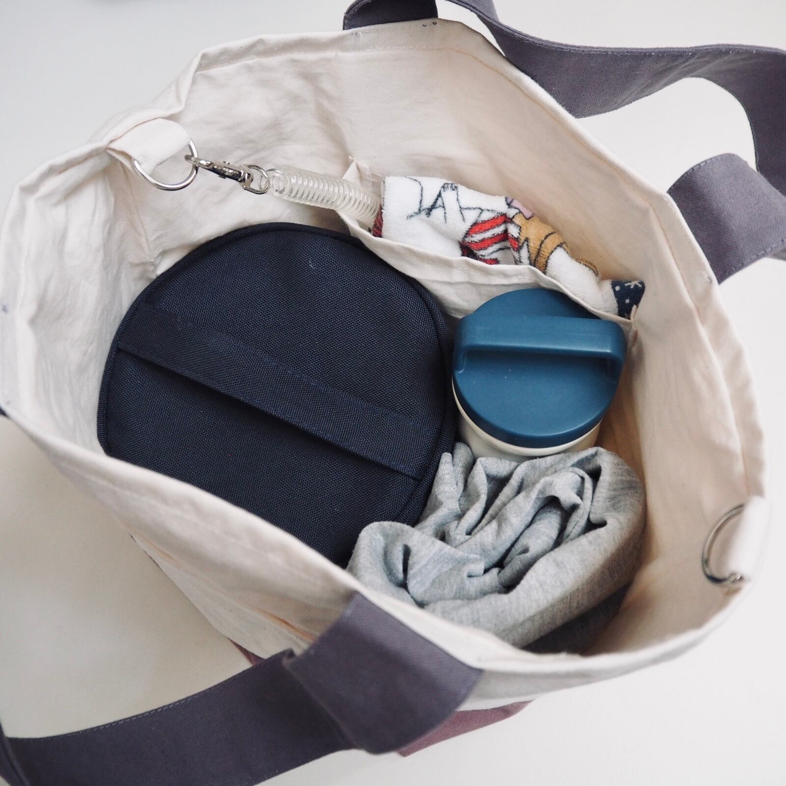 マチをたっぷり取った底が正方形に近いくらいの、ころんとしたシルエットが可愛らしい通年使えるシンプルなトートバッグです。