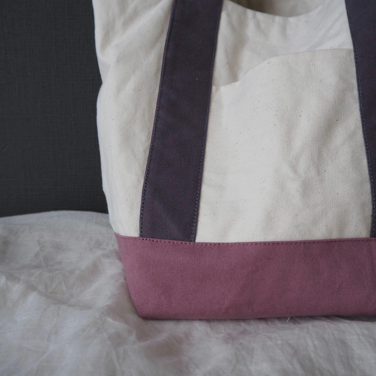 マチをたっぷり取った底が正方形に近いくらいの、ころんとしたシルエットが可愛らしい通年使えるシンプルなトートバッグです。何度か試作して大小それぞれしっくりくるサイズ感に仕上がりました。