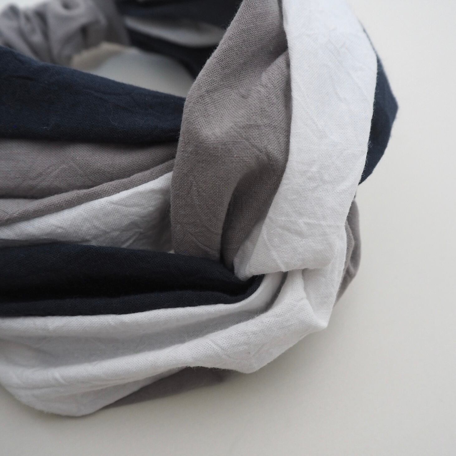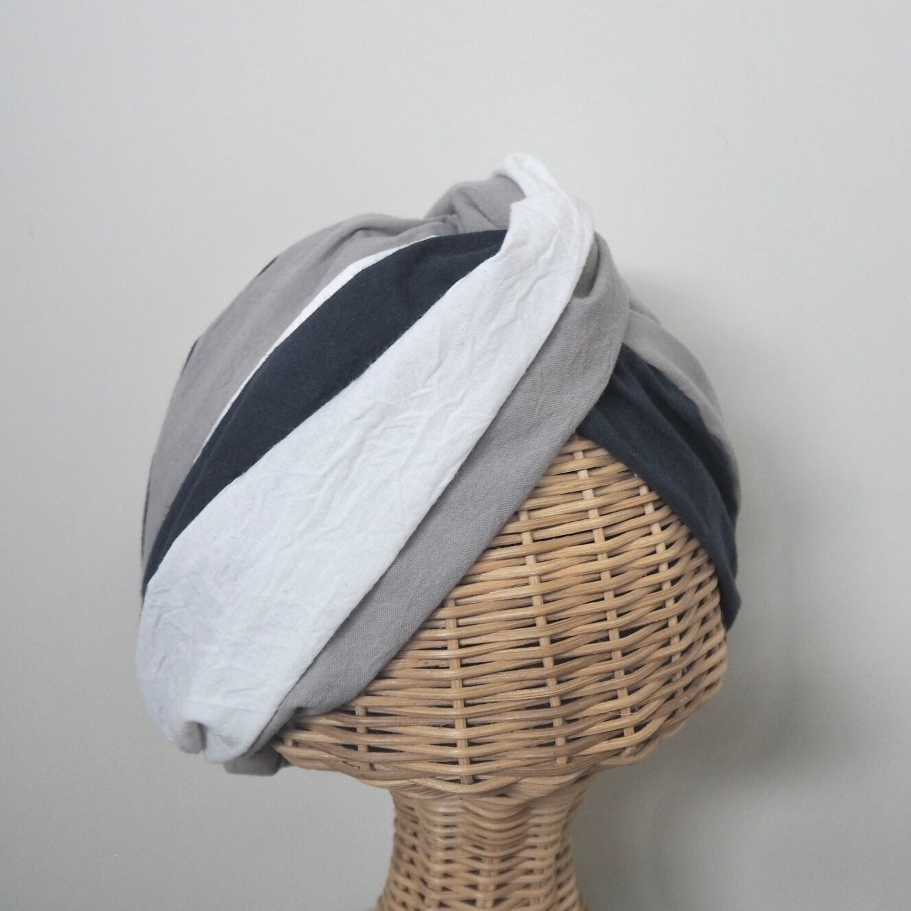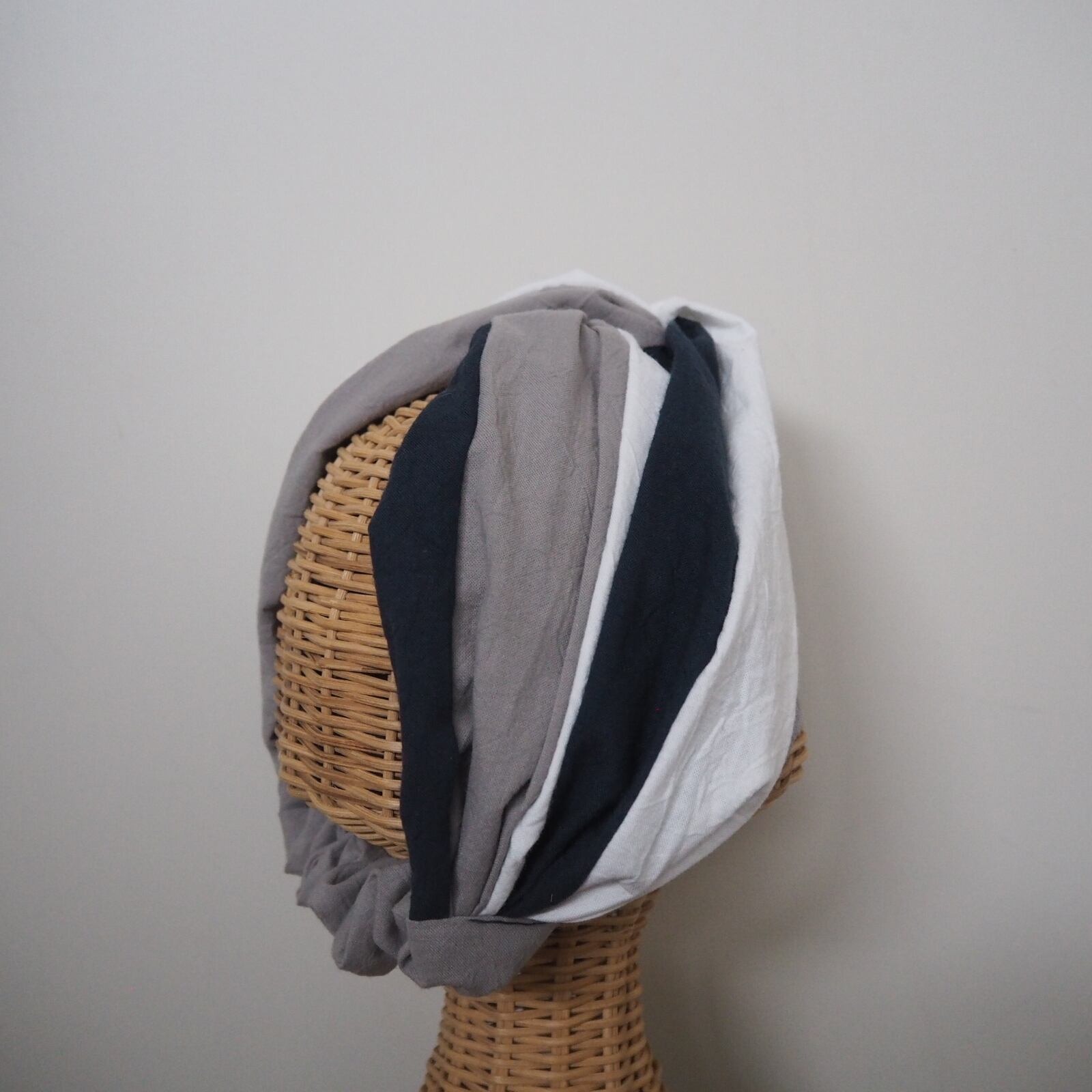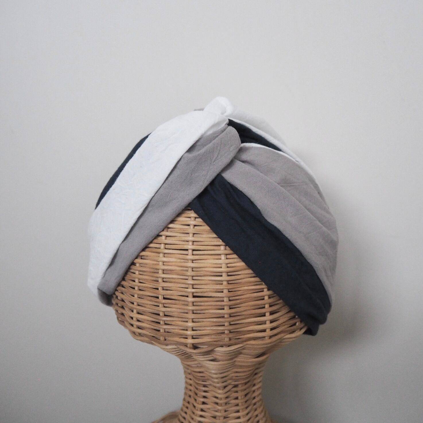 切り替え 幅広 ヘアターバン (結び) ☆ ワッシャー ホワイト × グレー× ネイビー