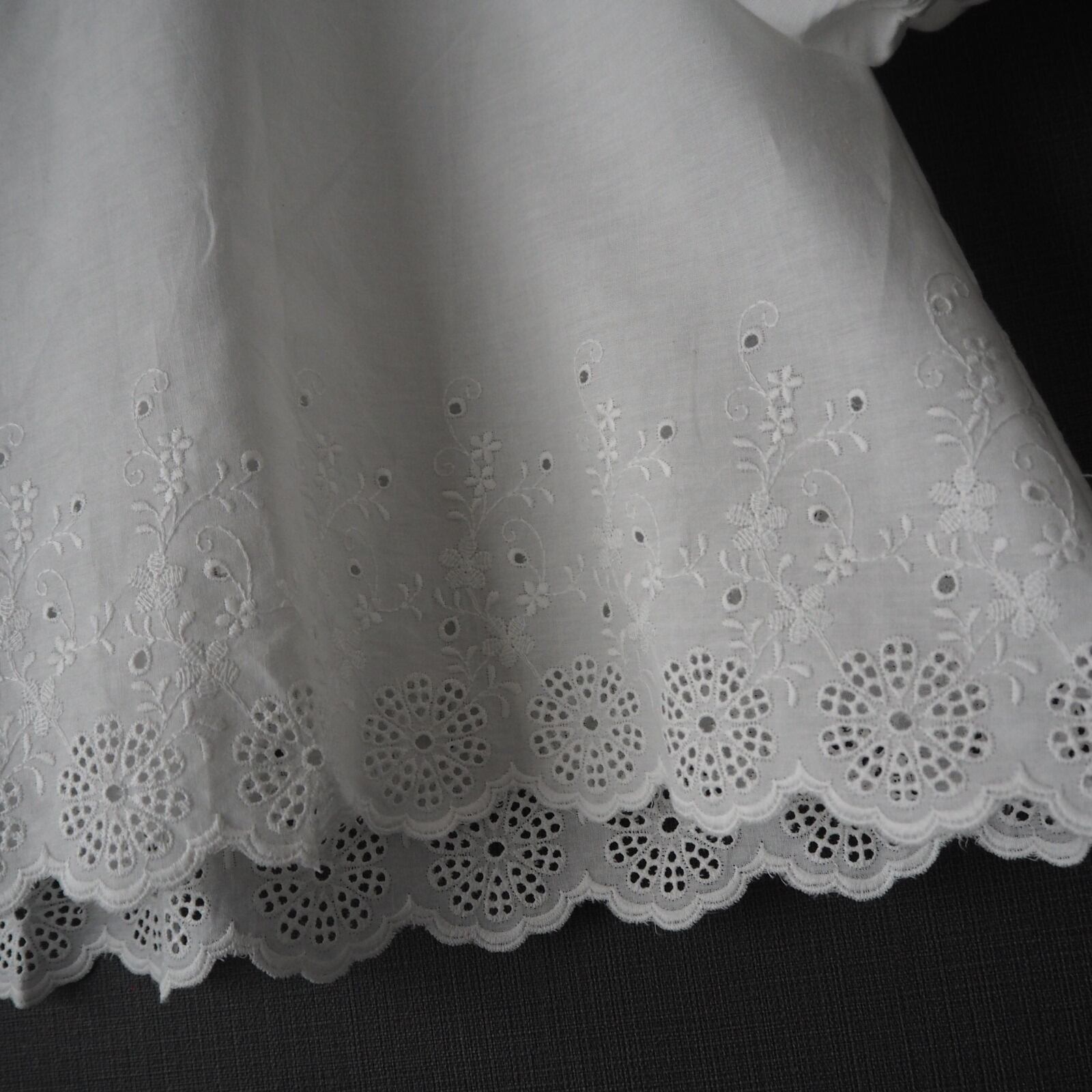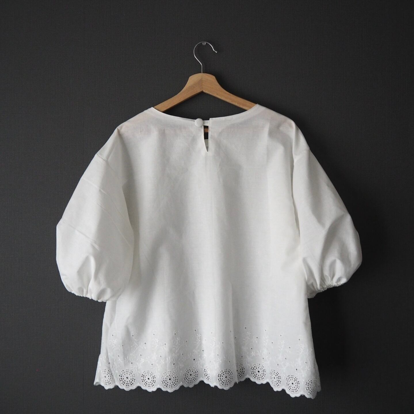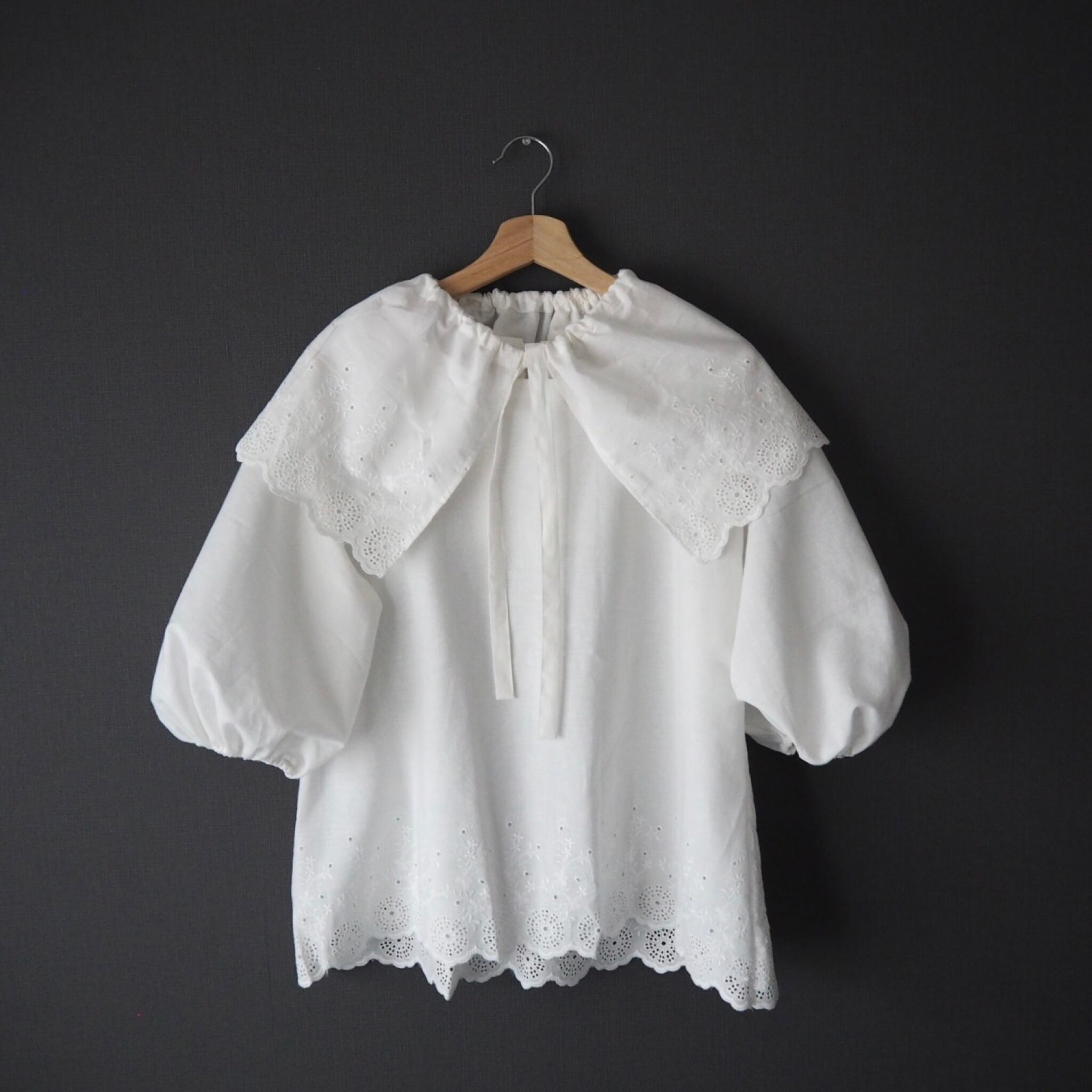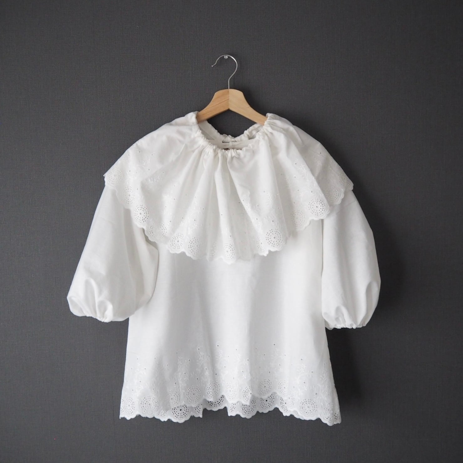 スカラップレース装飾を裾と襟部分に使用したボリュームのあるバルーン袖のブラウスです。