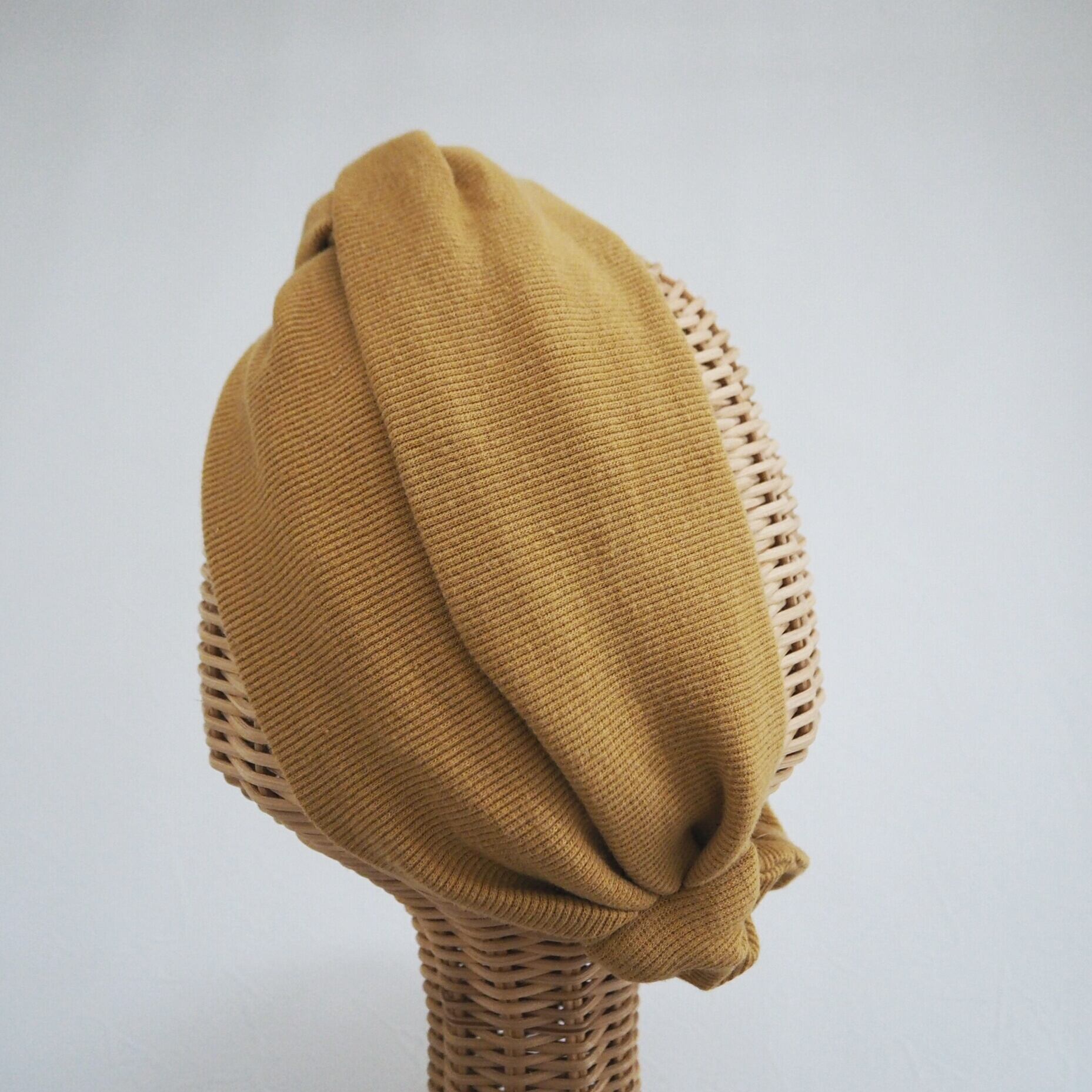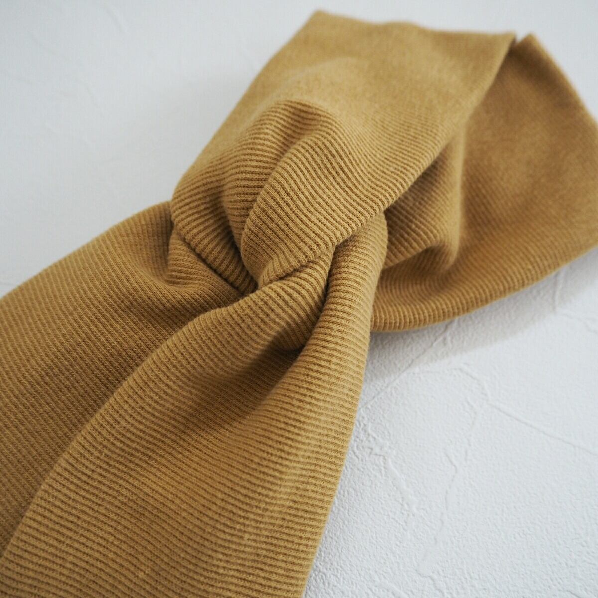 秋を意識した綺麗なマスタード色のリブニットを使用した結び目の様なデザインの二本使いのヘアバンドです。(以前のものより少し薄い色になります。)