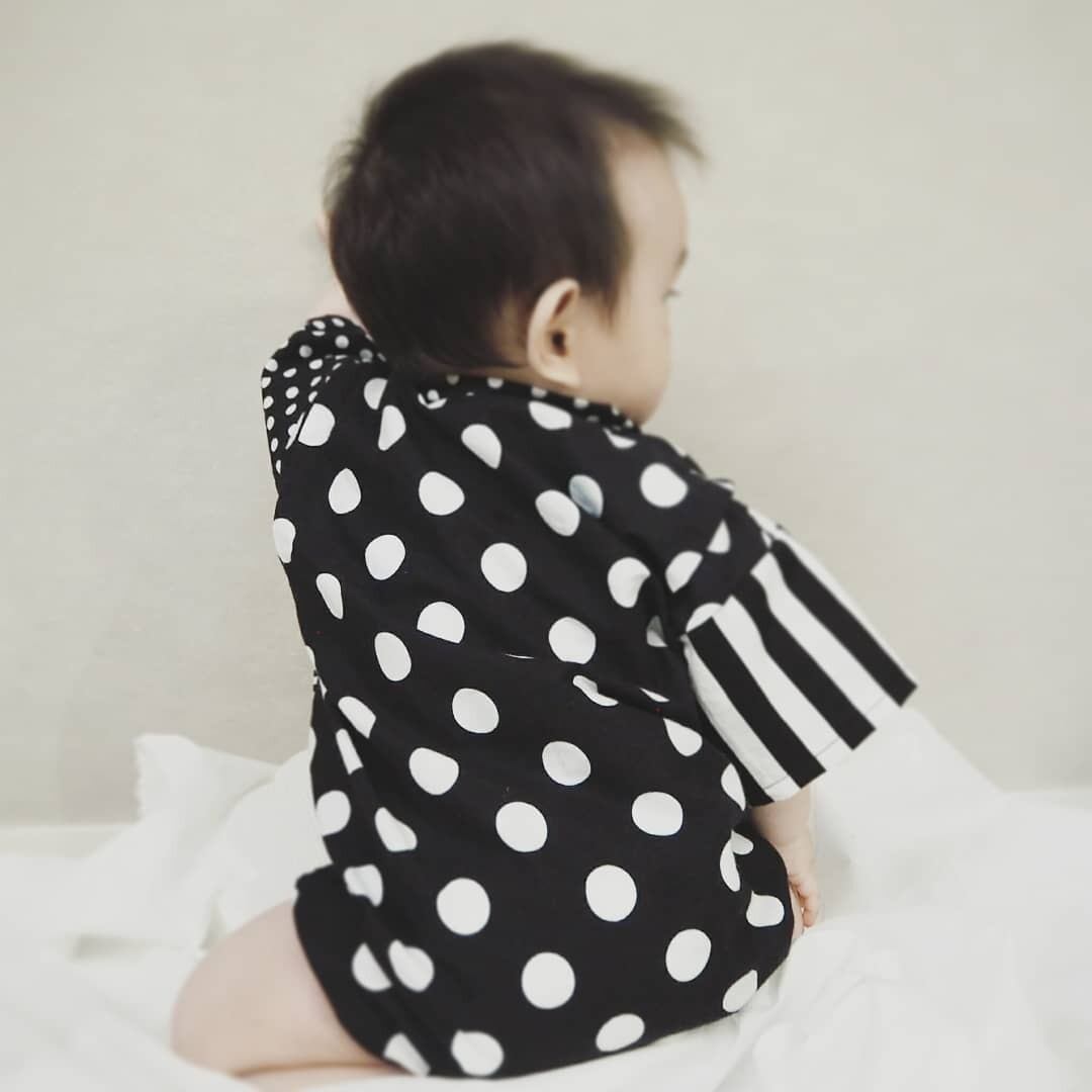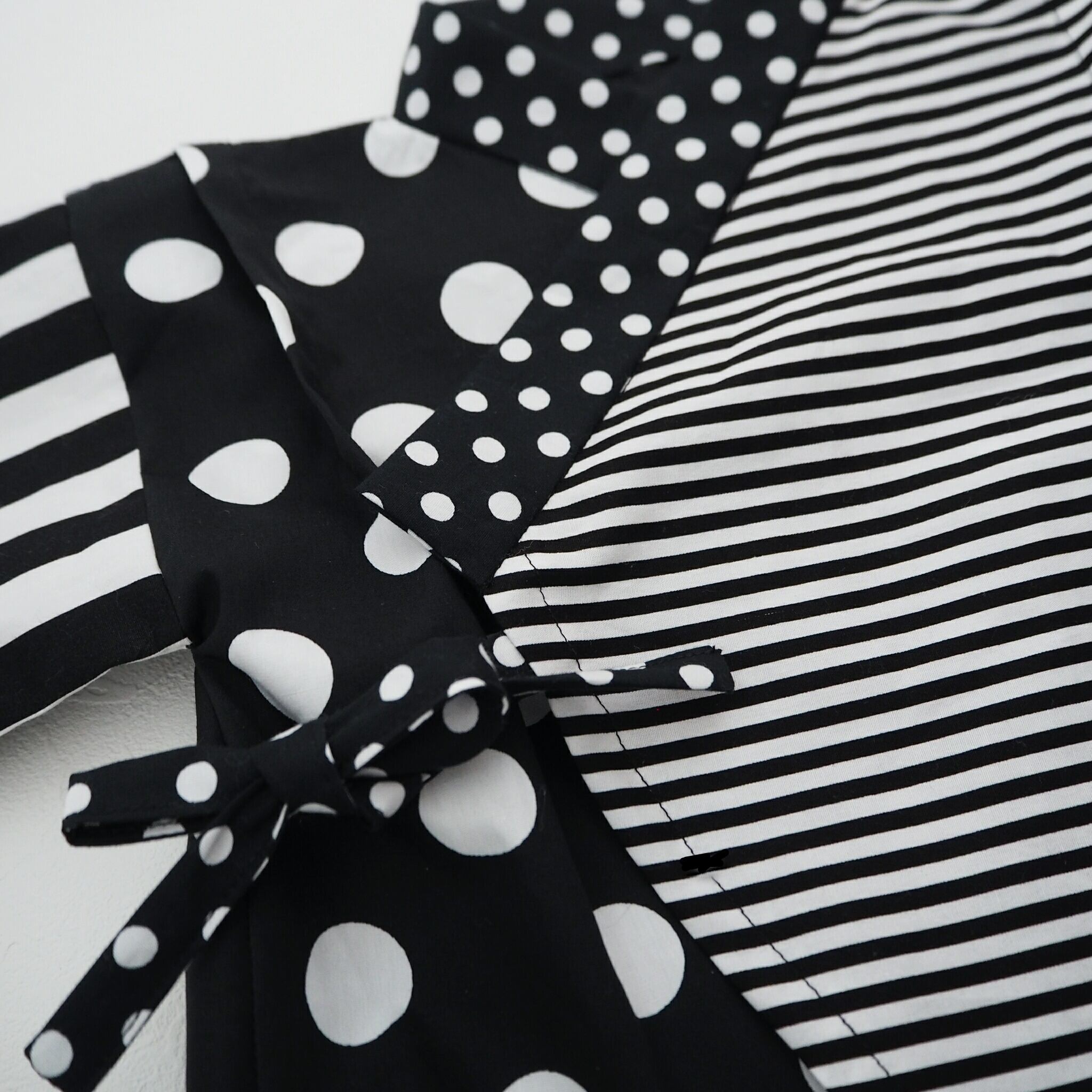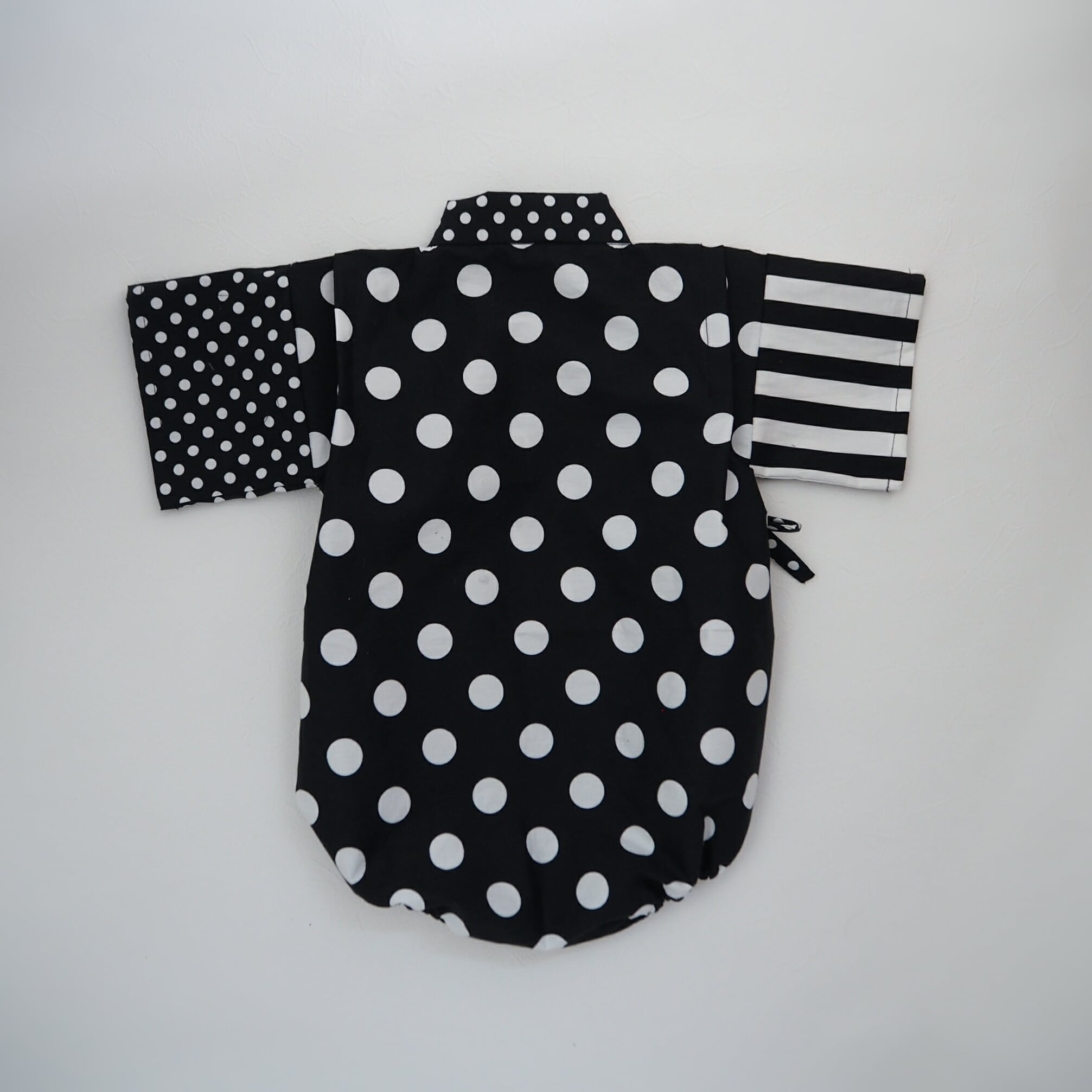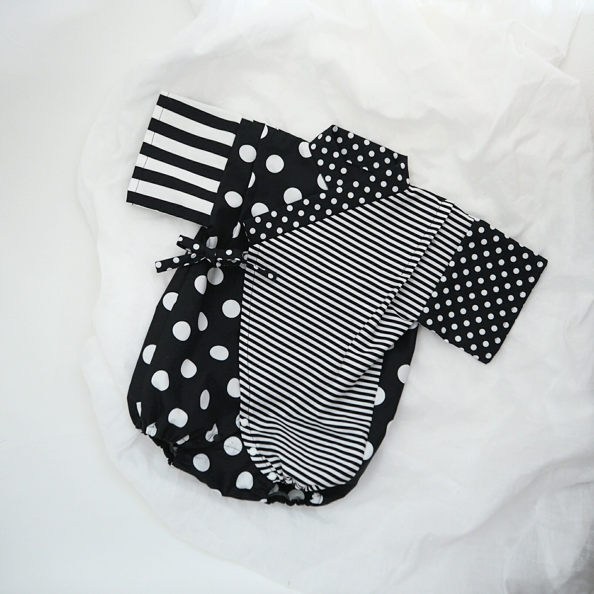 モノトーンの水玉とストライプボーダー組み合わせで作った、シンプルながらも個性的な印象を与えてくれる赤ちゃん用の浴衣(甚平)です。