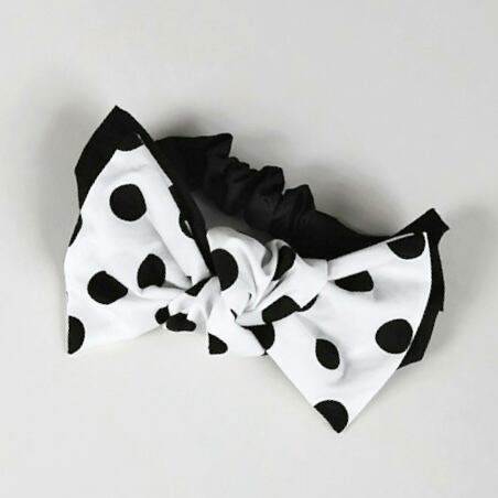 黒の綿素材を使用した結び目の様な二本使いのヘアバンドに取り外し出来るドットのリボンを付けました。