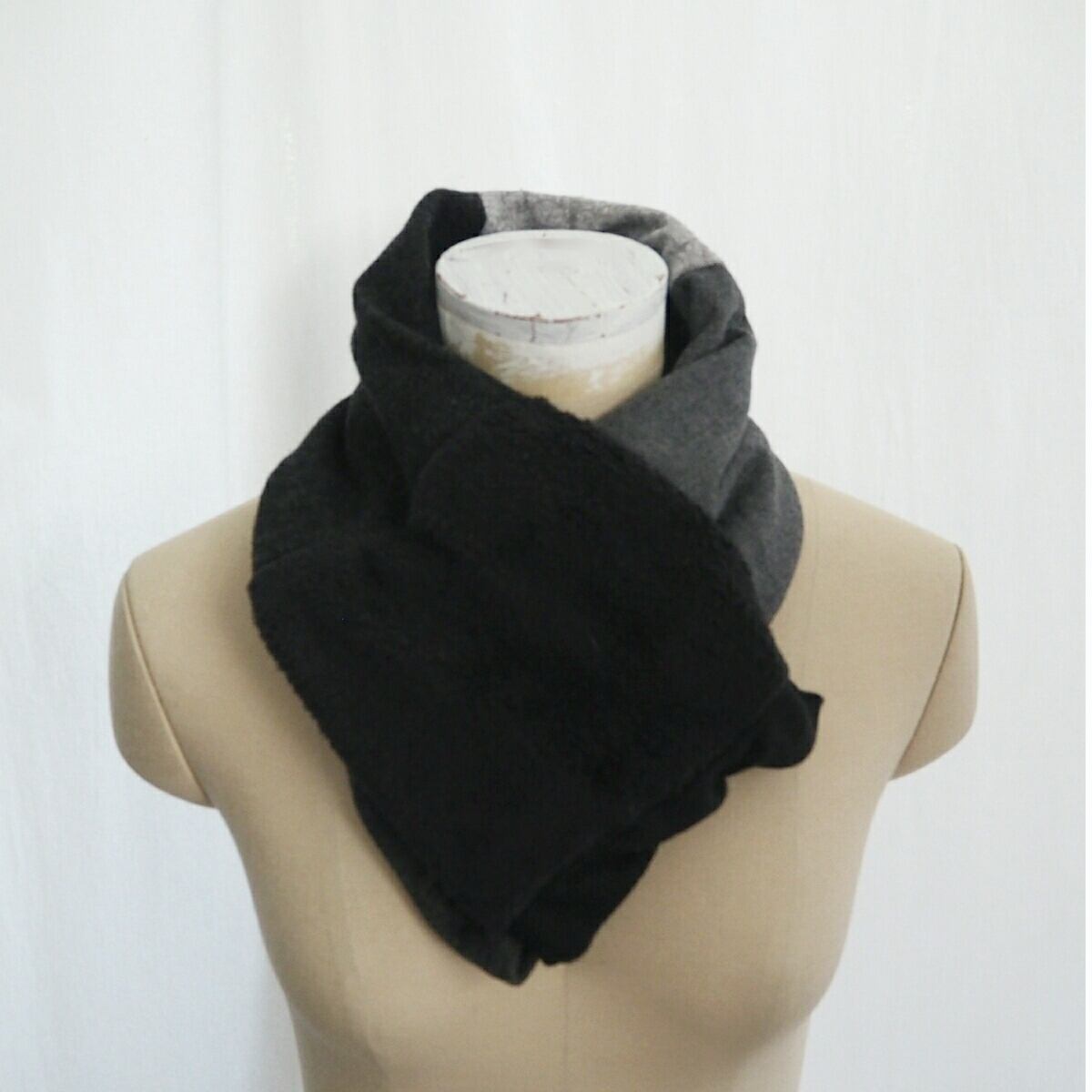 ニット、ファー、レース、カットソー生地などをパッチワークのように組み合わせた、輪になったネックウォーマーです。