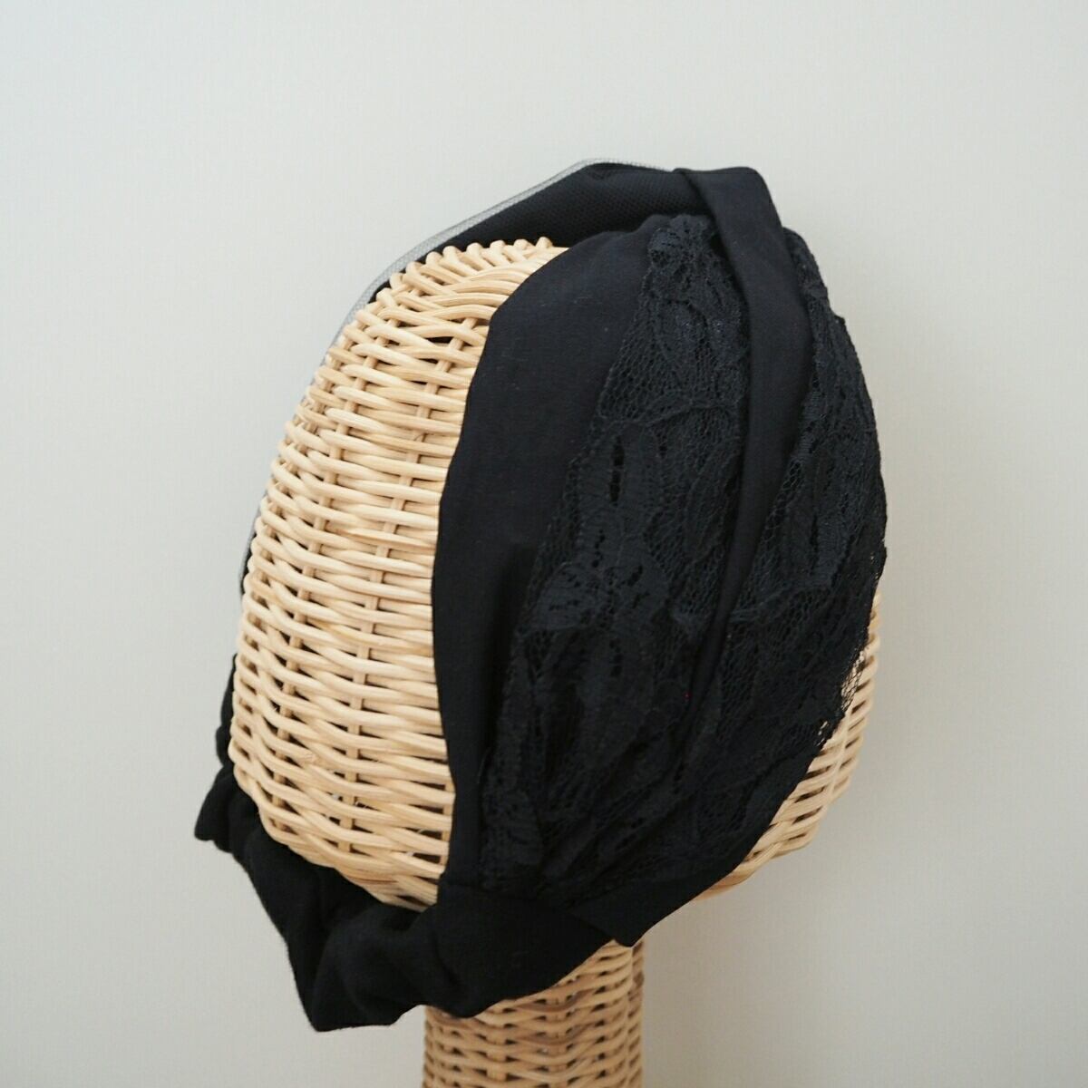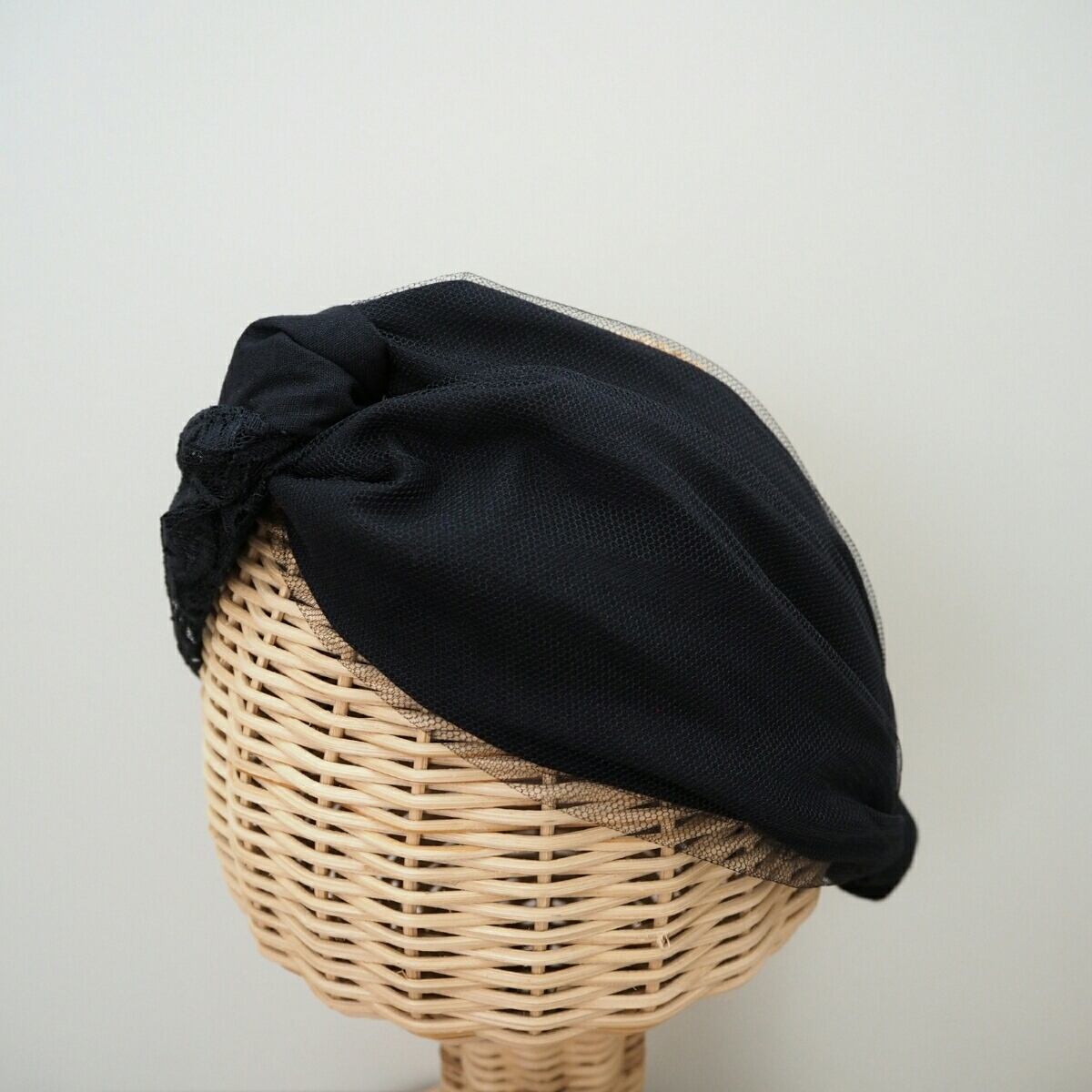 黒の綿素材に左右アシンメトリーにレースとチュールを装飾して華やかに仕上げた結び目の様な二本使いのヘアバンドです。