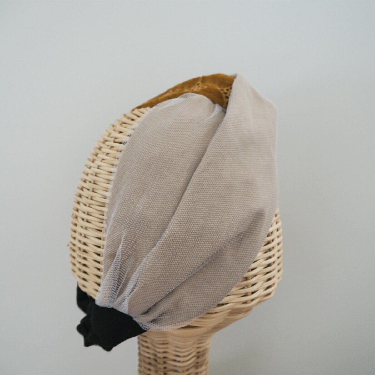 素敵なマスタードイエローのベロア生地と綿のベージュ生地に白のチュールを組み合わせた、結び目の様な二本使いのヘアバンドです。