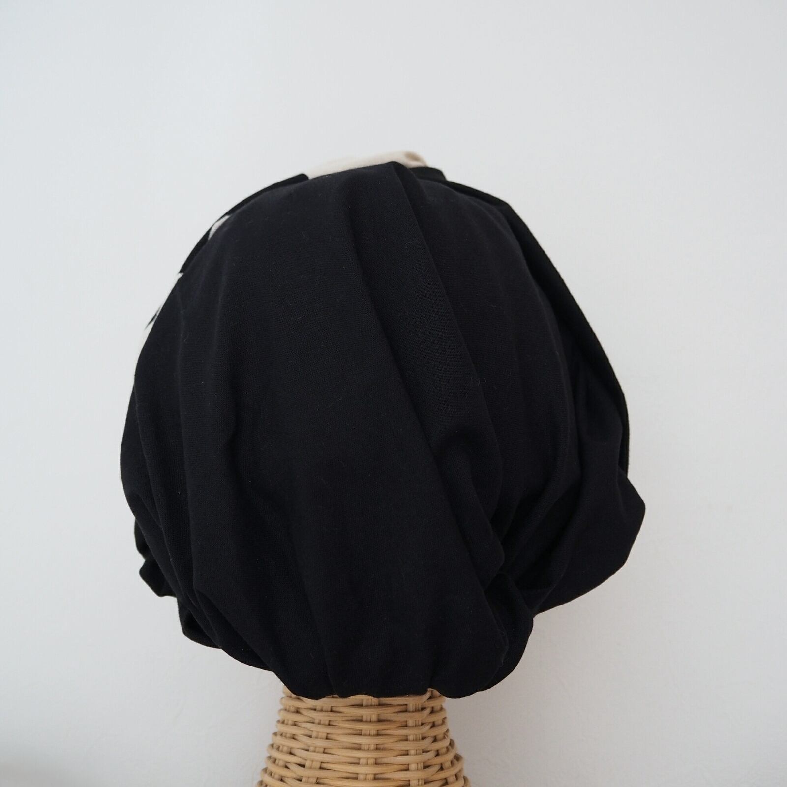 カフェオレベージュに黒、モノトーンのストライプ生地を組み合わせた結び目の様な二本使いのヘアバンドです。