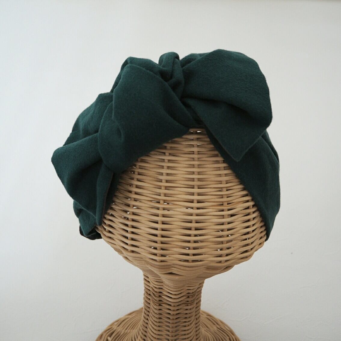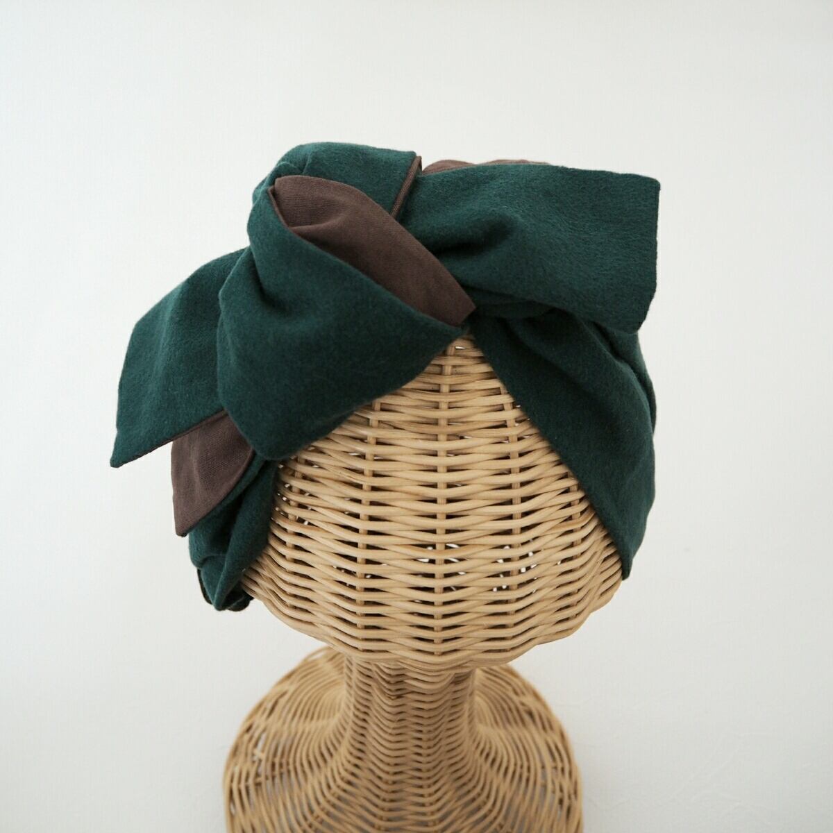 少し起毛した深みのあるグリーンの結び目の様な二本使いのヘアバンドに取り外し可能なリボンをつけました。
