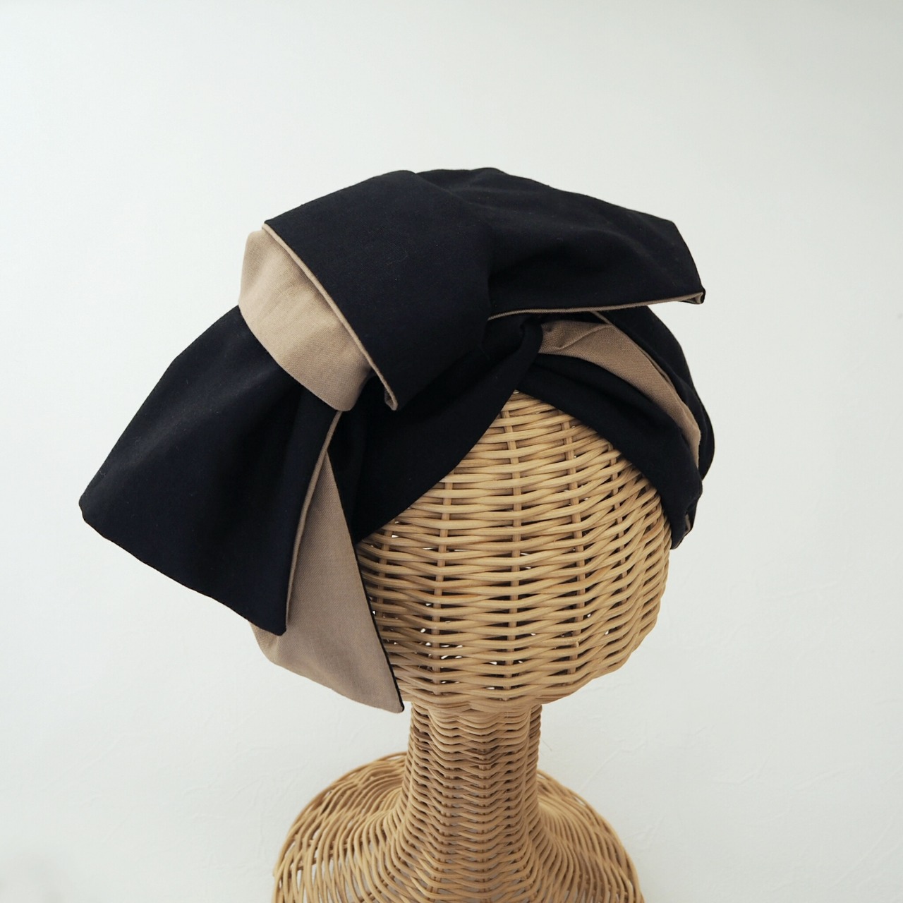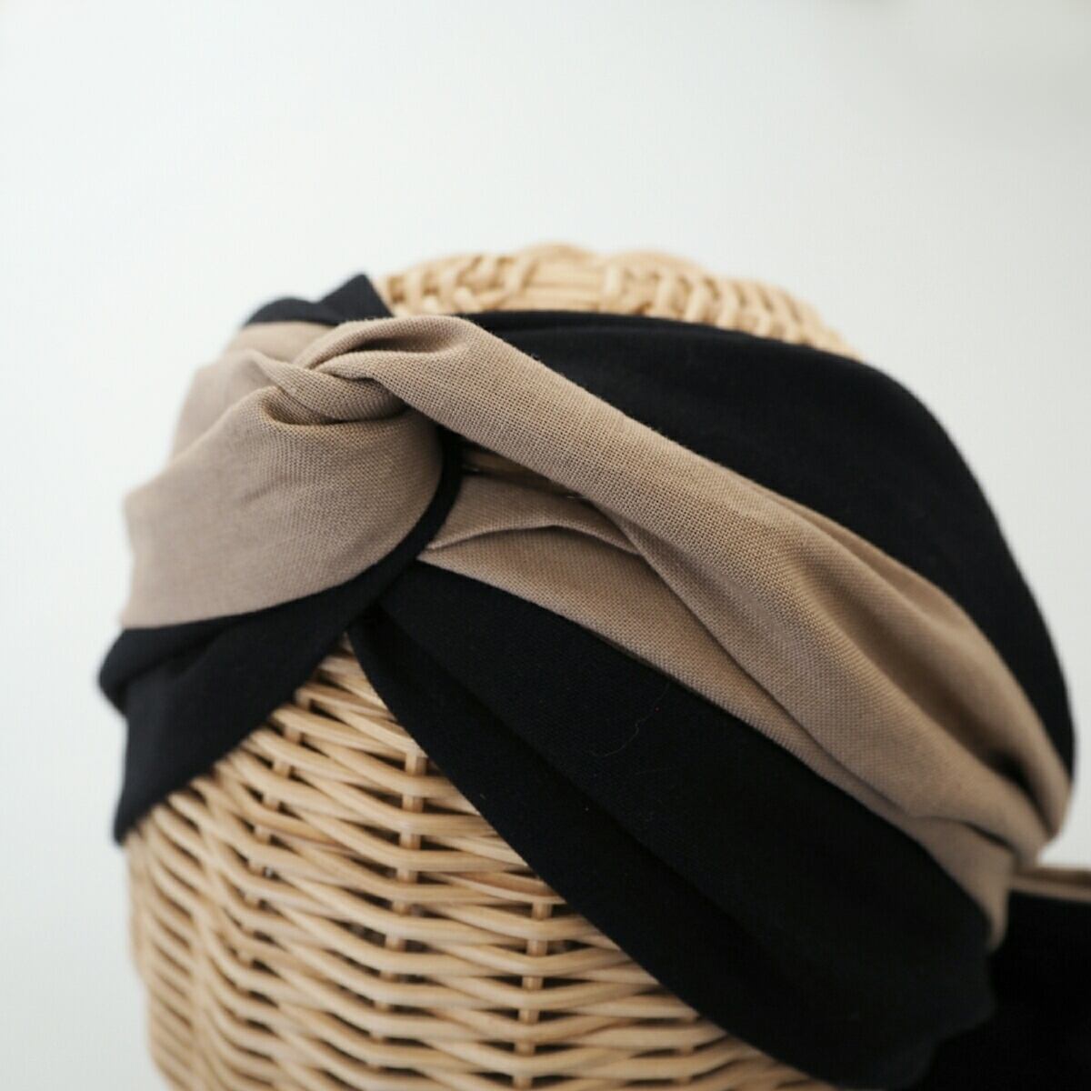 こちらは黒とベージュの組み合わせで、ベース部分は黒とベージュを切り替えて結び目の様にクロスにして仕上げ、両サイドからリボンをリバーシブルになるように挟みました。