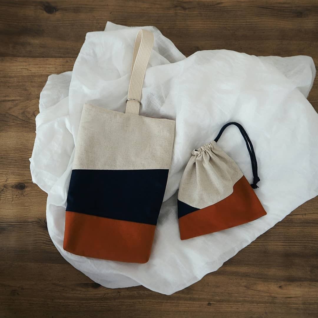 テラコッタ、ネイビーの綿生地、ナチュラルな綿麻生地を組み合わせて作ったシューズバッグ(上履入れ)と巾着のセットです。
