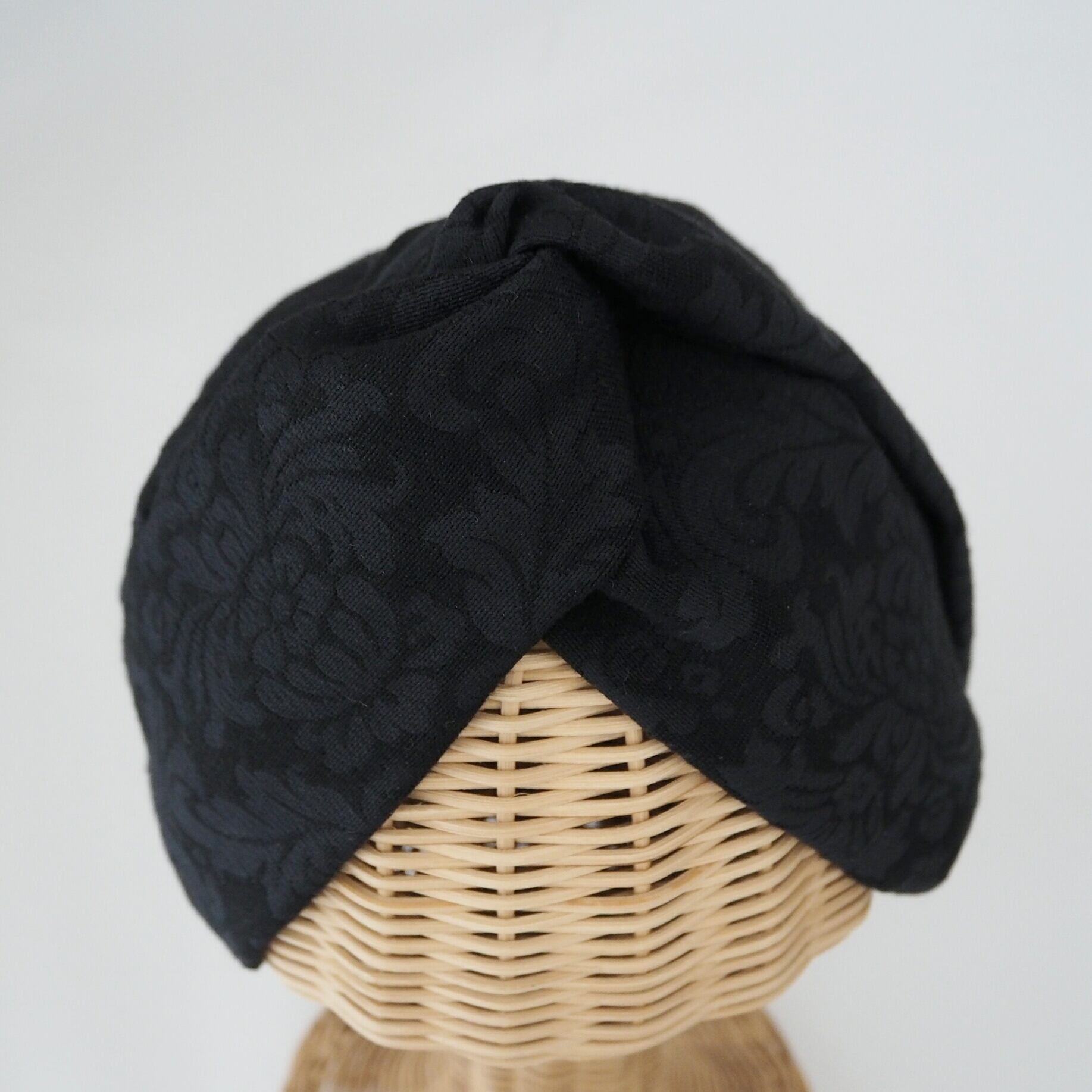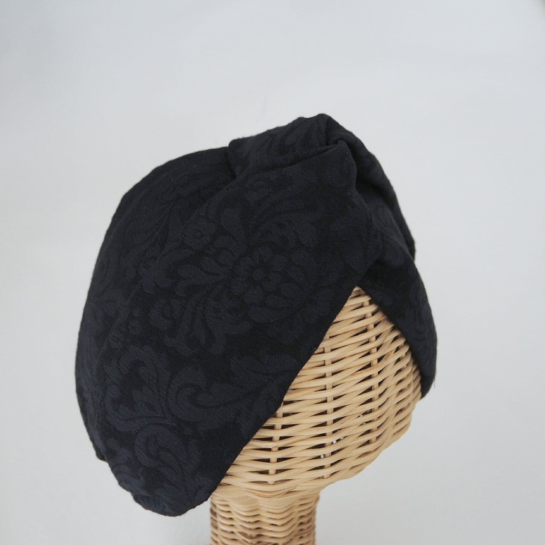 光が当たると浮き上がる模様が上品で素敵な黒のサテンジャガード生地で作った結び目の様な二本使いのヘアバンドです。