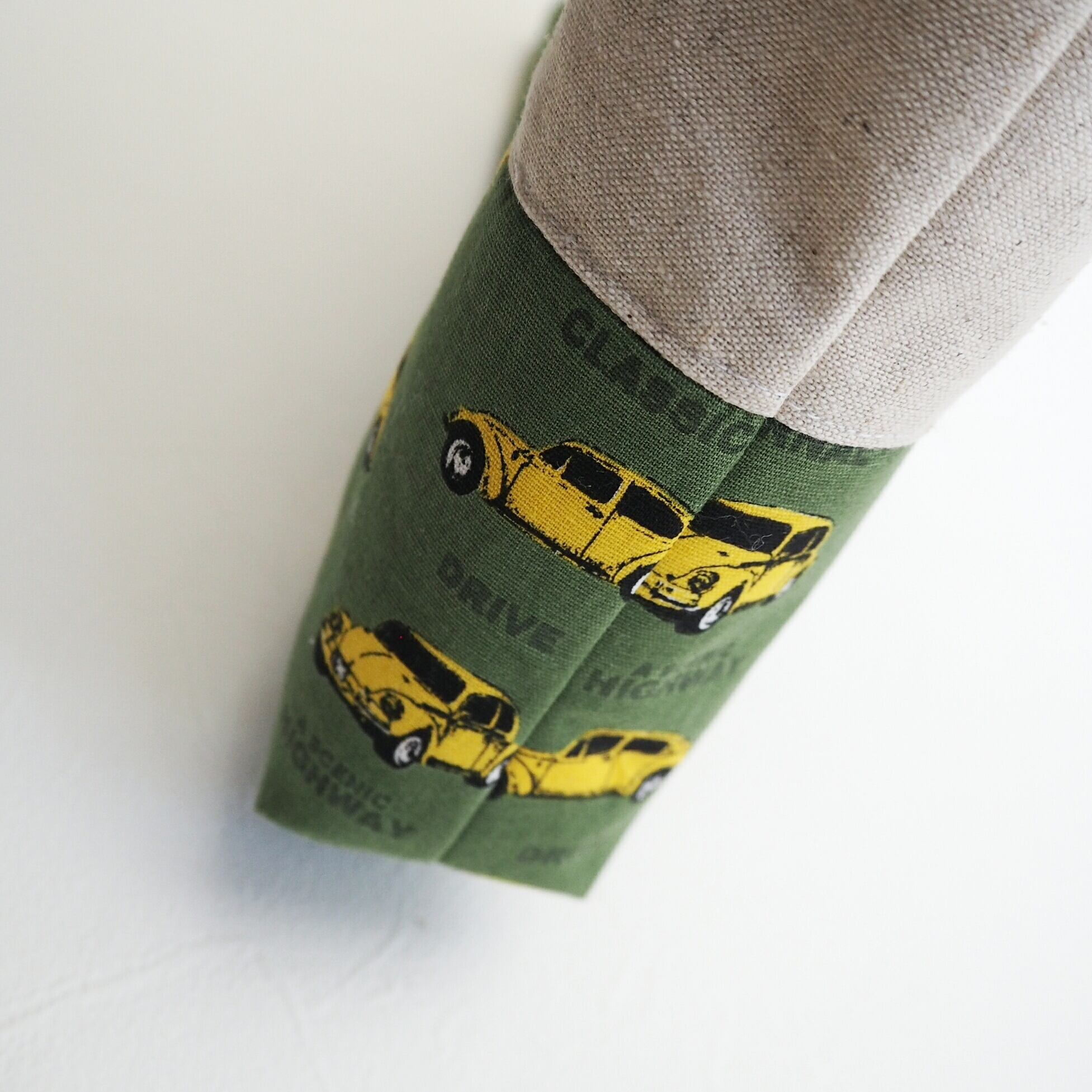 ナチュラルな綿麻キャンバス生地とキミドリに黄色の車のプリントの綿生地で作った手提げバッグと上履き入れのセットです。