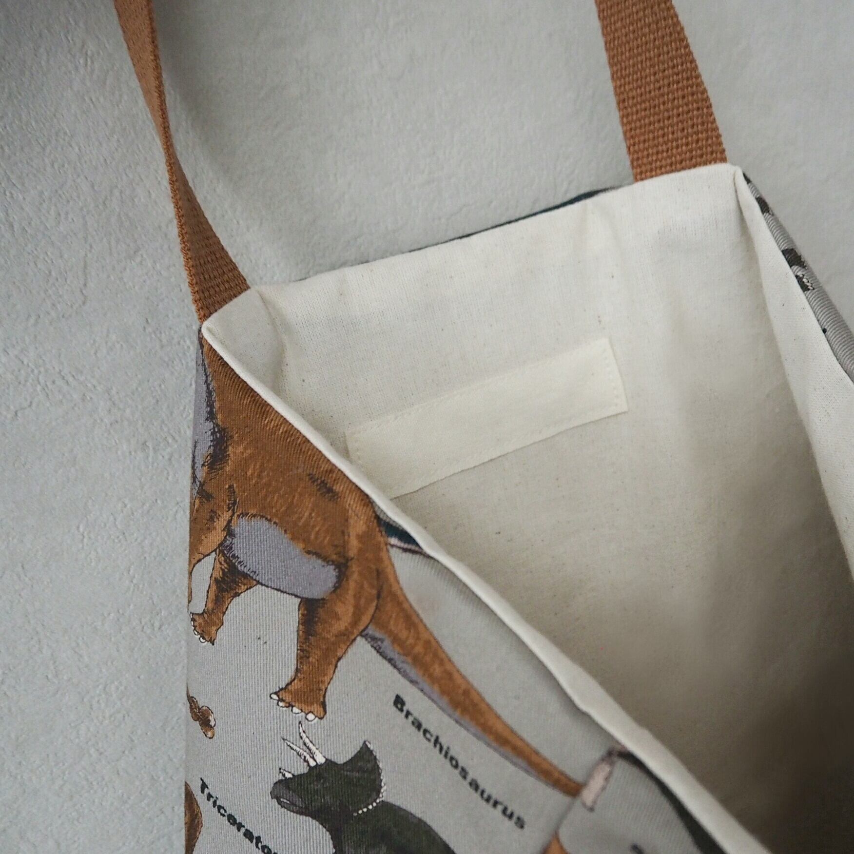 カッコ良いリアルな恐竜がプリントされた生地とネイビーの生地を組み合わせた手提げバッグと体操服入れ、巾着のセットです。