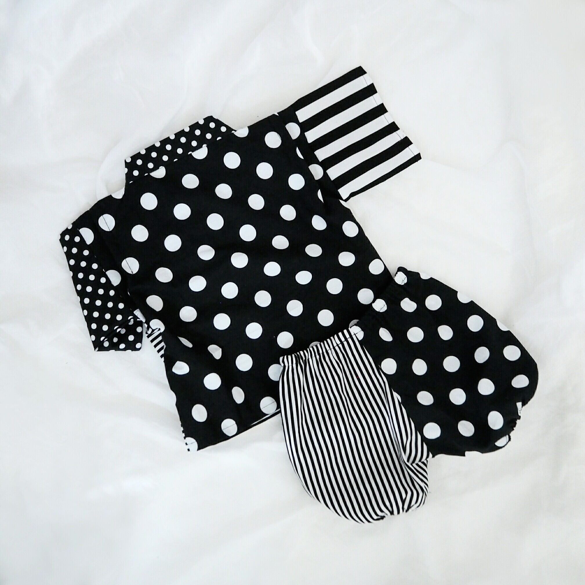 モノトーンのドットと太×細ストライプボーダーの組み合わせで作った、浴衣(甚平)です。
