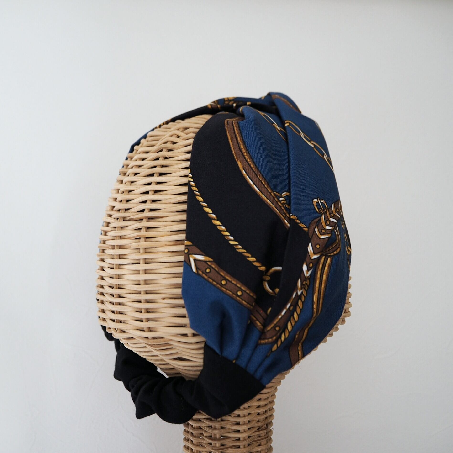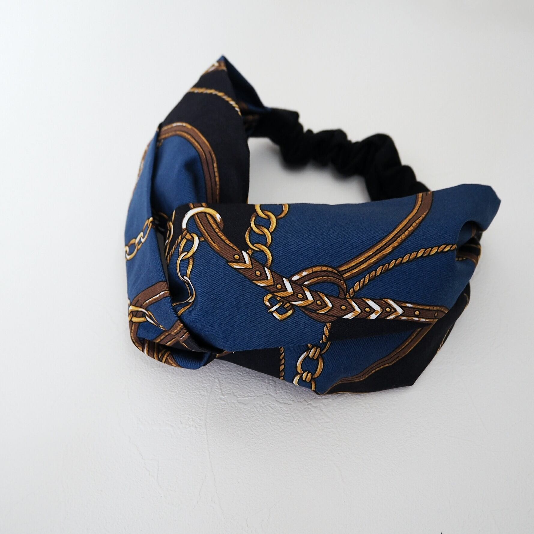 ゴールドのチェーンやバックルのプリントが目を引く素敵なスカーフ柄の生地で作った、結び目の様な二本使いのヘアバンドです。