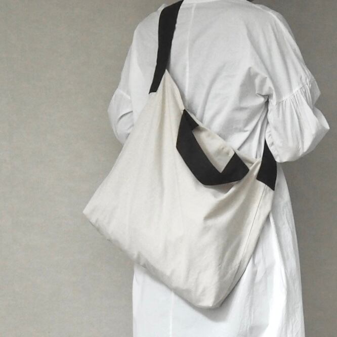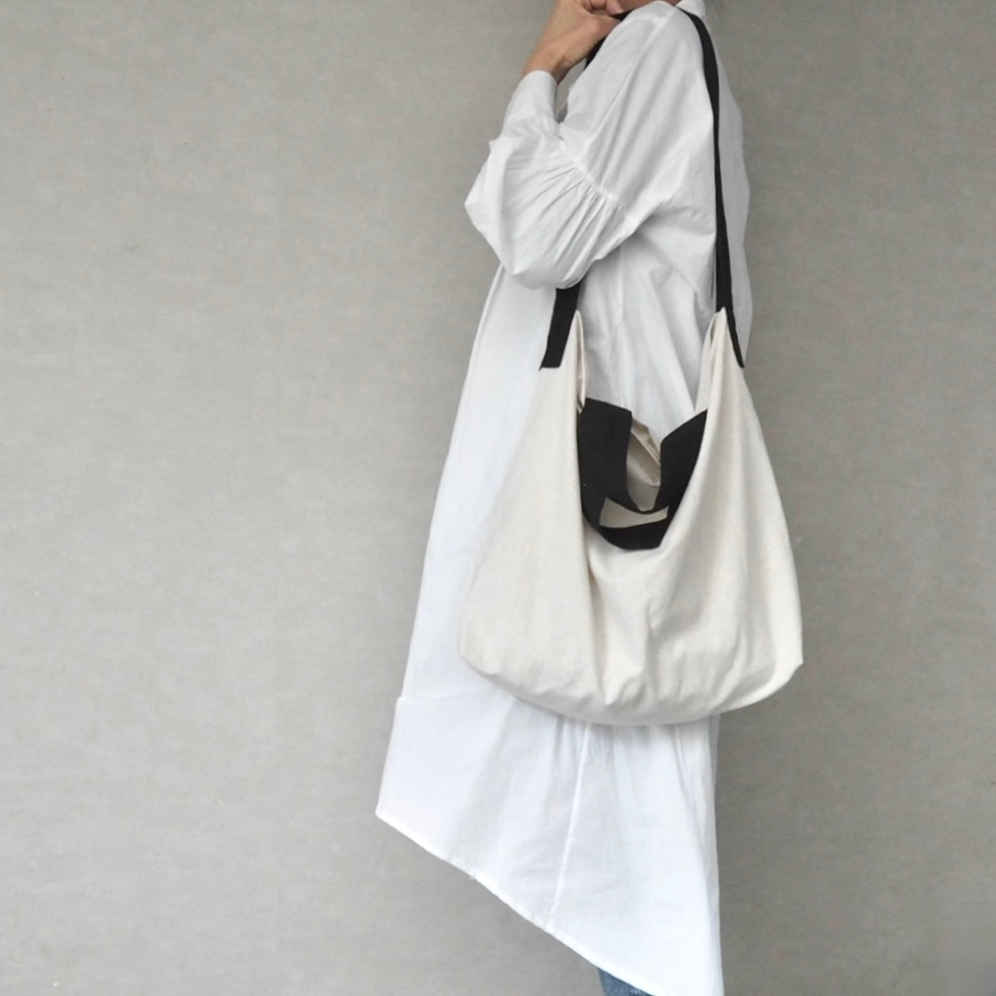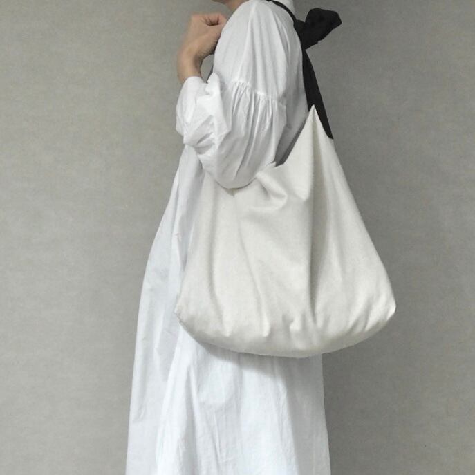 ショルダー紐は斜めがけできる長さで、結んで短めにしたり、中にしまえばシンプルな手提げにもなります。
