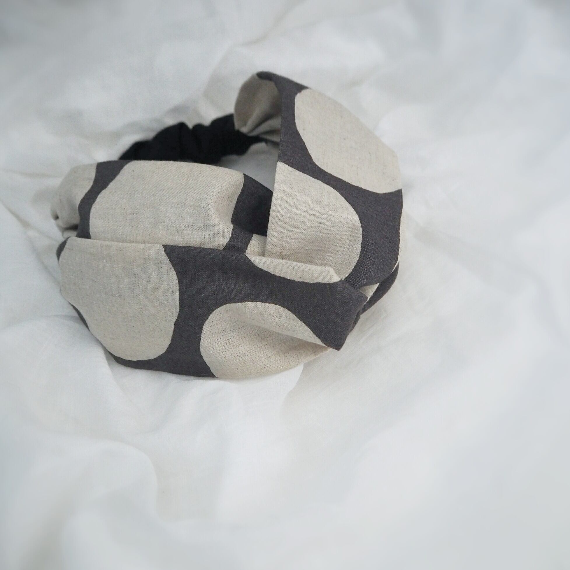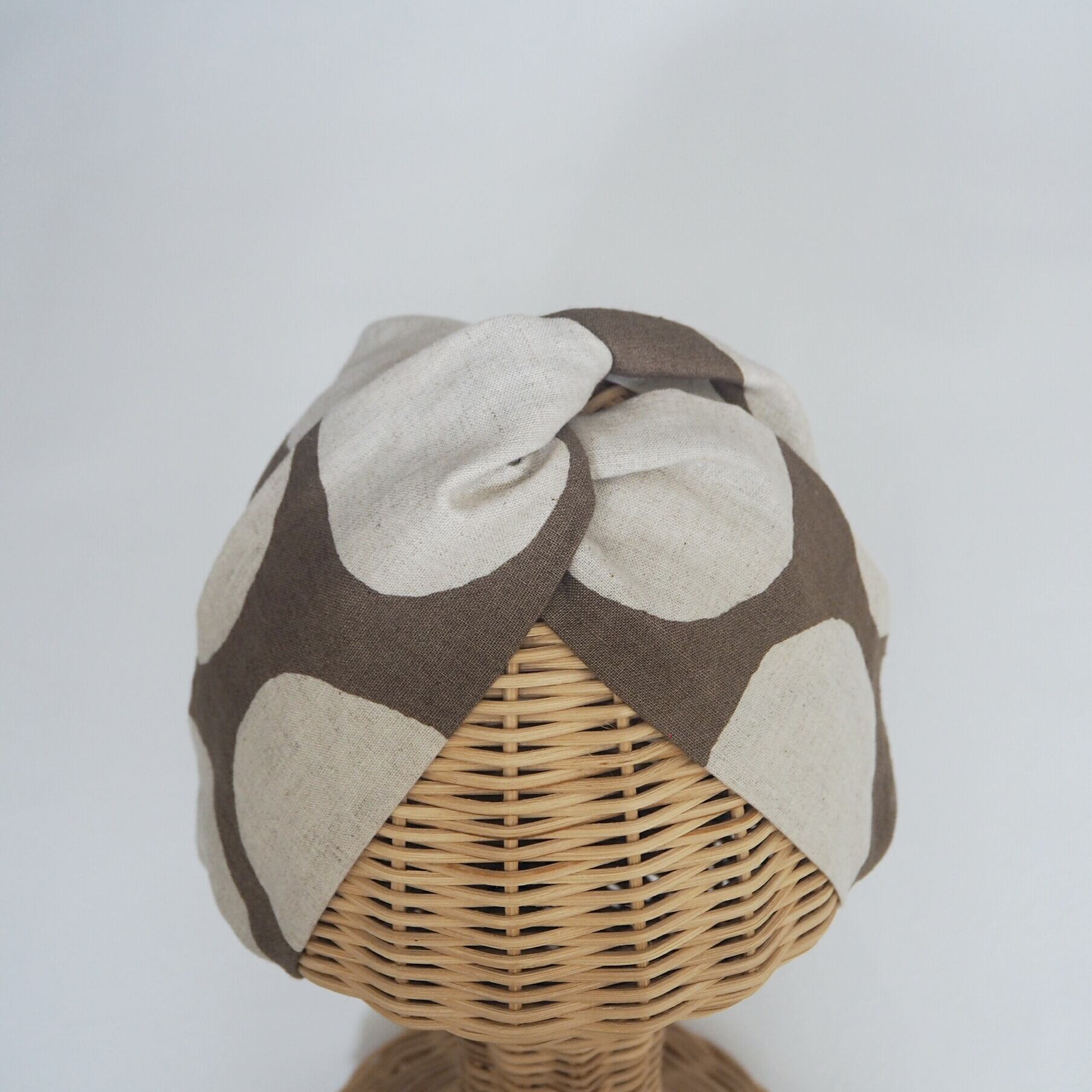 くすみ系のブラウン、グレーにナチュラルの大きな水玉が目を惹く結び目の様な二本使いのヘアターバンです。