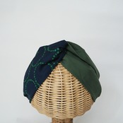 落ち着いたグリーンとネイビーにグリーンの丸いプリントが可愛い、結び目の様な二本使いのヘアバンドです。