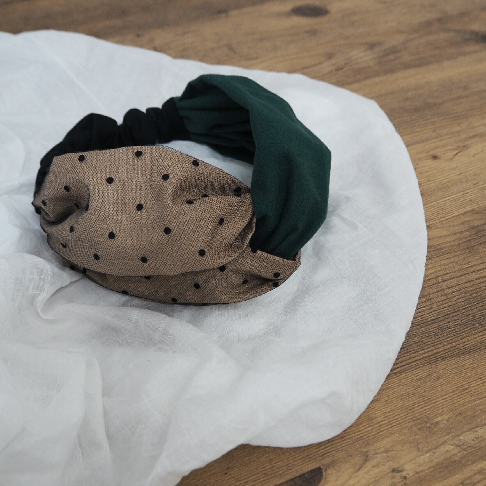 深みのある緑色の生地とベージュに黒のドットチュールを組み合わせた、結び目の様な二本使いのヘアバンドです。