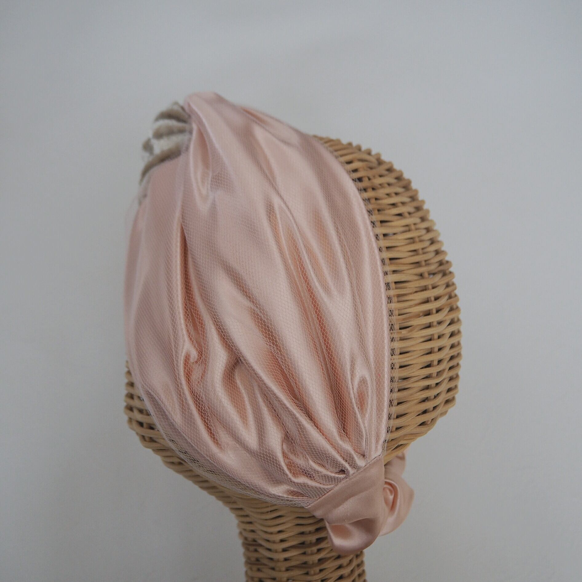 秋冬らしいベロア生地と光沢のあるサテン生地にチュールを組み合わせた、結び目の様な二本使いのヘアバンドです。