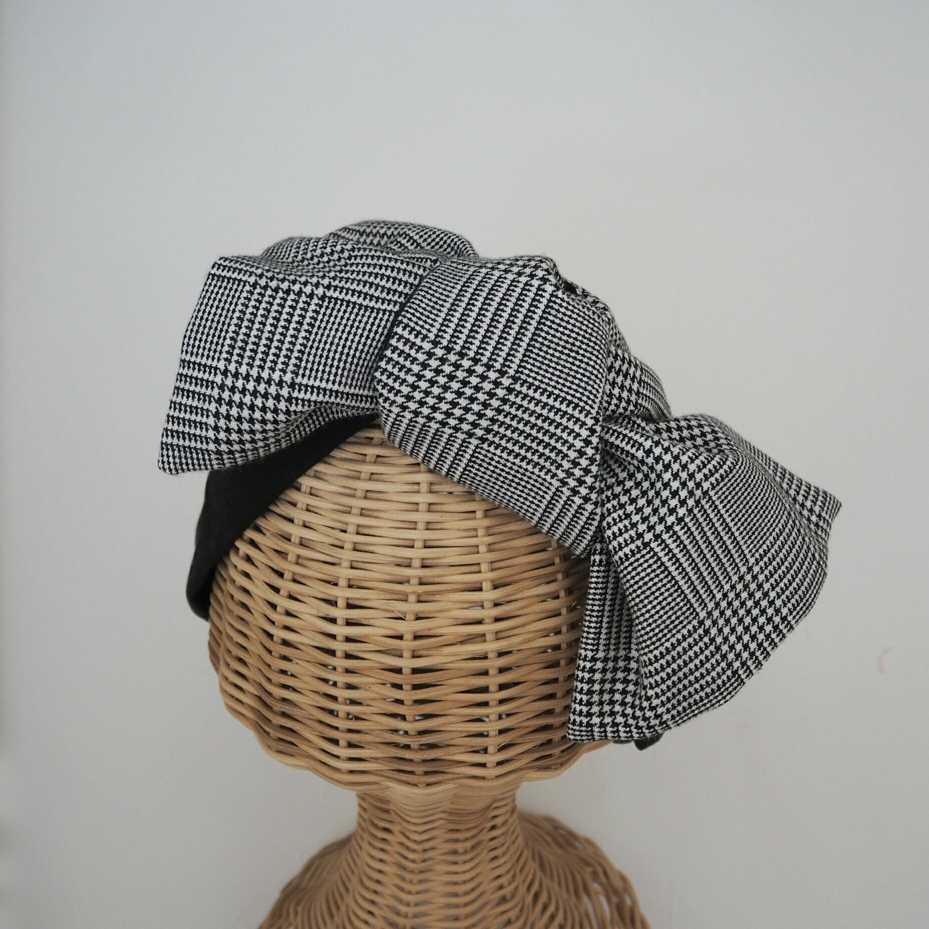 グレンチェック生地と黒の生地を使用した、結び目の様な二本使いのヘアバンドに取り外し出来るリボンをつけました。