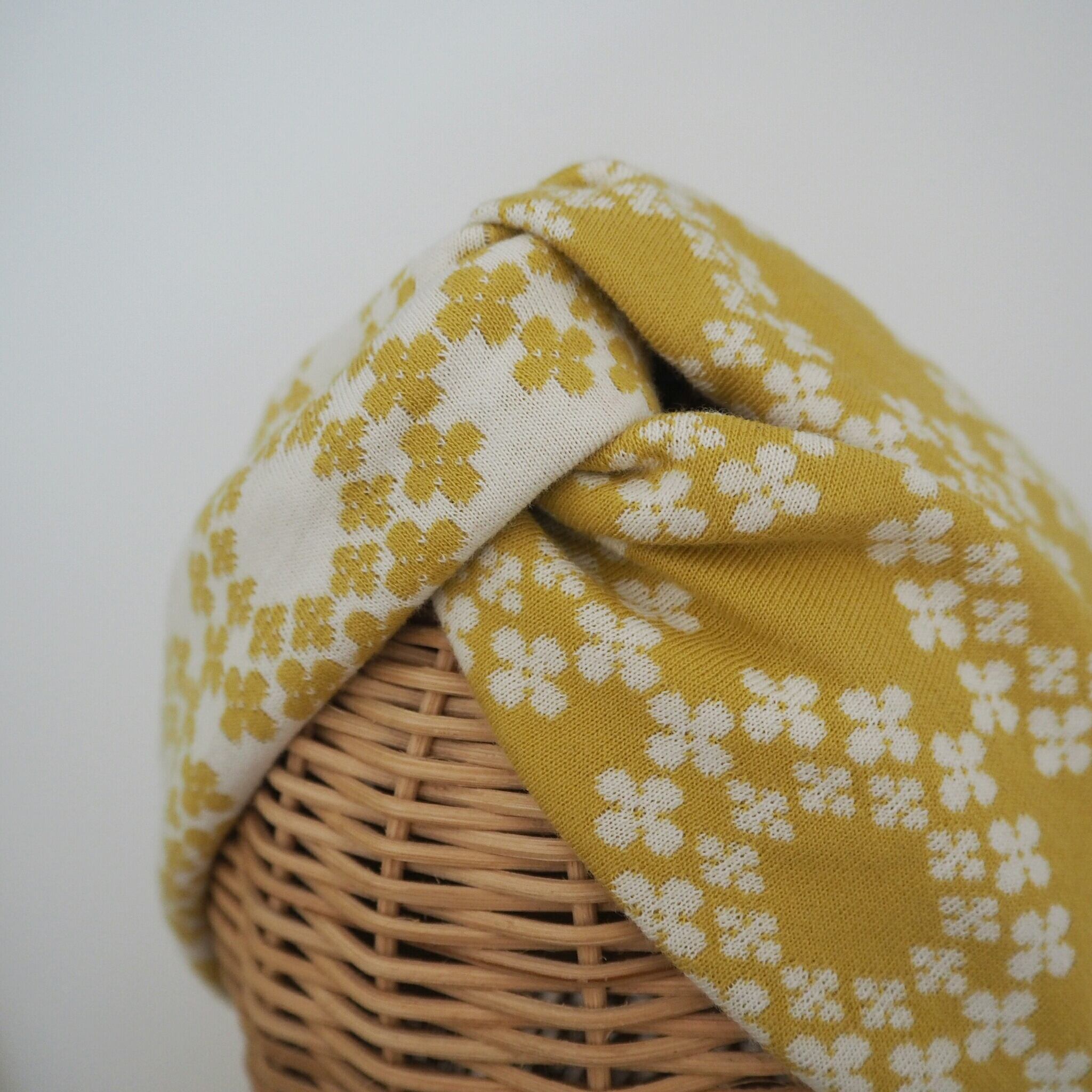 マフォンのミモザ柄のニット生地で作った結び目の様なデザインの二本使いのヘアバンドです。