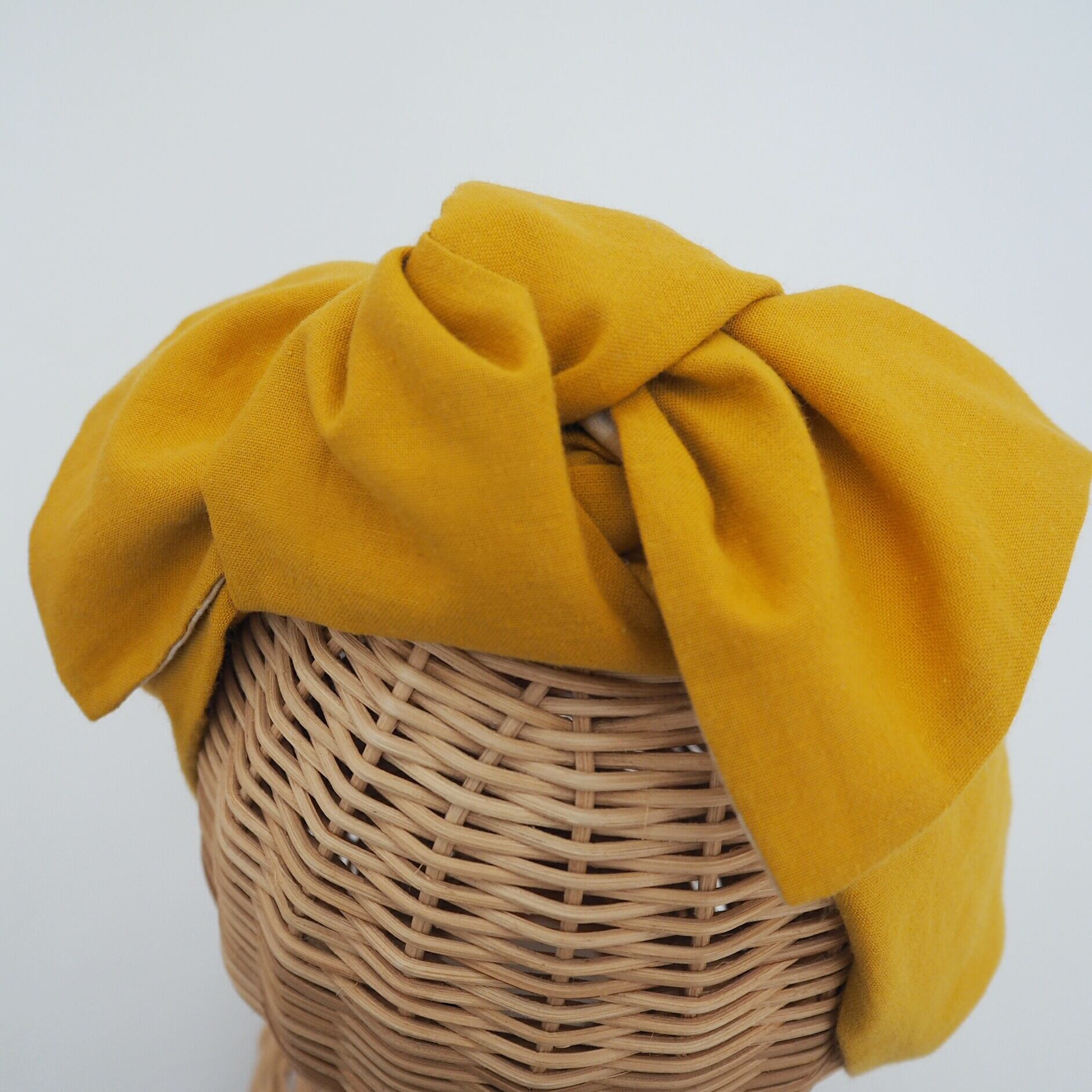マスタードイエローの綿素材を使用した、結び目の様な二本使いのヘアバンドに取り外し出来るベージュのギンガムチェックリボンを付けました。