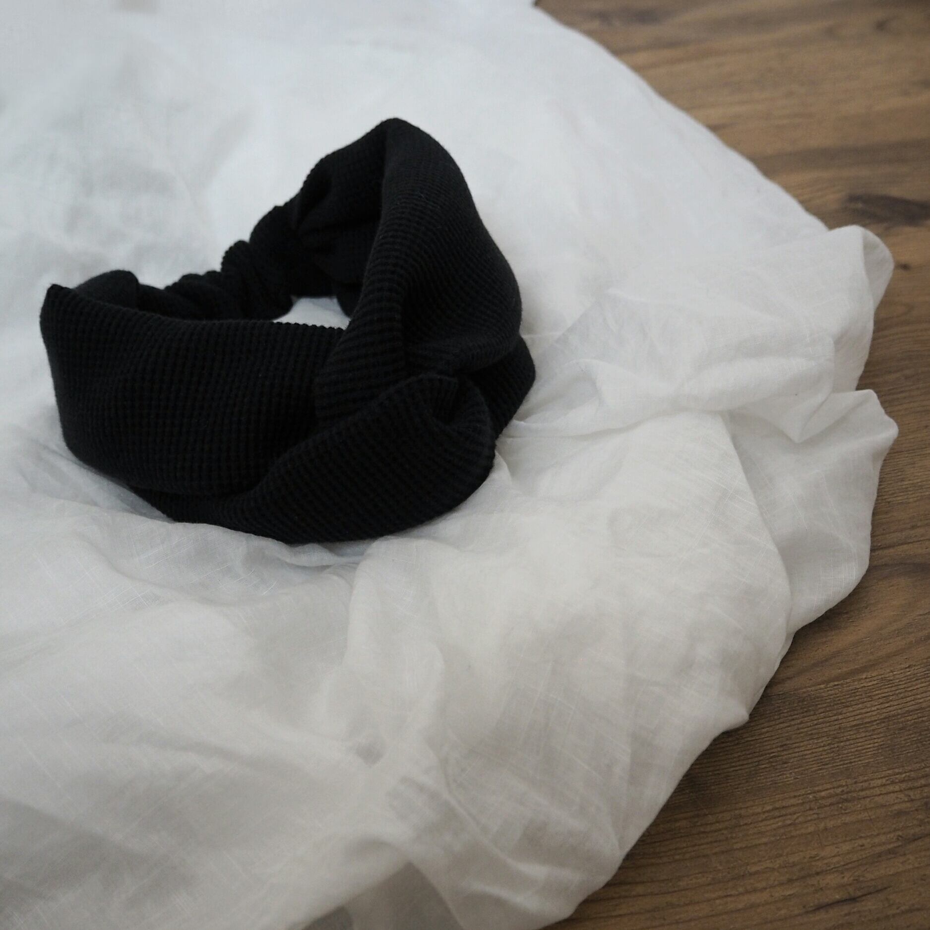 肌触りの良いワッフルニットを使用した結び目の様なデザインの二本使いのヘアバンドです。