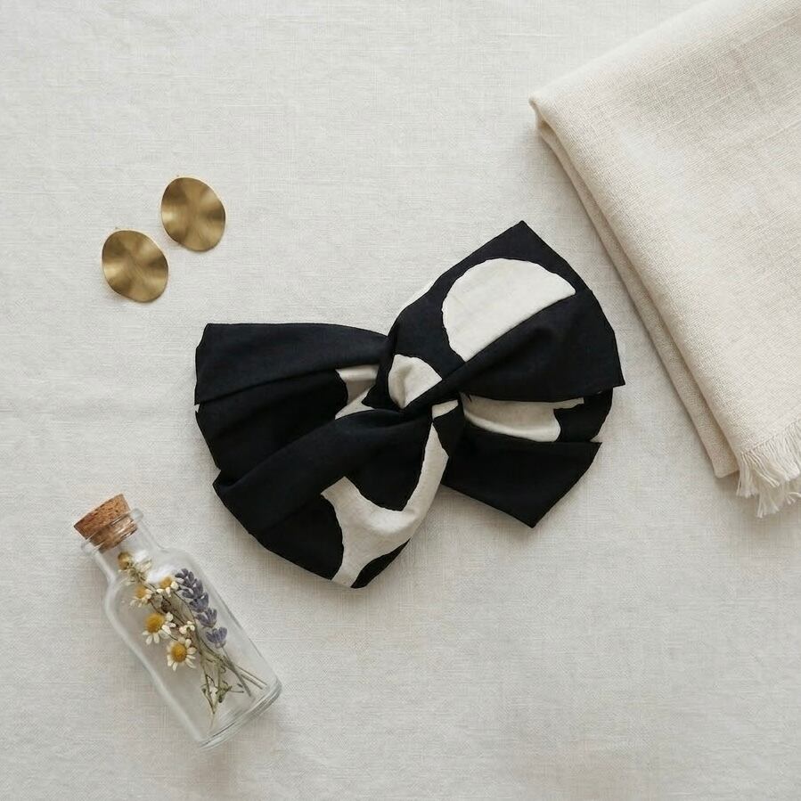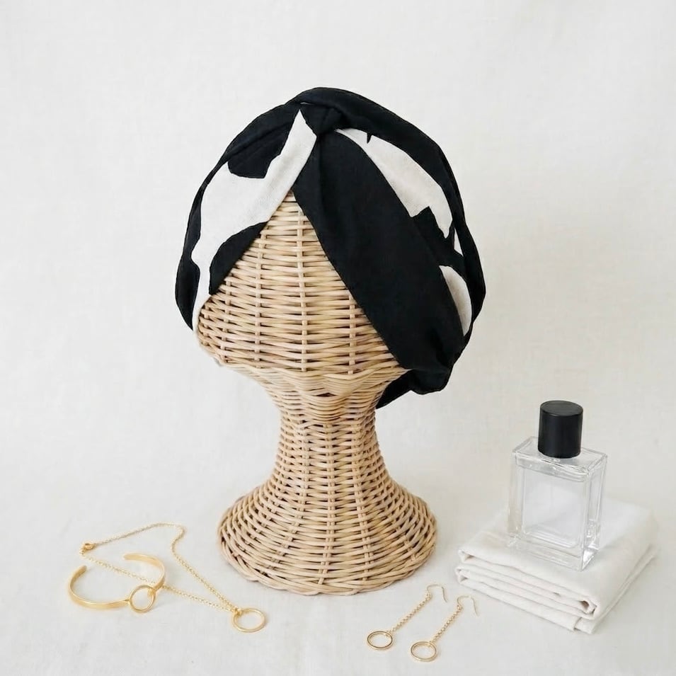ドットのような、ちょっと変形した蓮の葉にも似た模様が目を引く綿麻生地とシンプルな黒の綿生地を切り替えて組み合わせた結び目の様な二本使いのヘアバンドです。